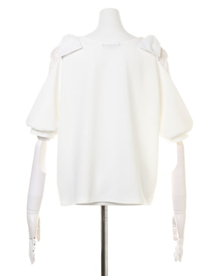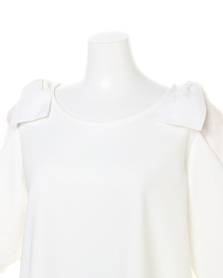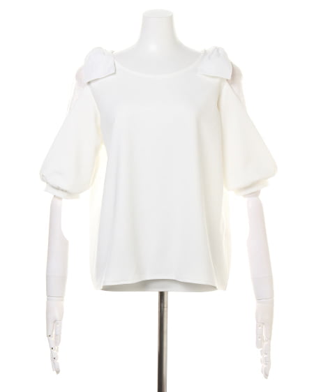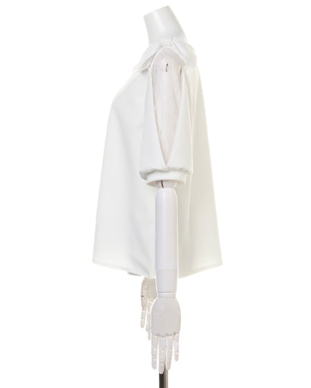 ボリュームのある袖がアクセントになったプルオーバー。袖部分にレースを組み合わせることでフェミニンな雰囲気に。ショルダー部分にはリボンをあしらってキュートさをプラス。ベーシックなワンカラーもデザインで魅せる1枚に仕上げています。シャリ感のある梨地で仕立てているのでさらりとした着心地。ボリュームのあるアイテムなのでボトムはすっきりまとめるのがコーデのコツ。