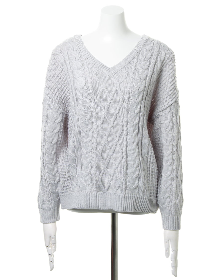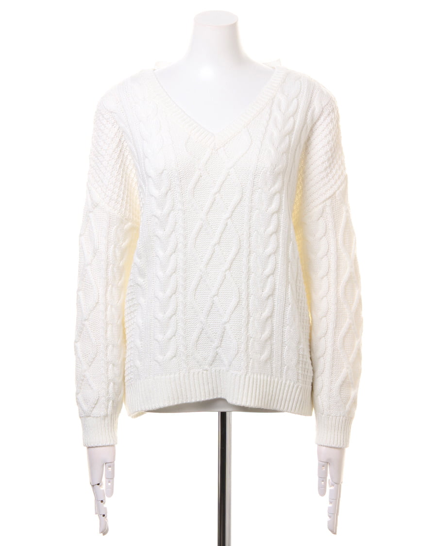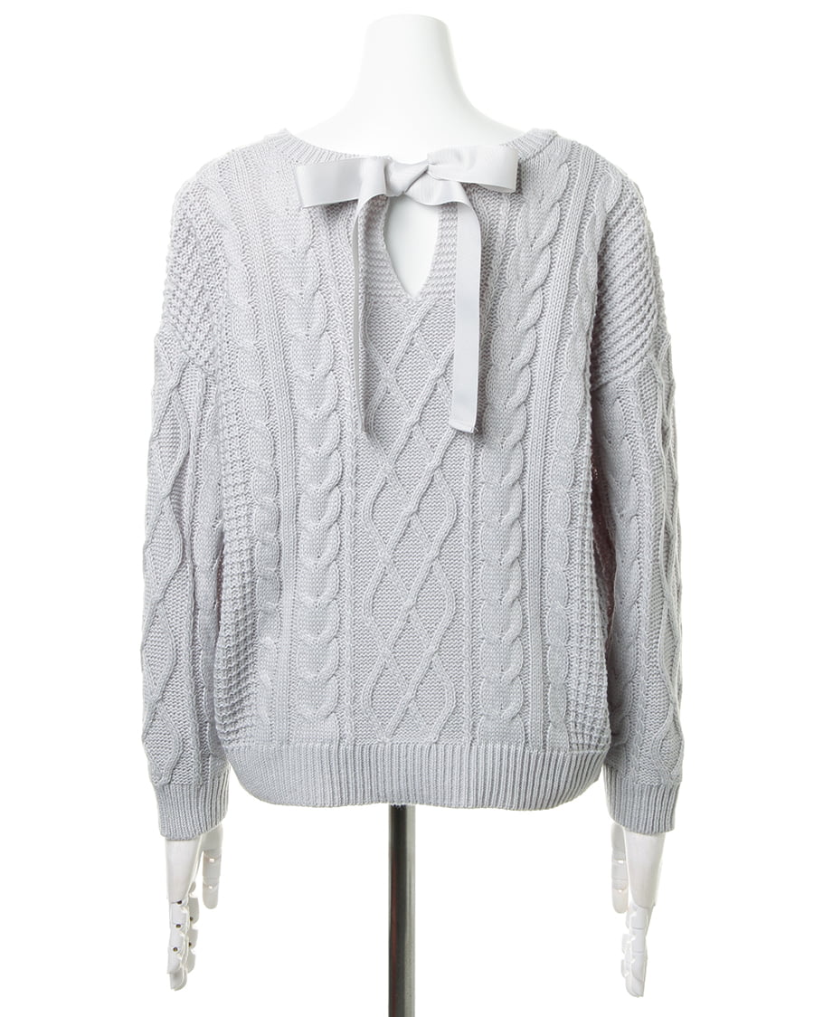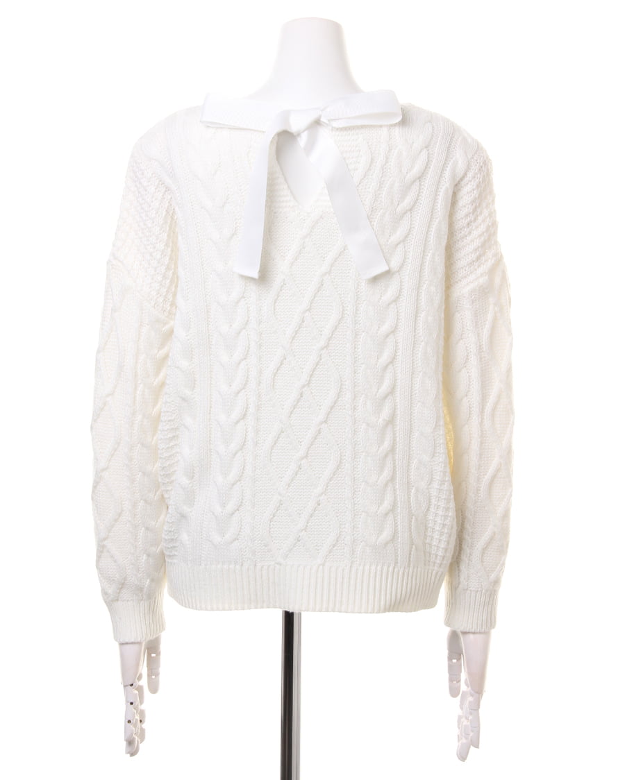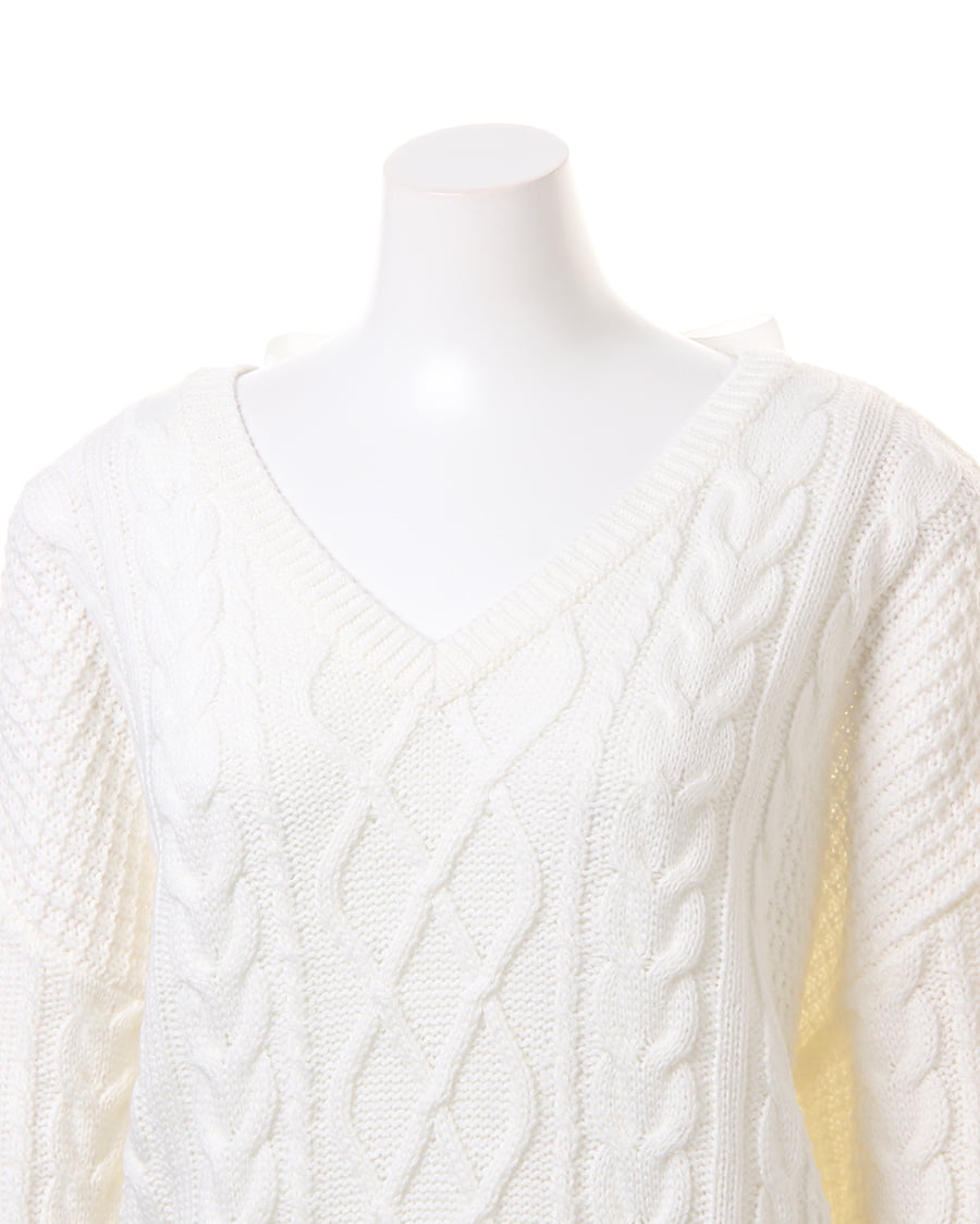 立体的なケーブル編みが、優しい風合いを演出するケーブルニット。前後のネックラインをVカットにしたことで、大人っぽい印象に。デコルテラインを、きれいに見せてくれる効果も魅力的。後姿もきまる、リボン付きでガーリーな雰囲気をあおります。コンパクトに設定された丈は、どんなボトムスとも好バランスなスタイルを実現します。