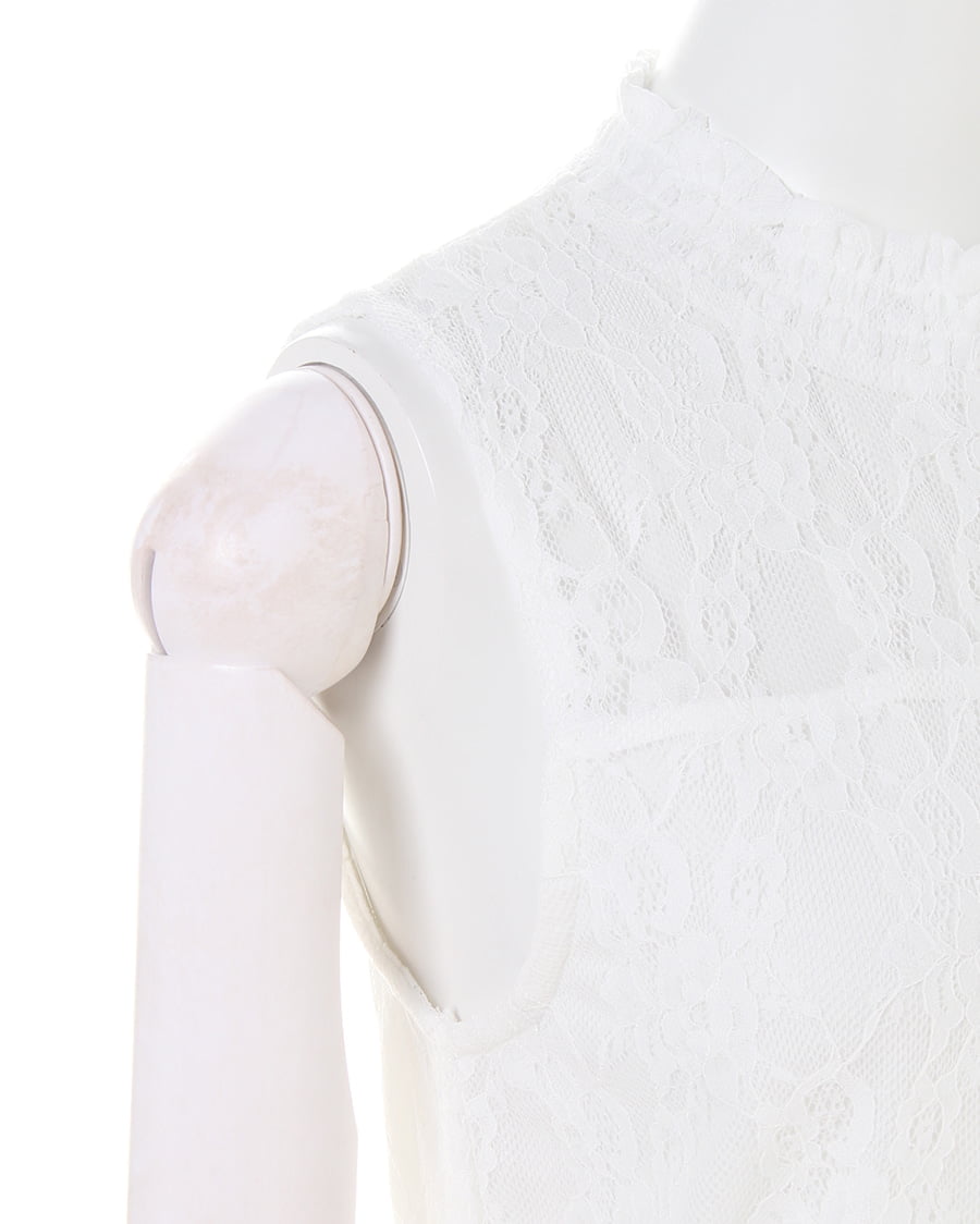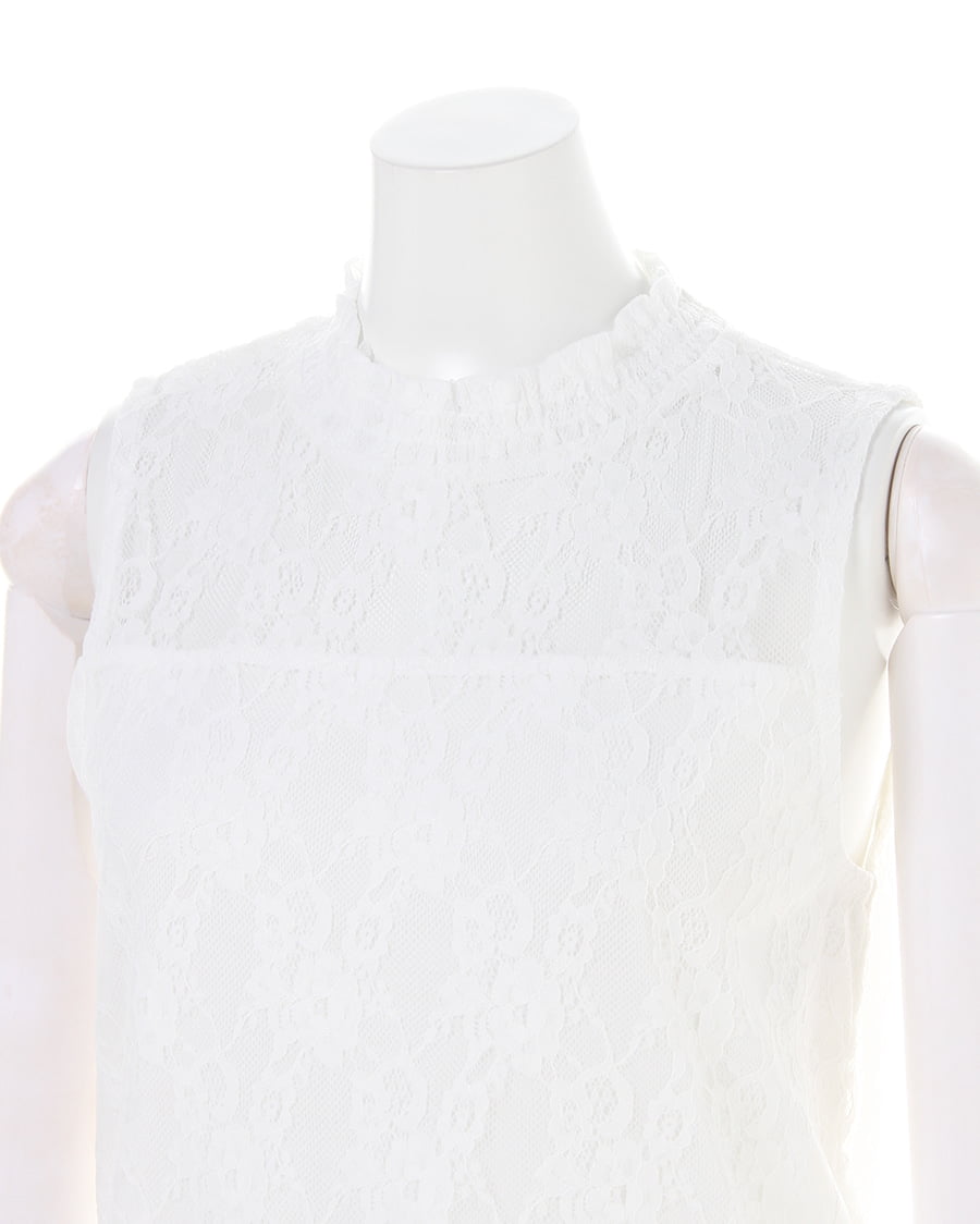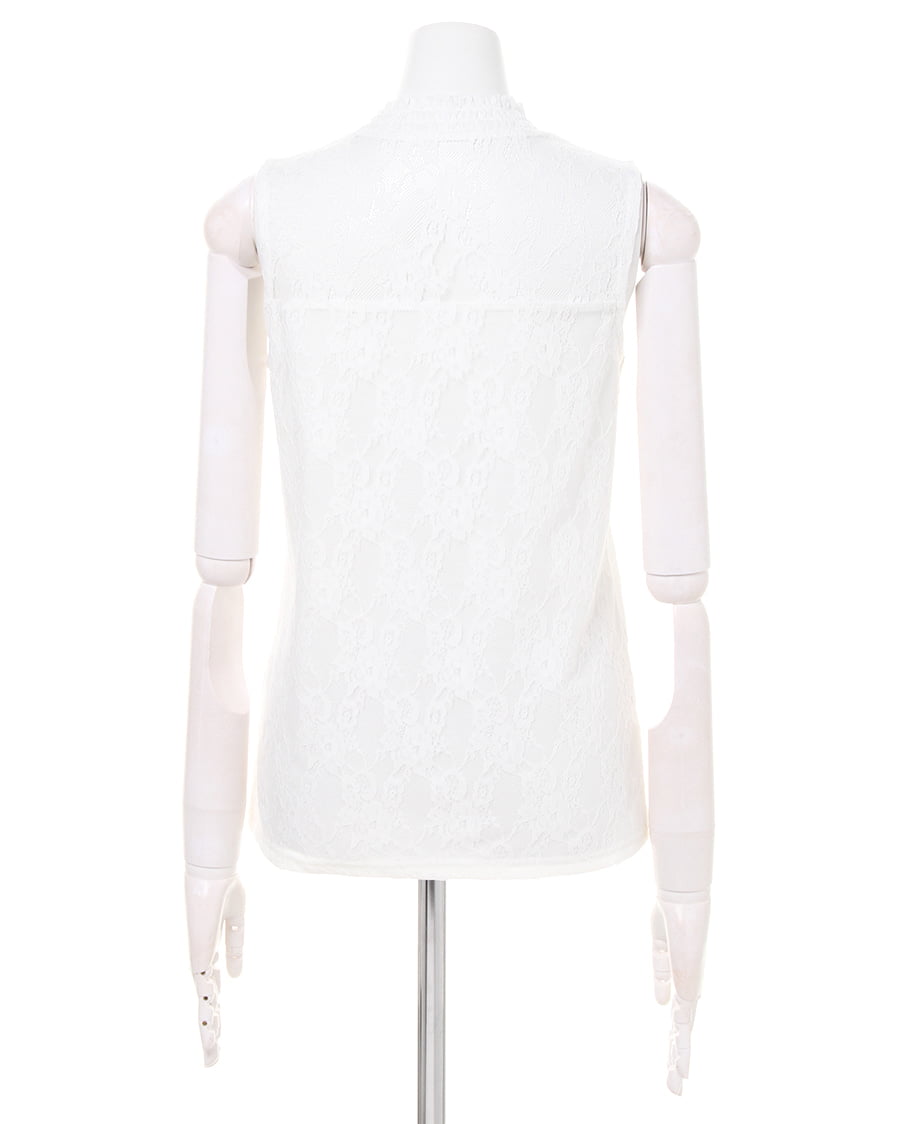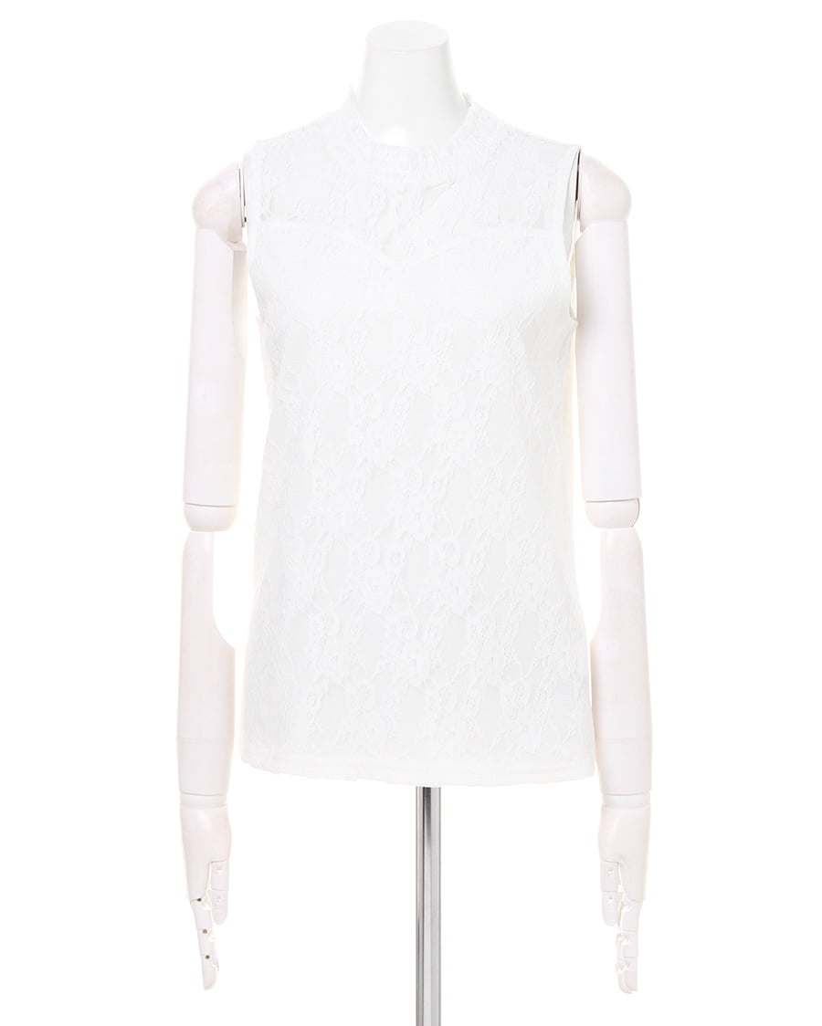 総レース使いが大人エレガントなノースリーブトップス。デコルテの前後のレースが女性らしい肌見せを演出。身頃部分には裏地をつけているのでメリハリのある印象に仕上がってます。クラシカルなハイネックデザインはスウェットや薄手のニットのインナーにすればすぐにでも投入できます。1枚で着るときはインナーのベアトップの色合わせを楽しむのもおススメです。