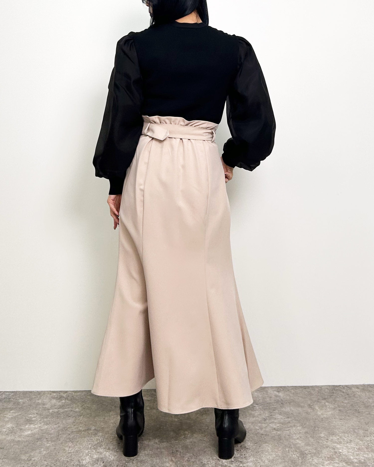 ボディ部分は伸縮性のあるリブニットが体に程よく沿い、メリハリのあるシルエットを作ります。