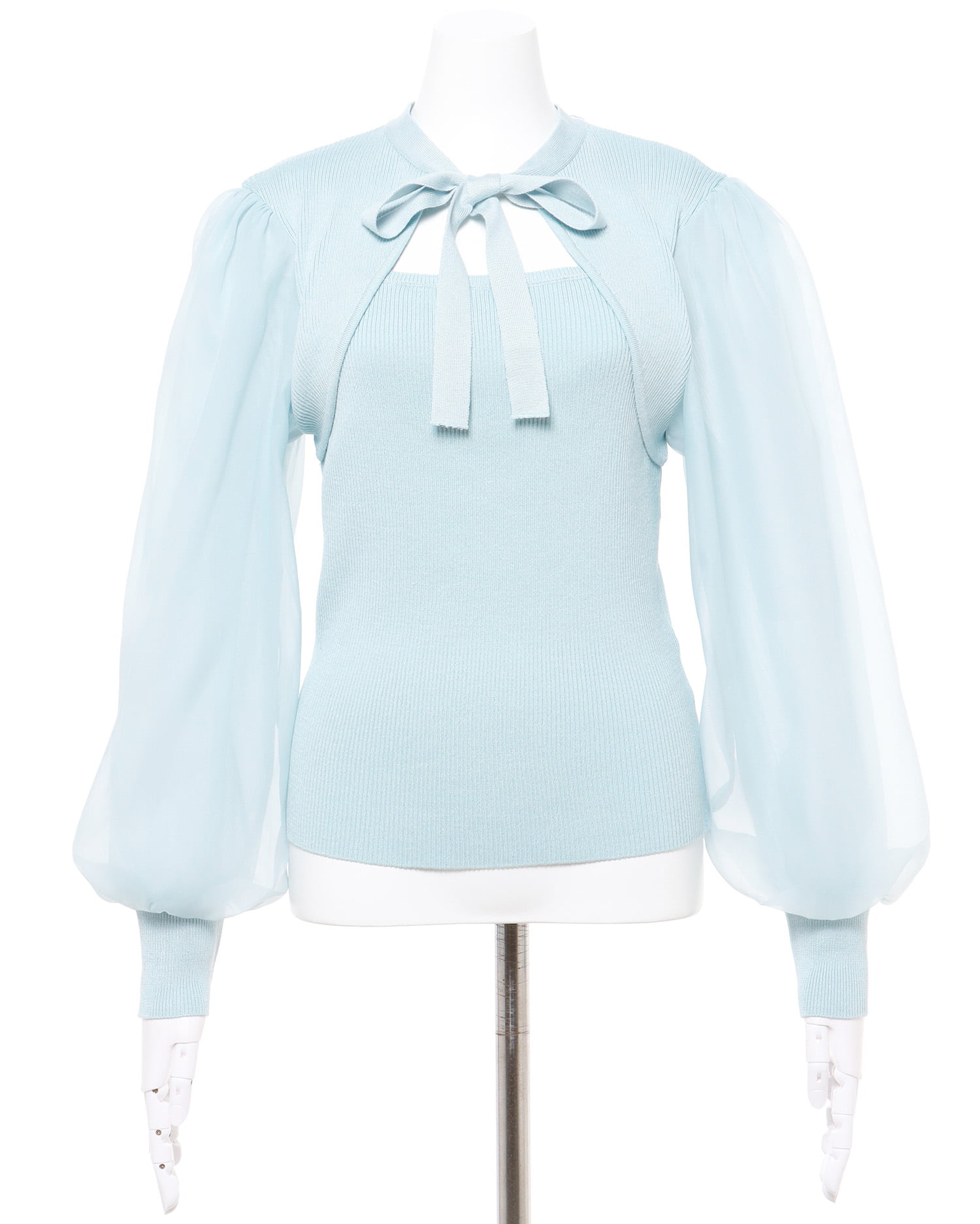 透け感のあるシアー素材で切り替えたボリュームスリーブが印象的なニット。