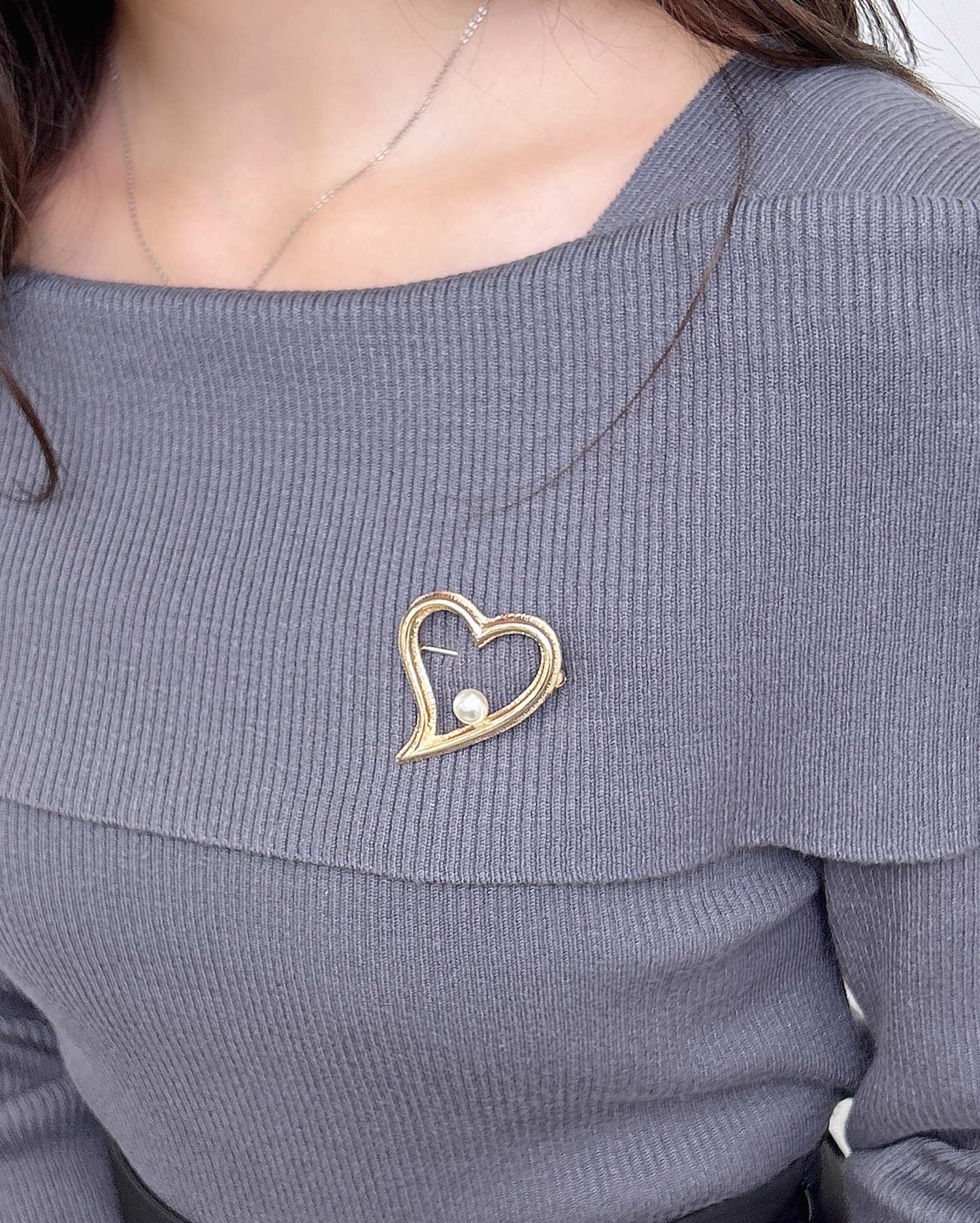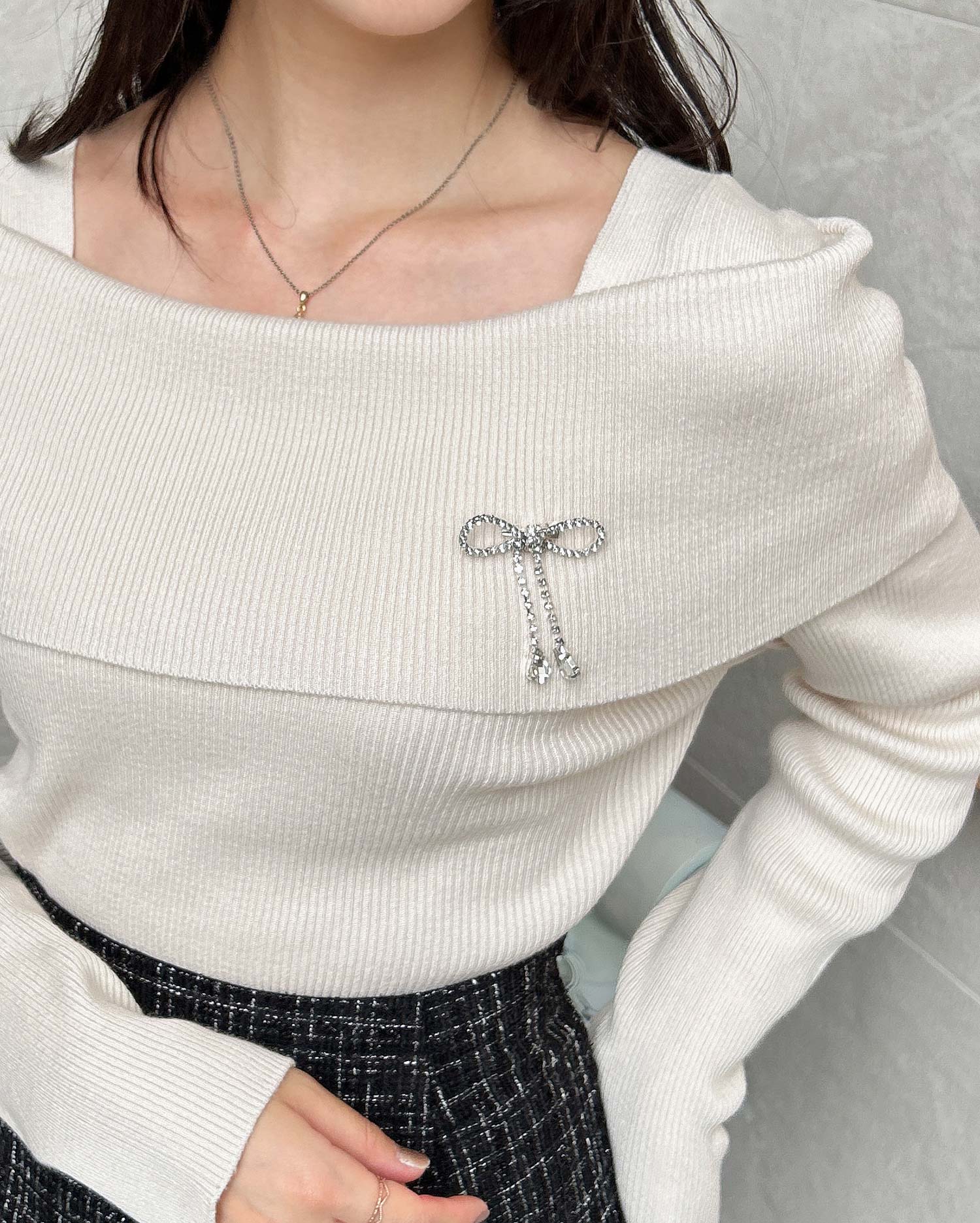 周りの目を惹くこと間違いなしの上品でフェミニンなオフショルニット。