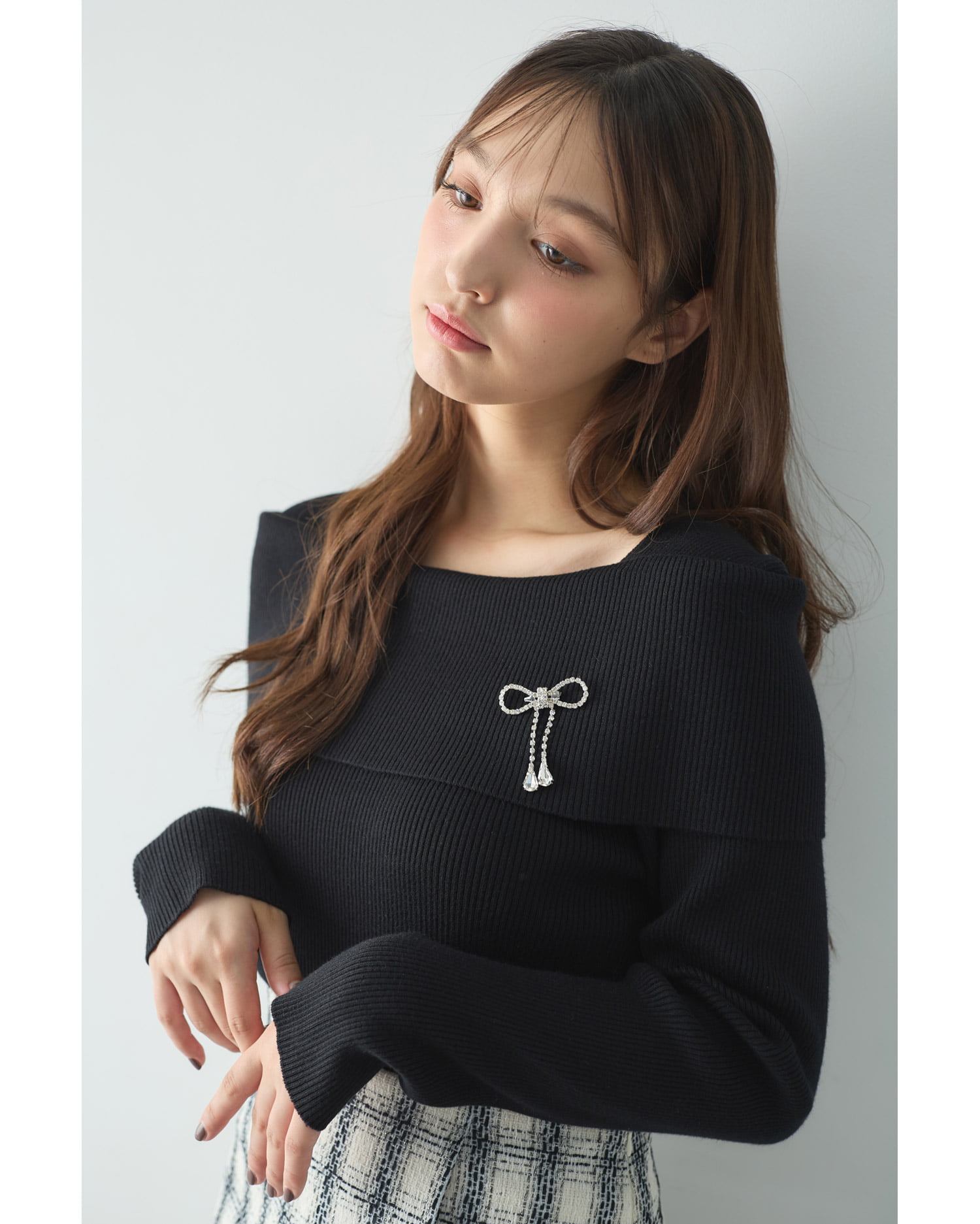 • INGNI(イング) ブローチ付オフショルニット/A クロ/A