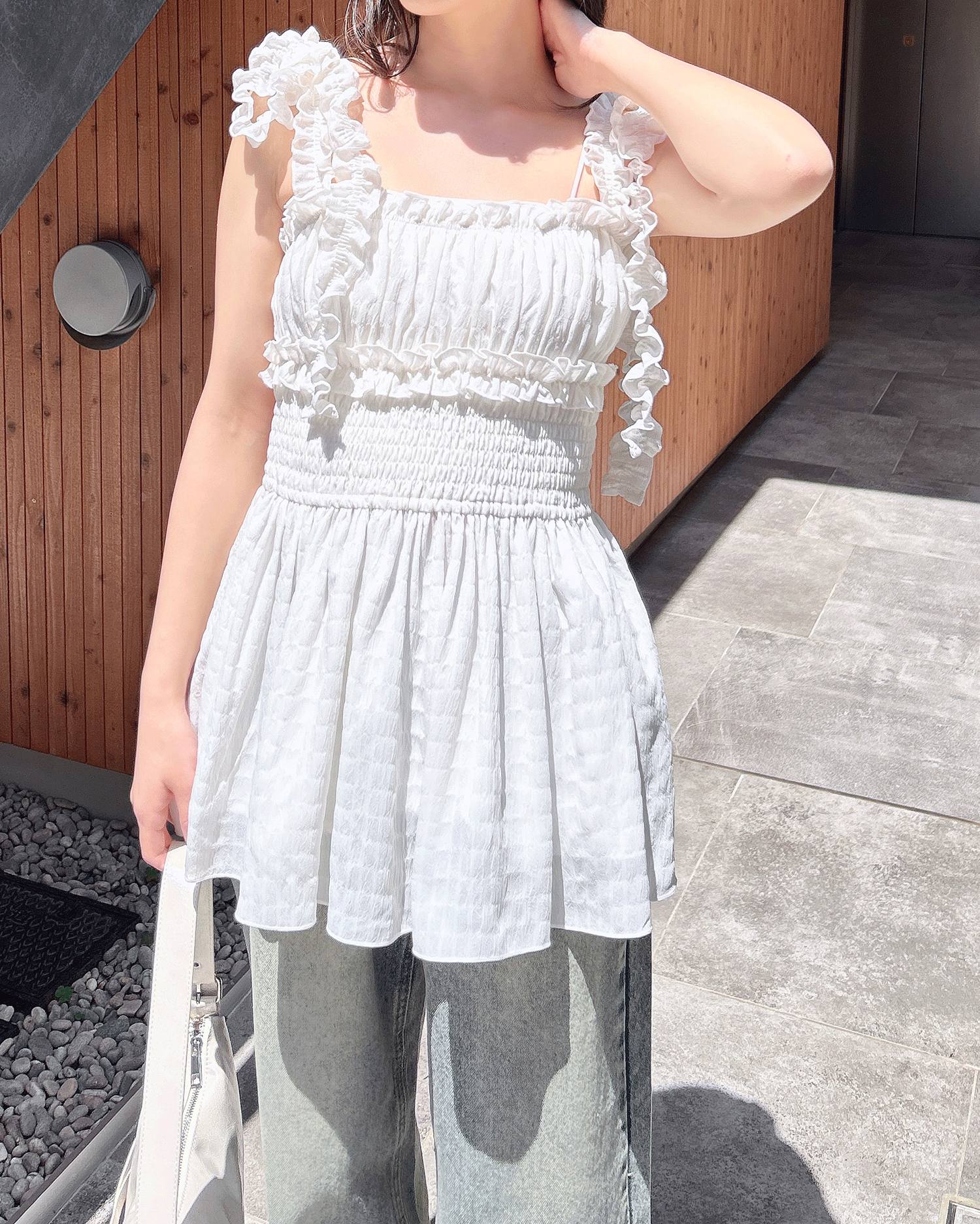 【ショルダーの華やかなフリルが目を惹くミニキャミワンピ】