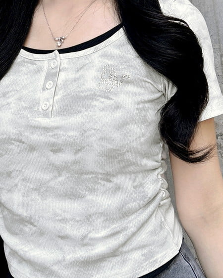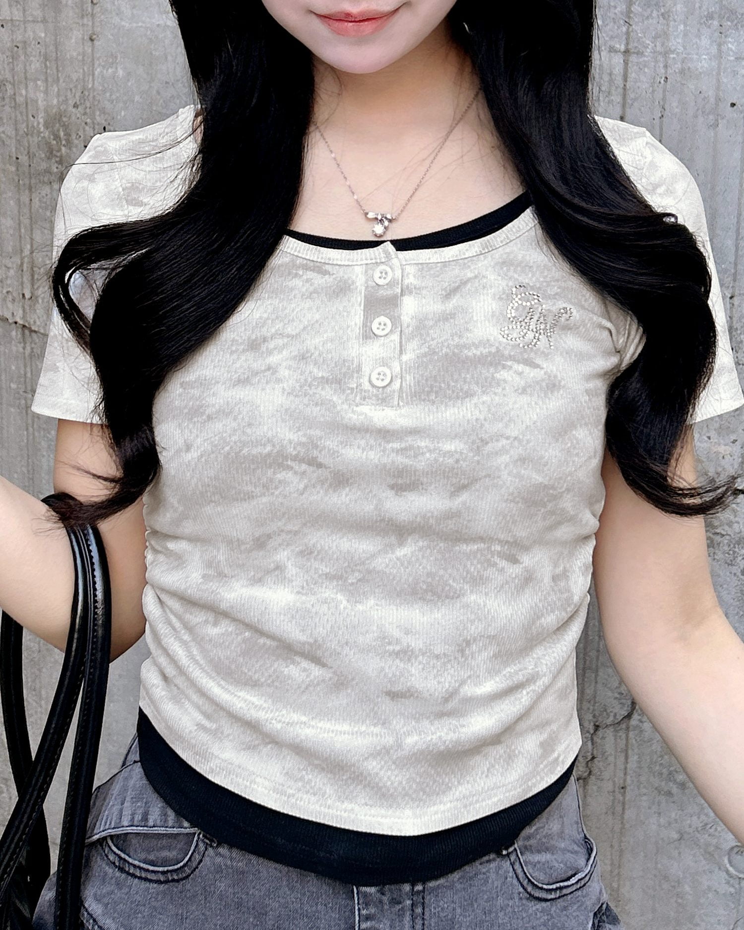 胸元にはラインストーンロゴをあしらってキラキラのアクセントに。