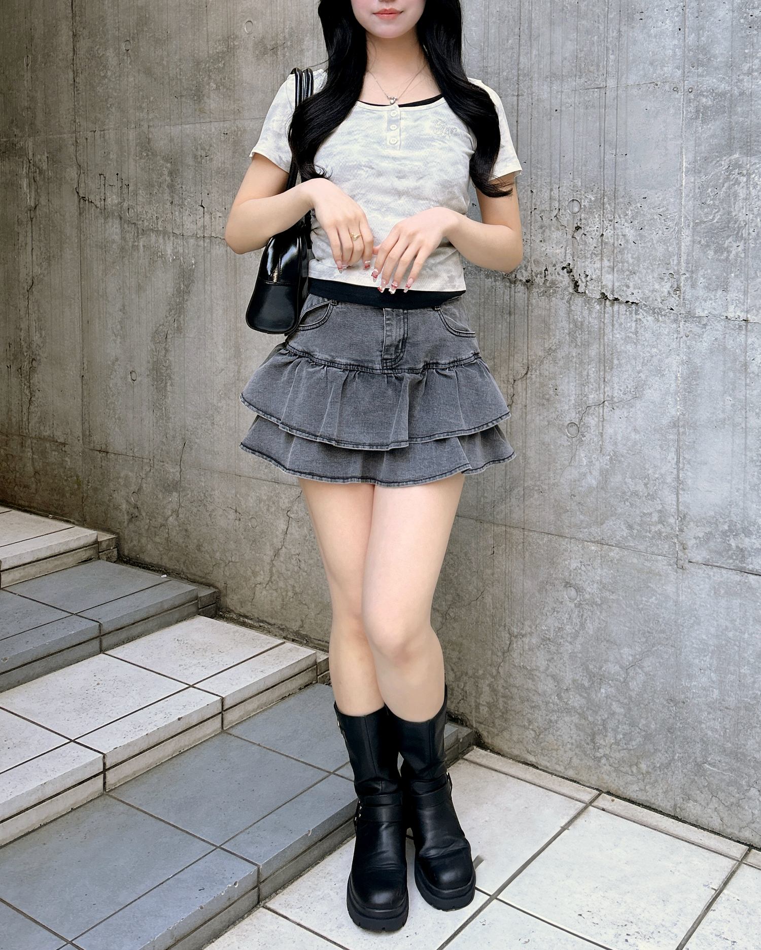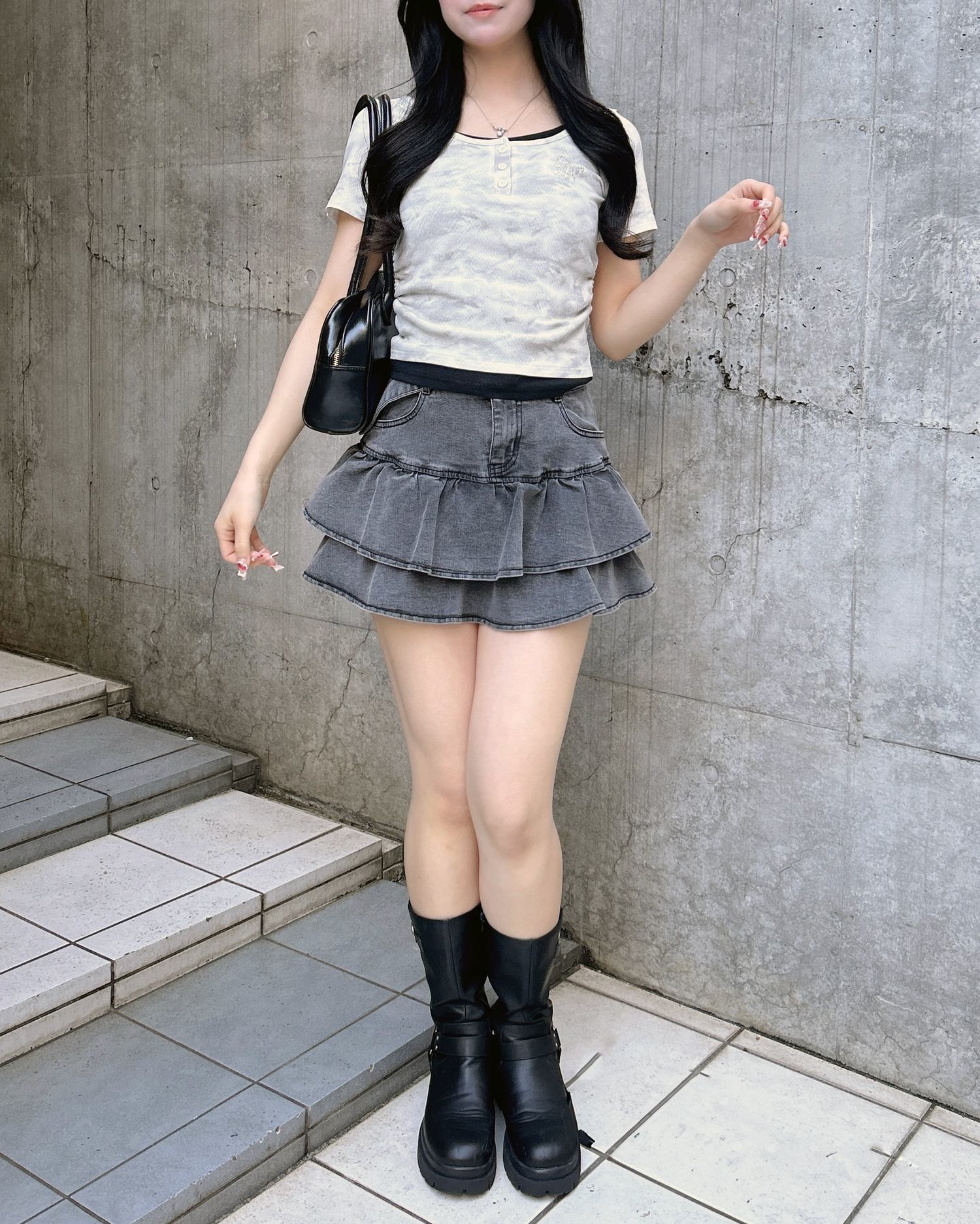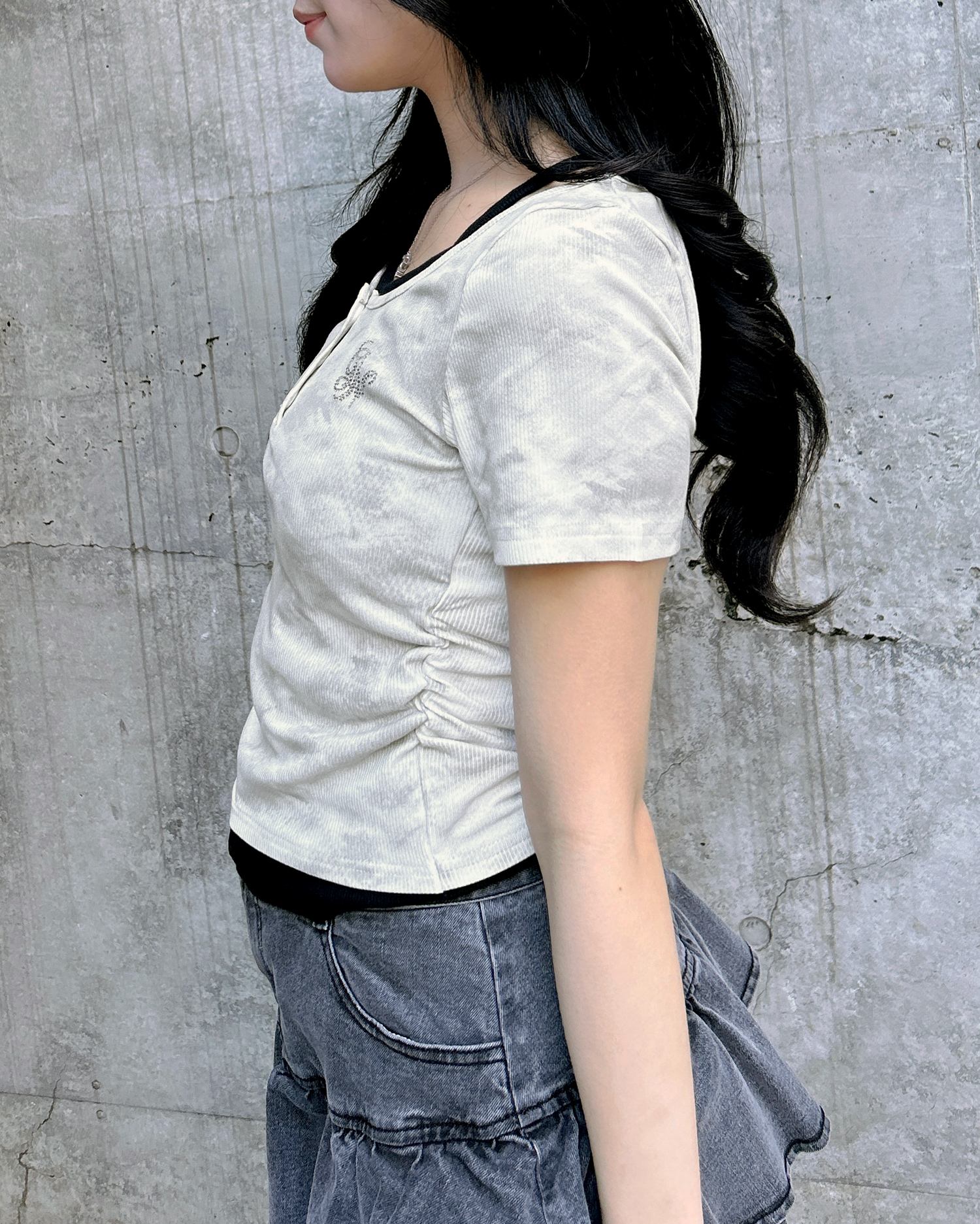 広めに開いたネックラインが顔周りをすっきり見せてくれます。