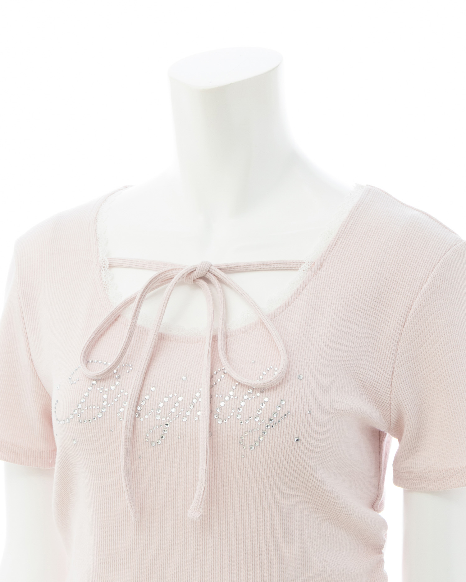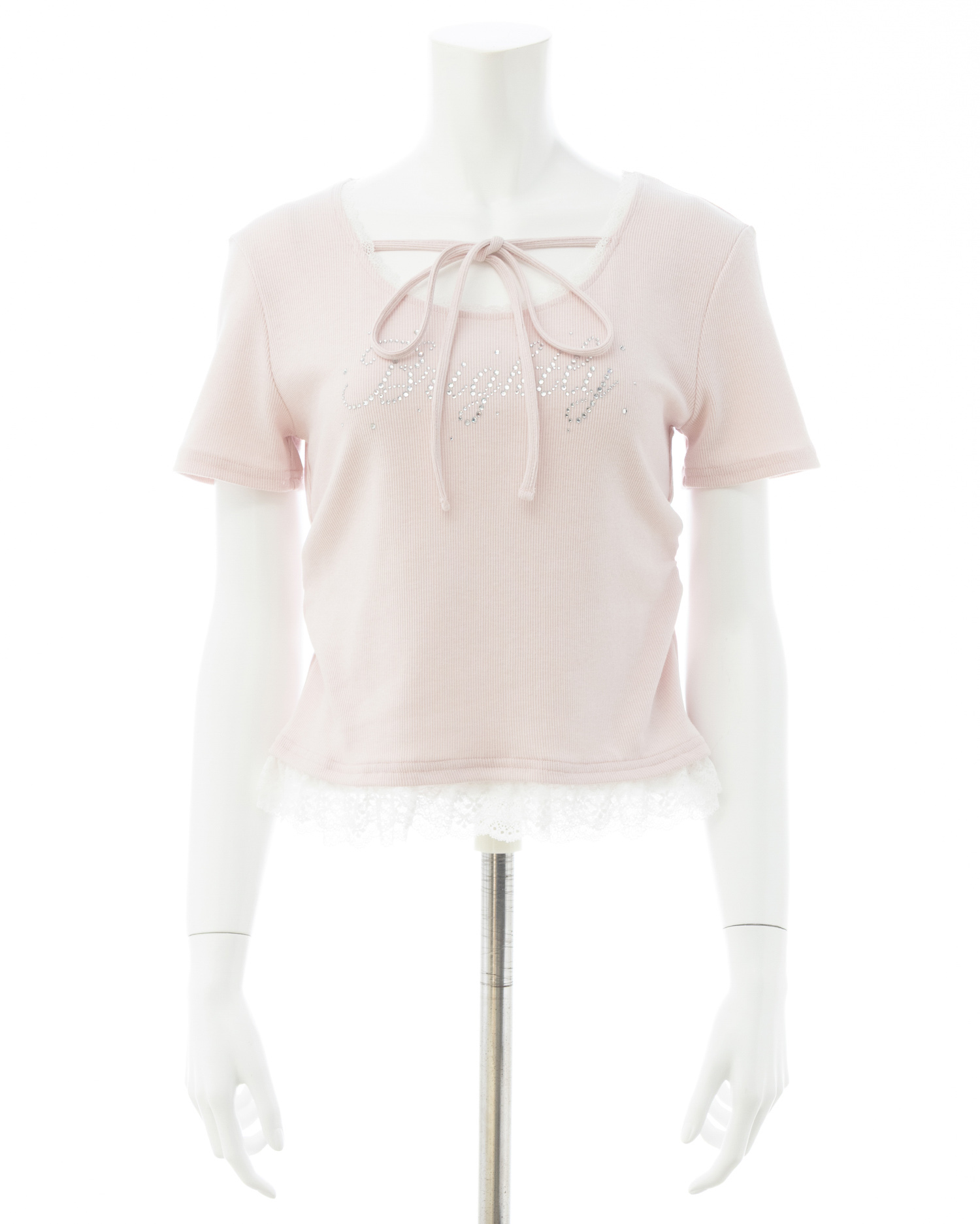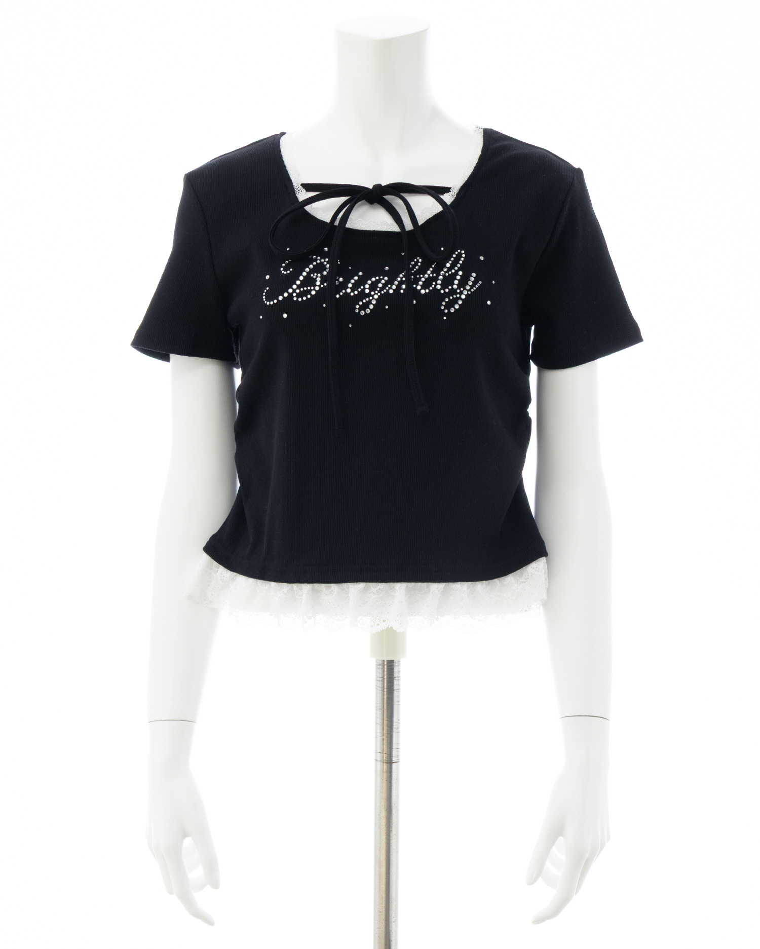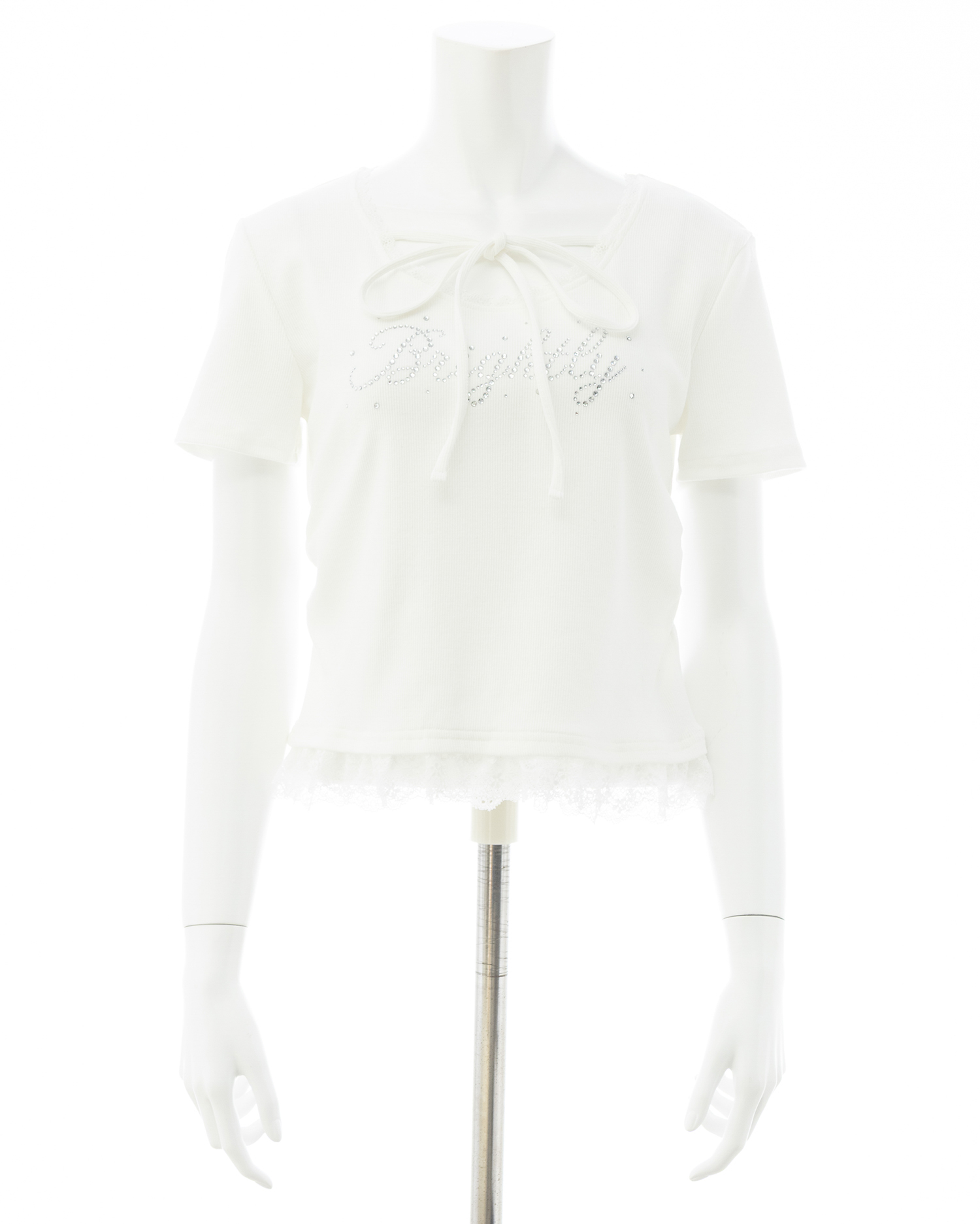 1261-100256 リボン付レース出しラインストーンロゴトップス