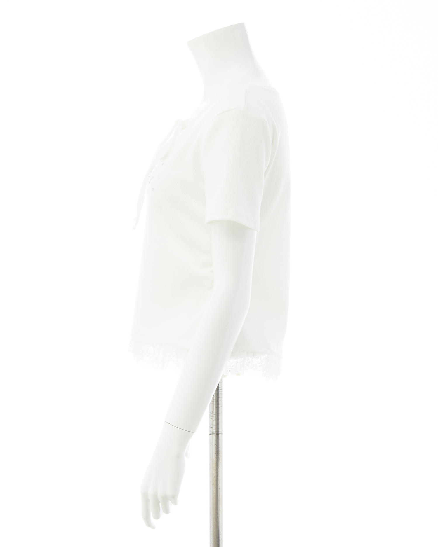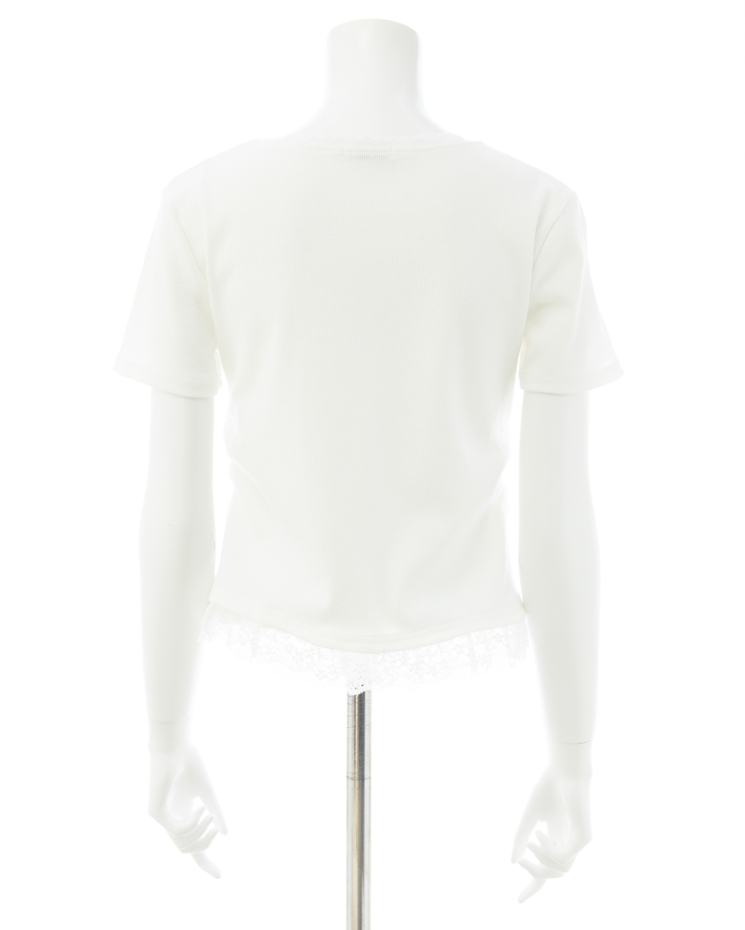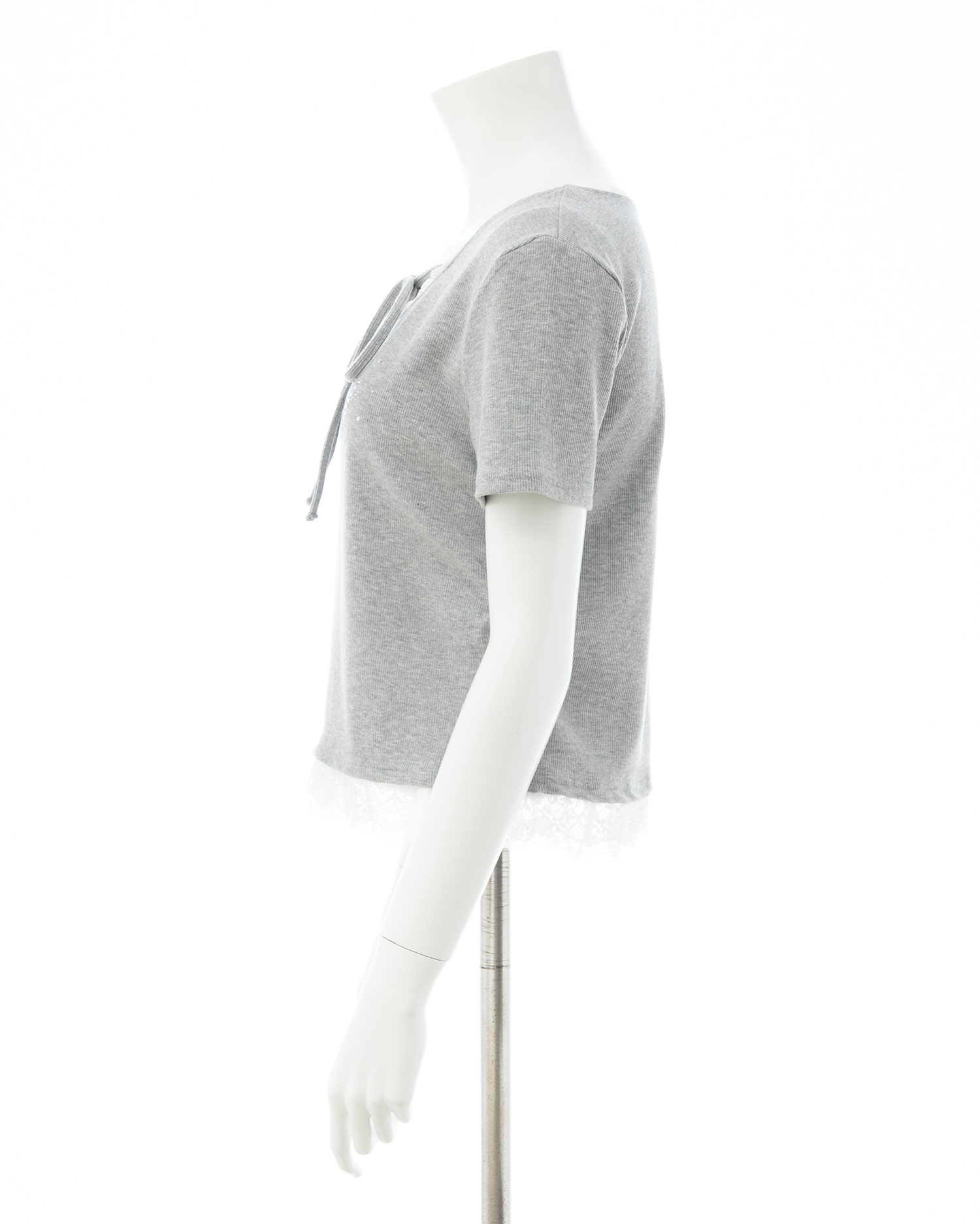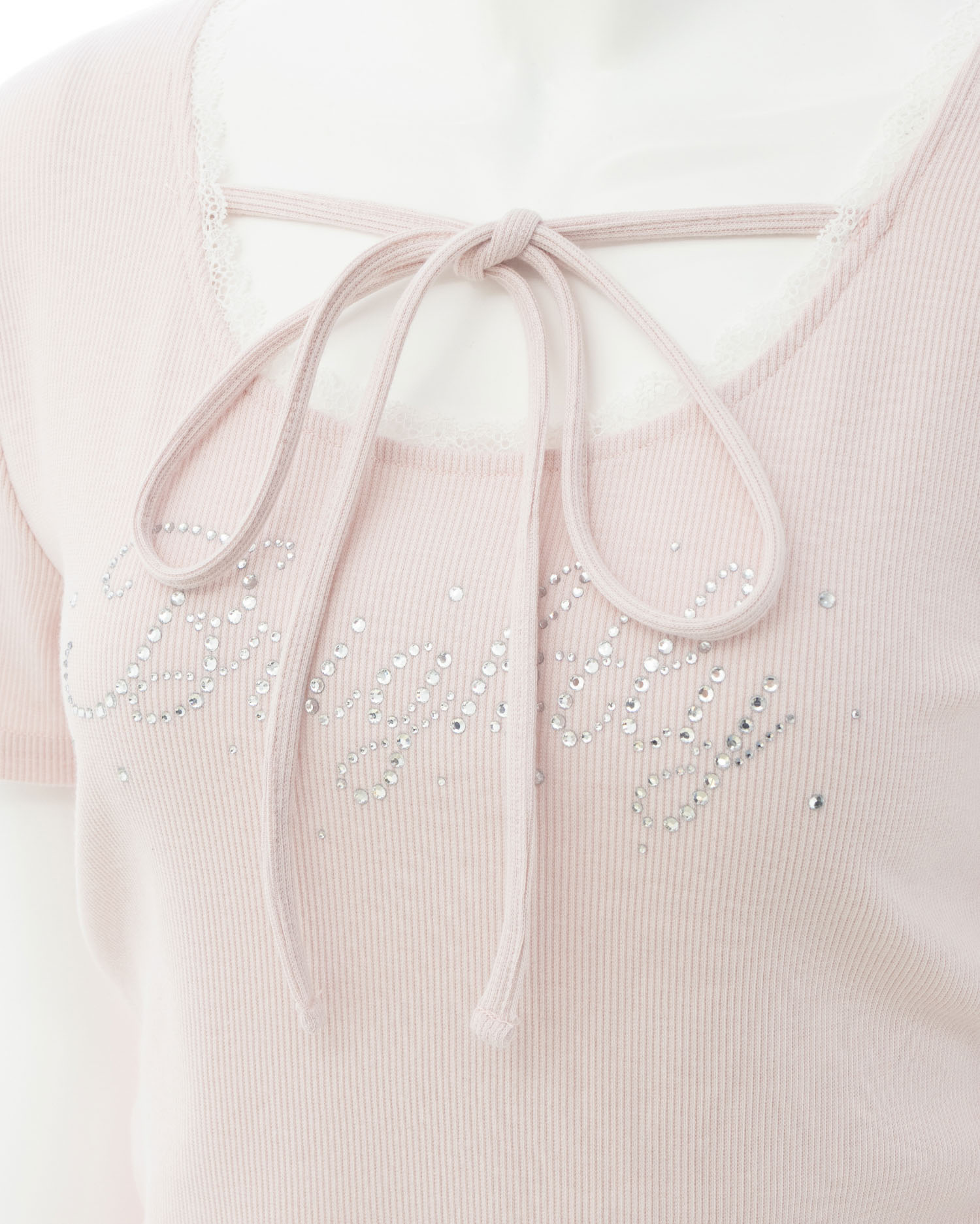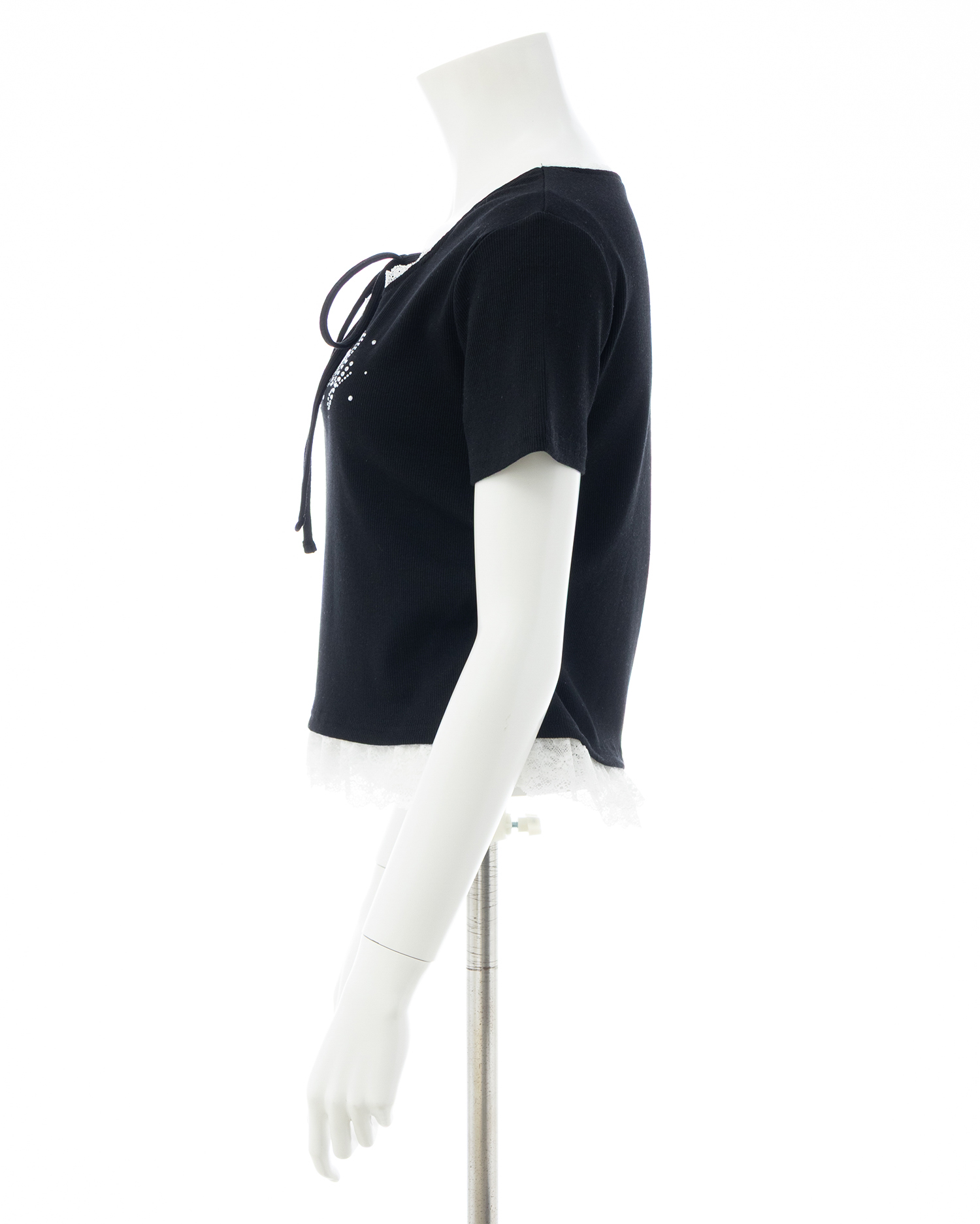 1261-100256 リボン付レース出しラインストーンロゴトップス