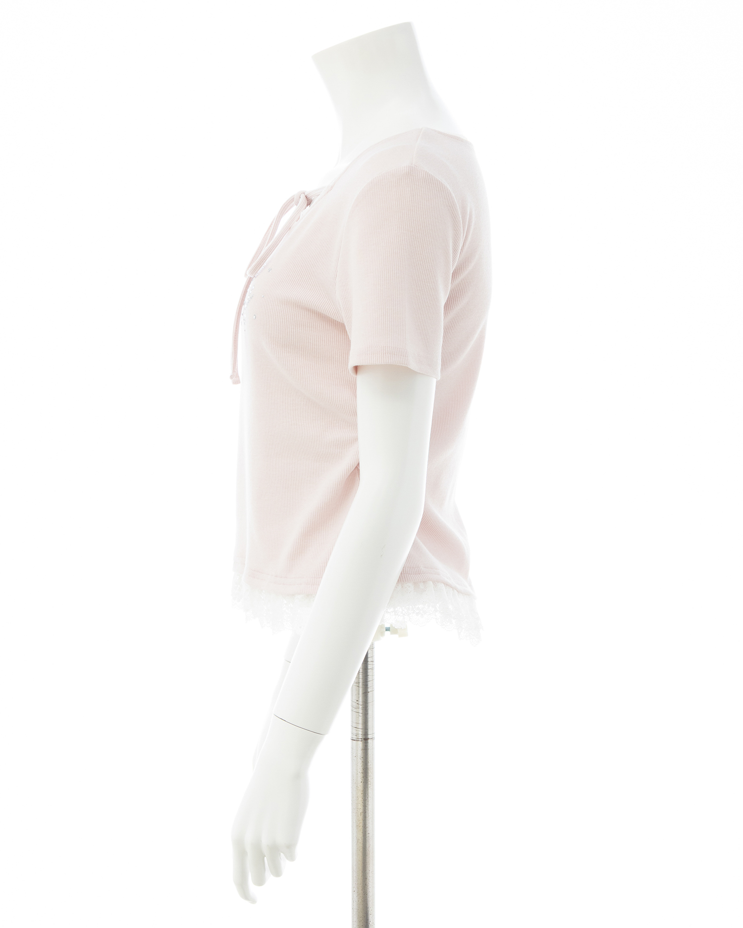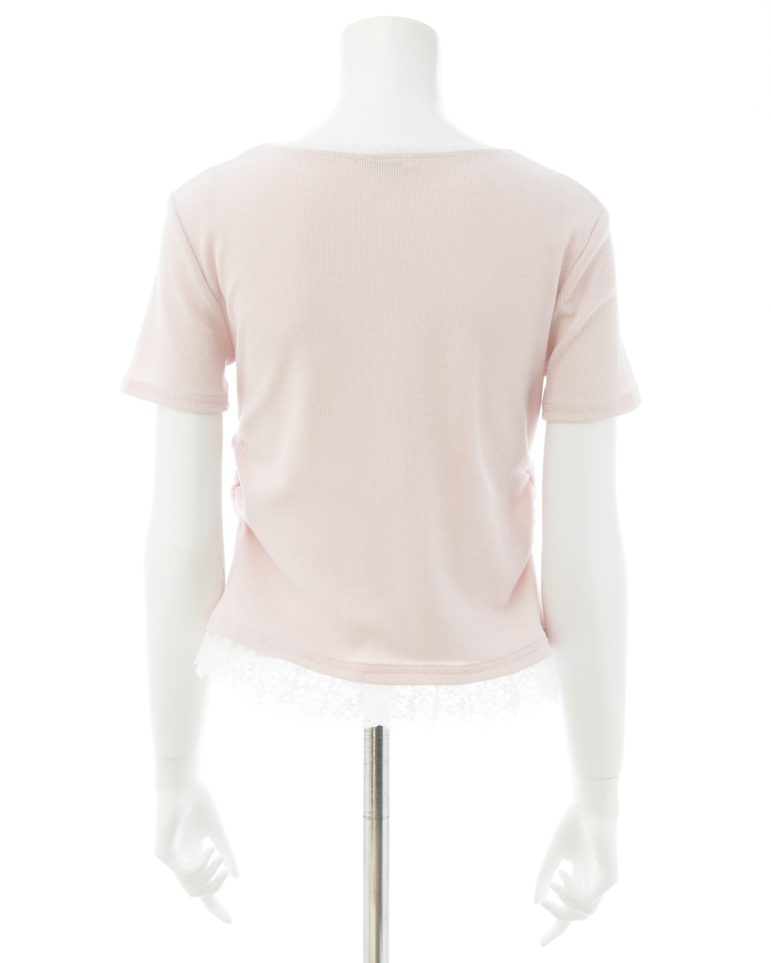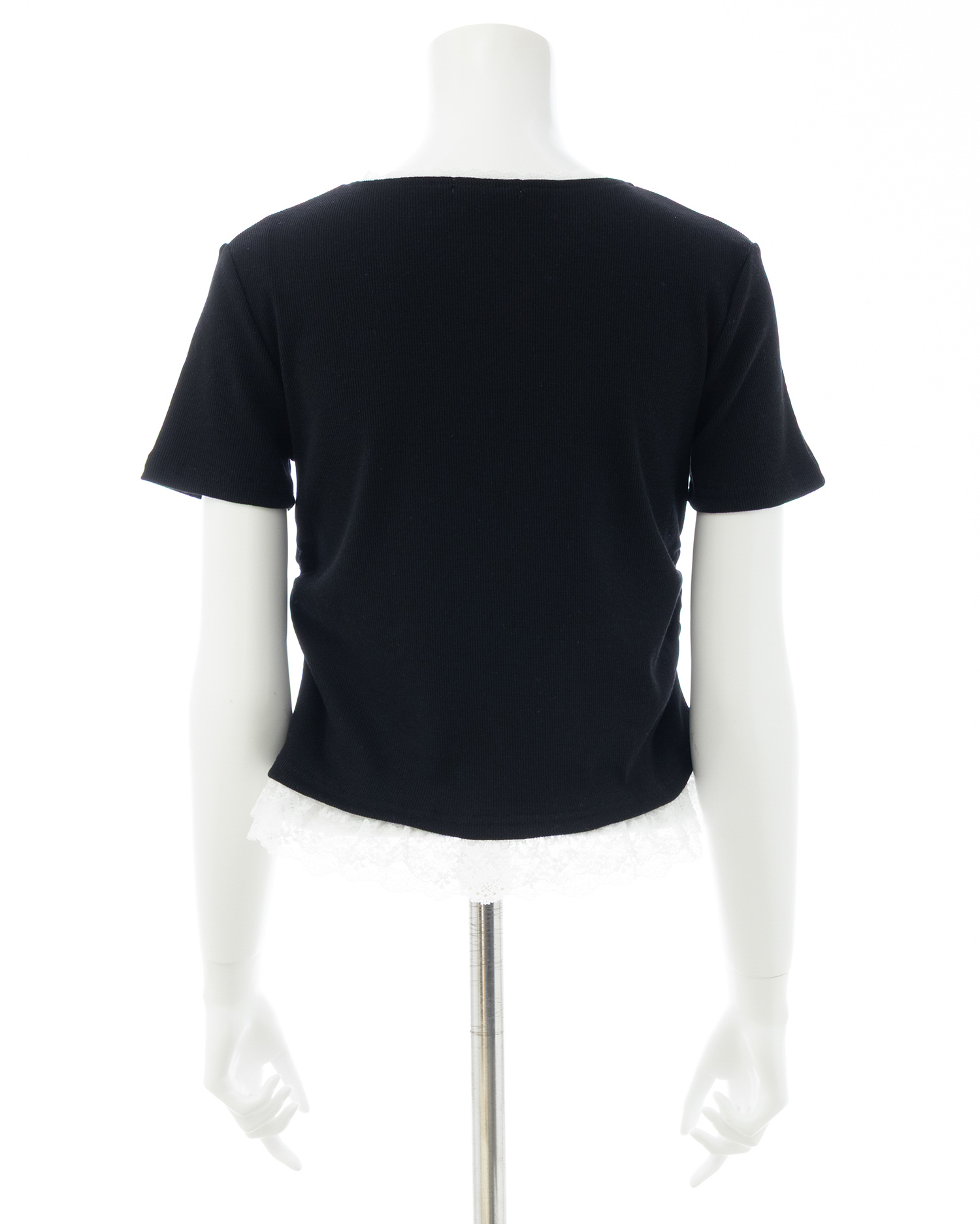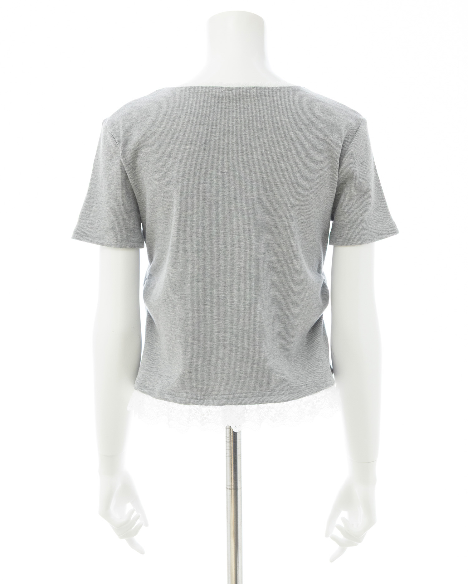 1261-100256 リボン付レース出しラインストーンロゴトップス