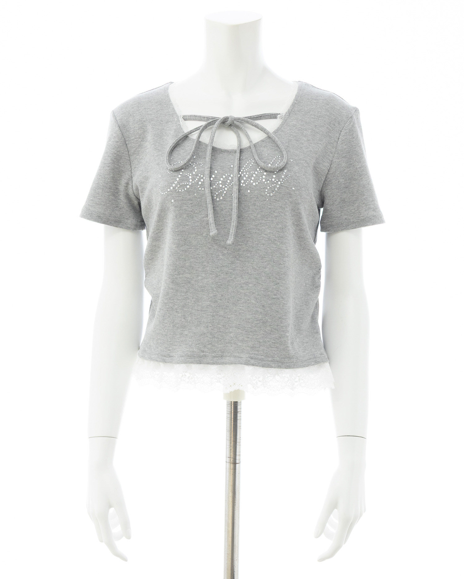 • INGNI(イング) リボン付レース出しラインストーンロゴトップス グレー