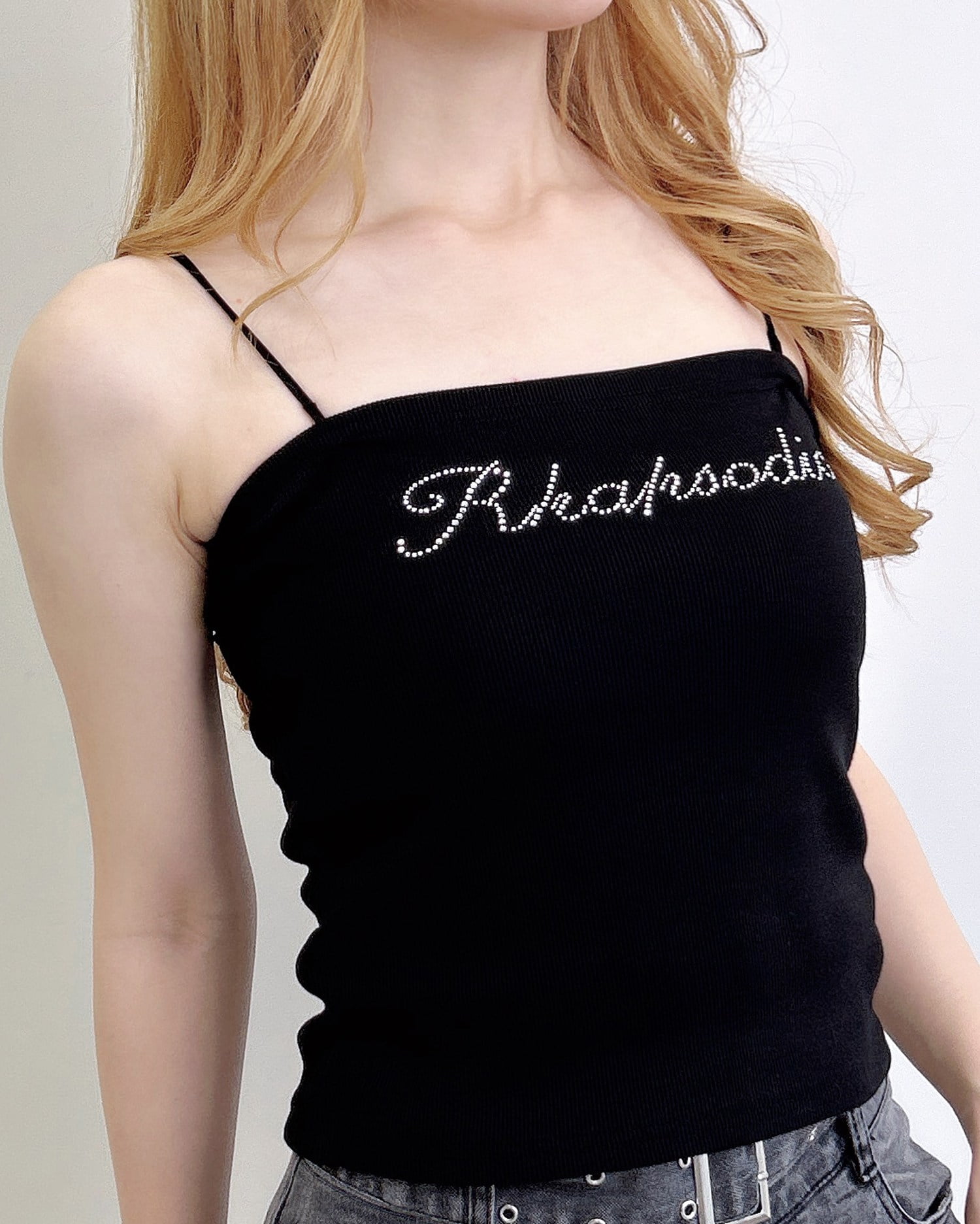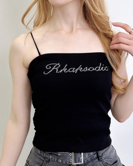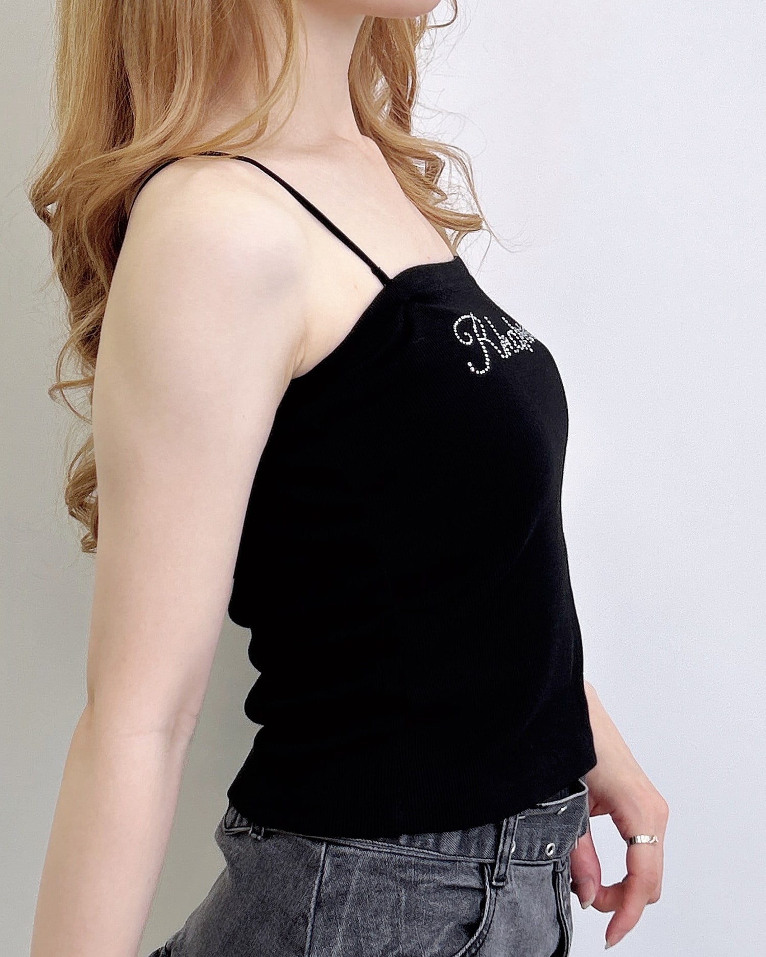 ラインストーンロゴサイドギャザーベアリブキャミ