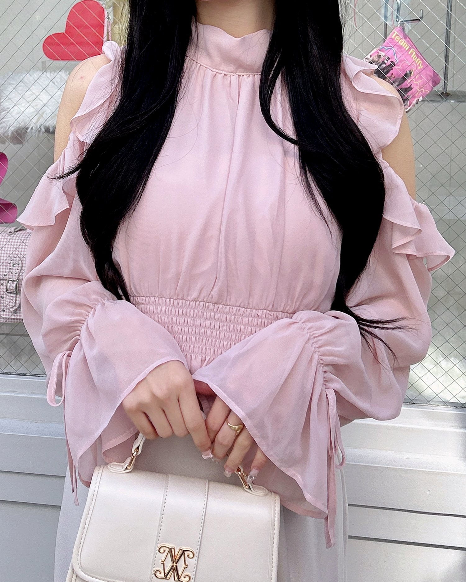 透け感のあるシフォン生地で仕立てたレディなオープンショルダーブラウス。