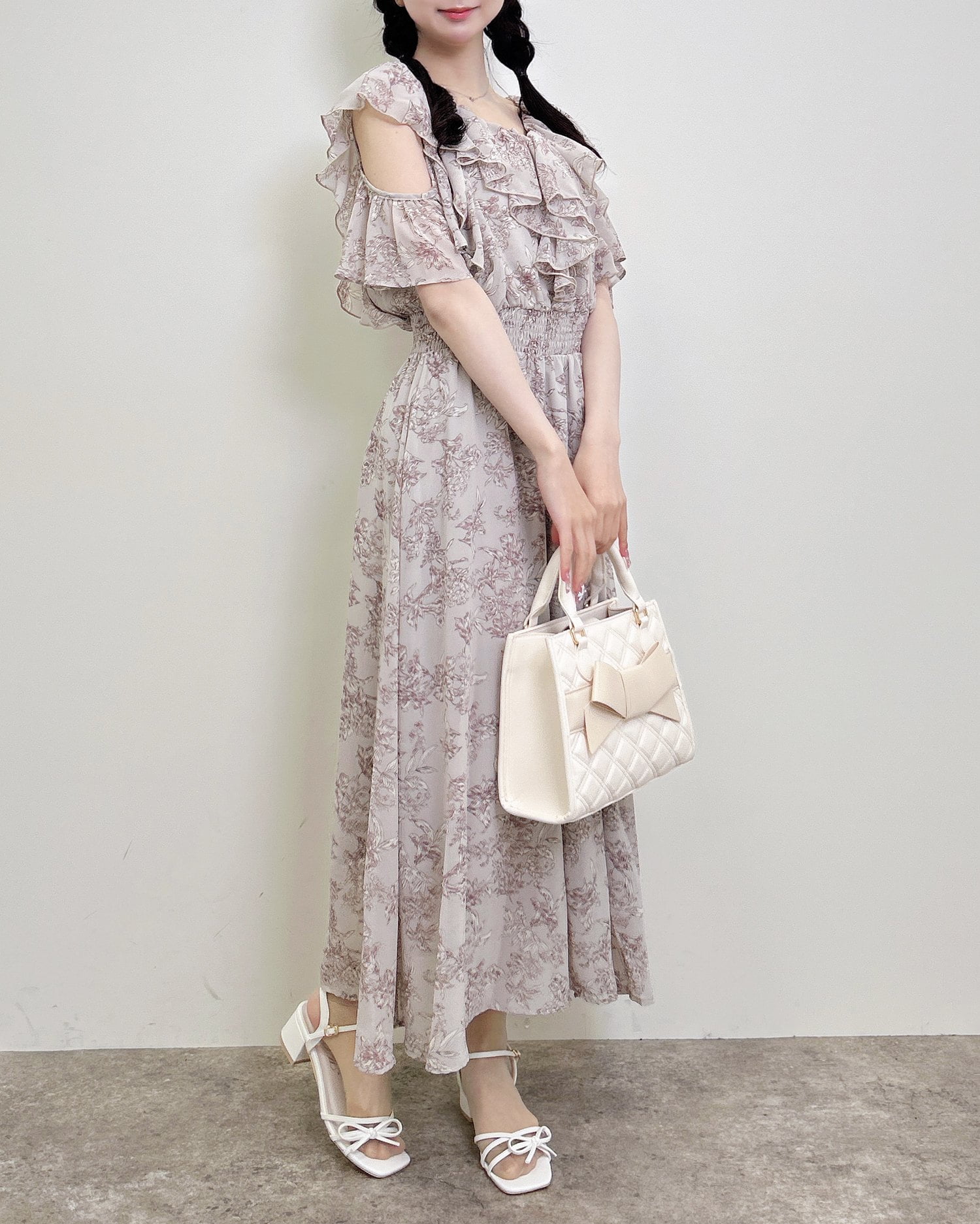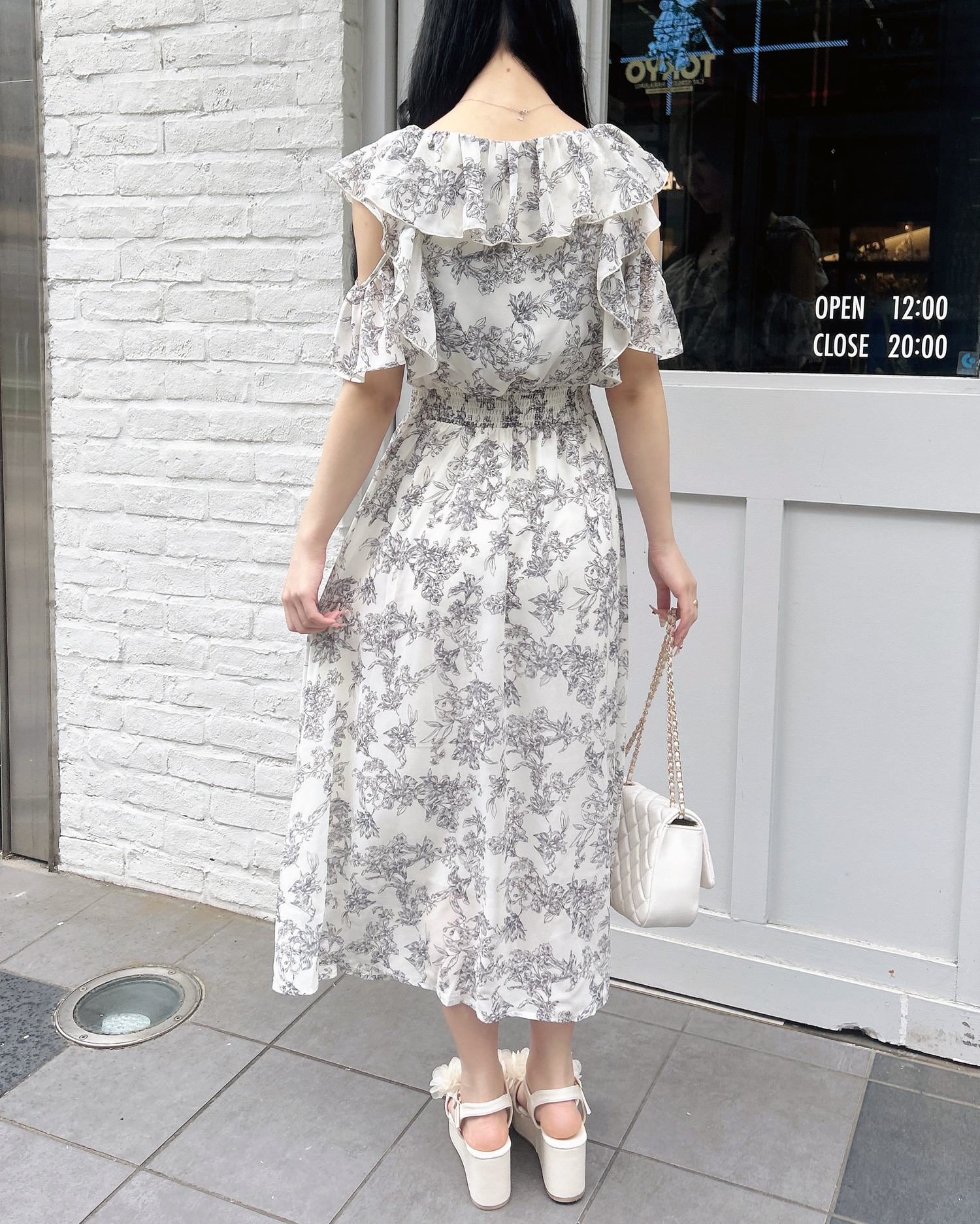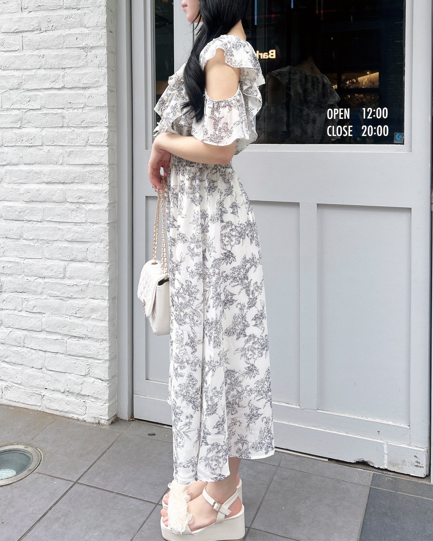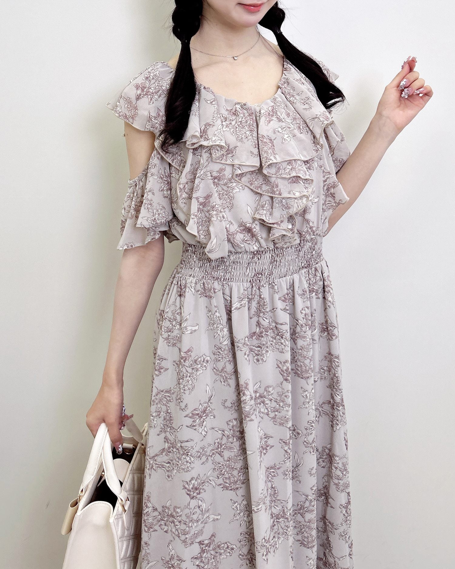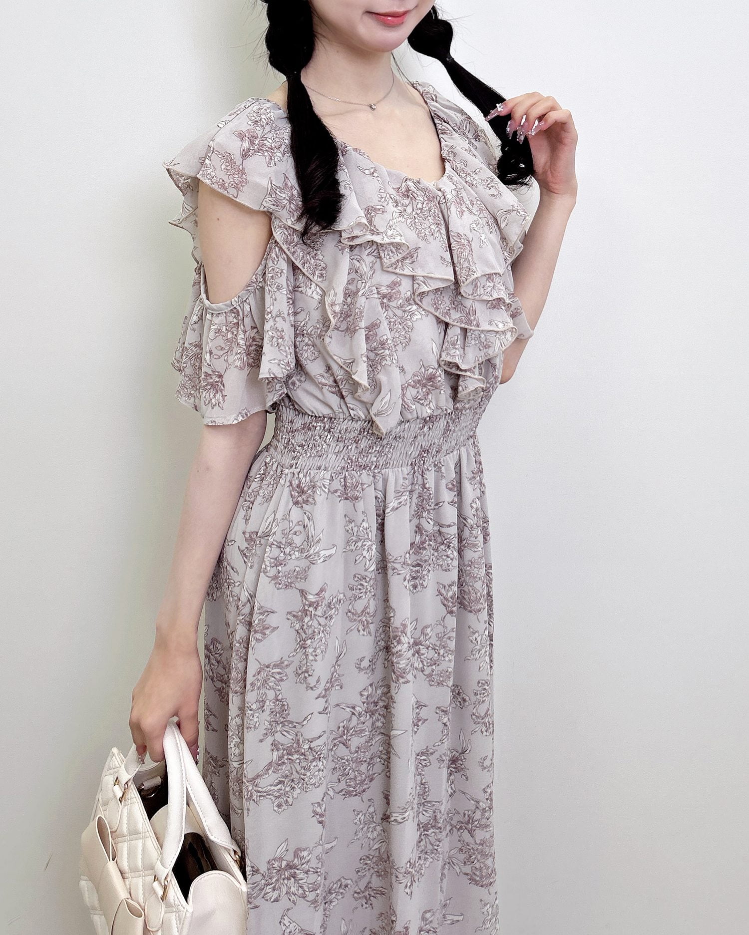 フリルたっぷりのデザインと肩開きのデザインで
