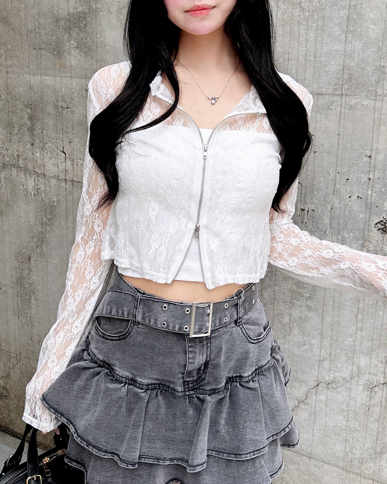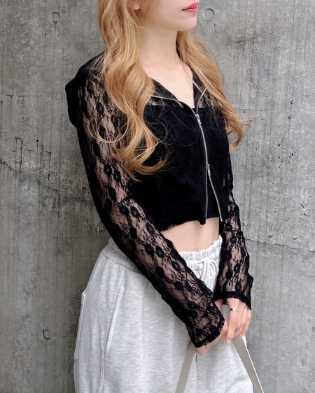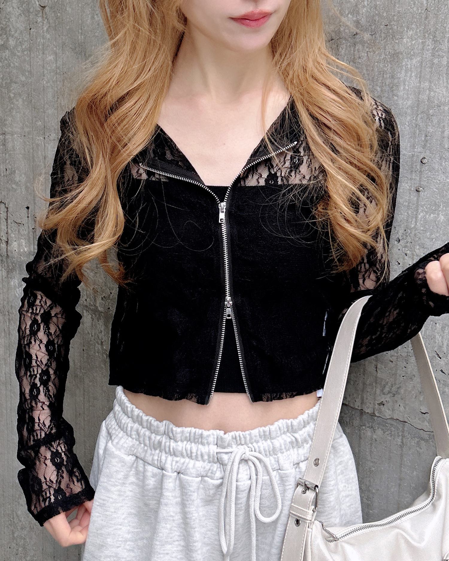 【カジュアルすぎない風合いで洗練された印象のシアーレースパーカー】