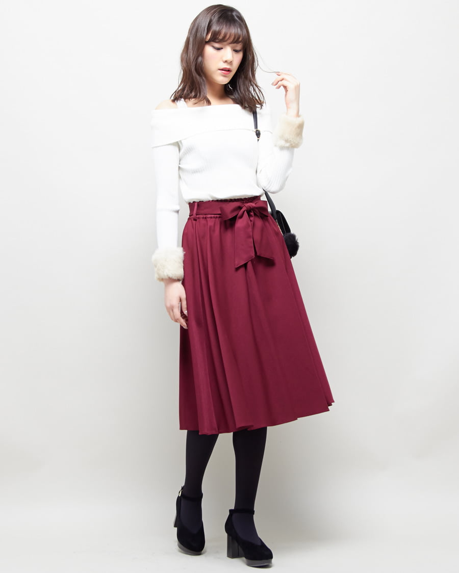 袖ファーオフショルリブニットとサッシュ付ピーチイレヘムスカートのSET☆