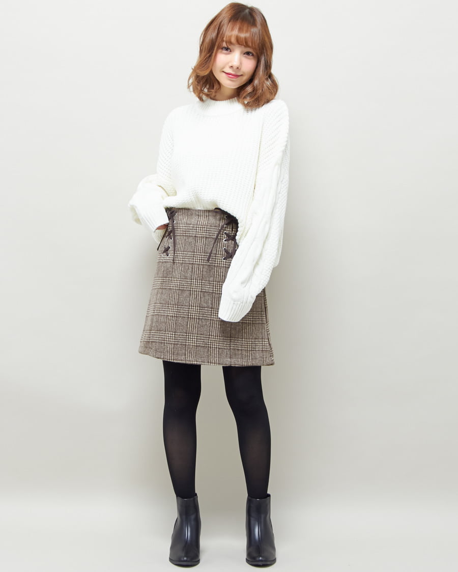 袖ケーブルプチハイネックニットとシャギーチェックレースUP台形スカートのSET☆
