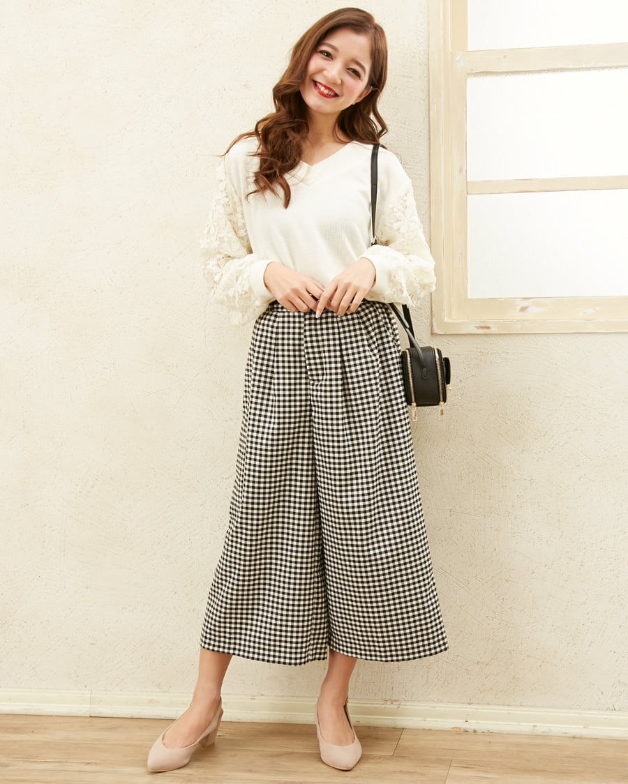 袖レーストップスとベルト付柄ガウチョパンツのSET☆