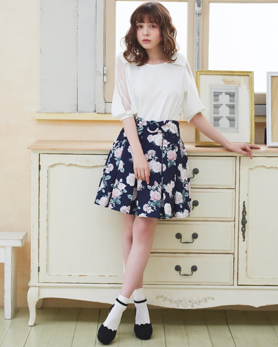 肩リボン袖割れレーストップスとウエストリボン花柄タックフレアスカートのSET☆