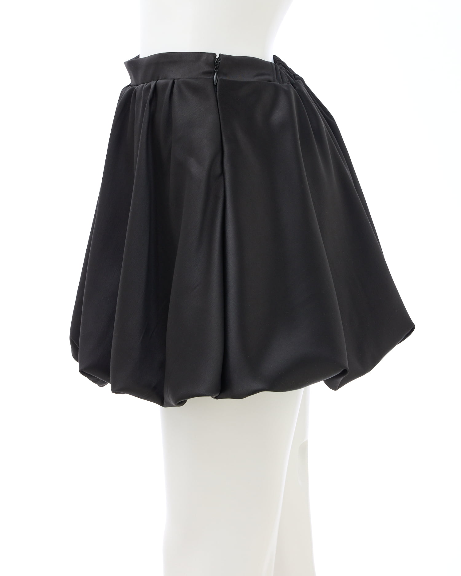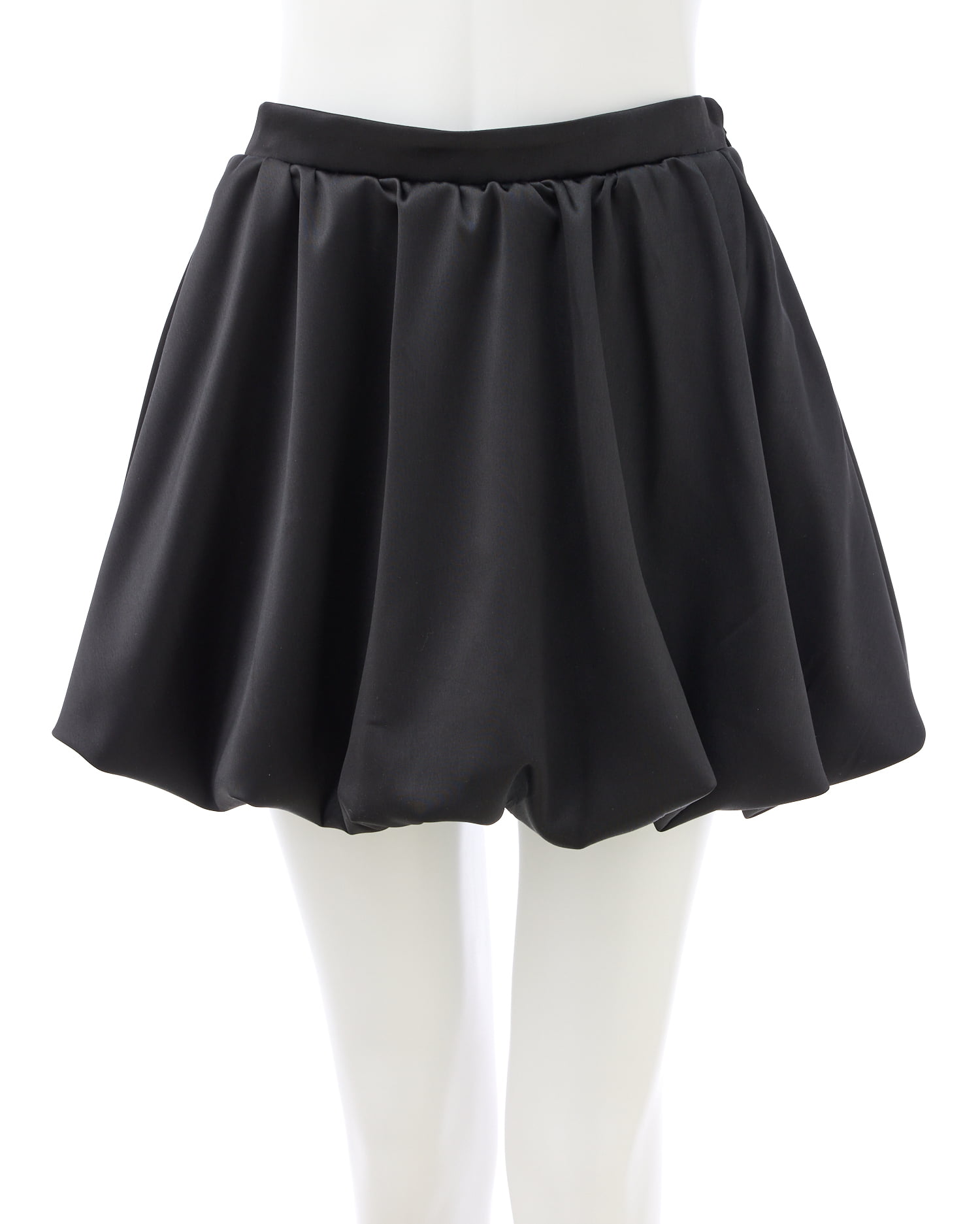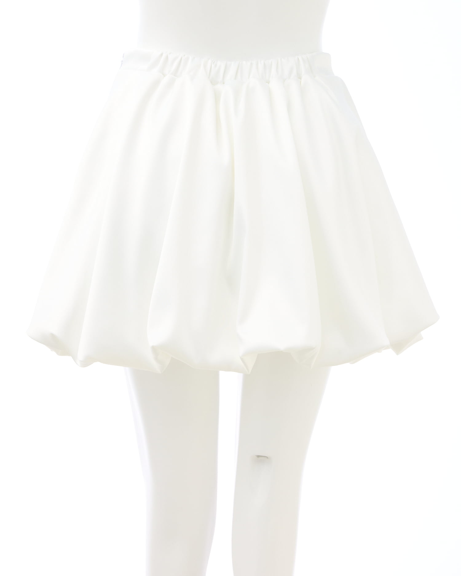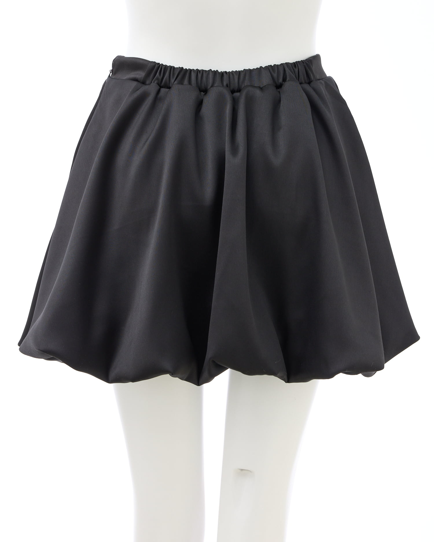 バルーンシルエットとサテンの光沢で大人キュートに仕上げた