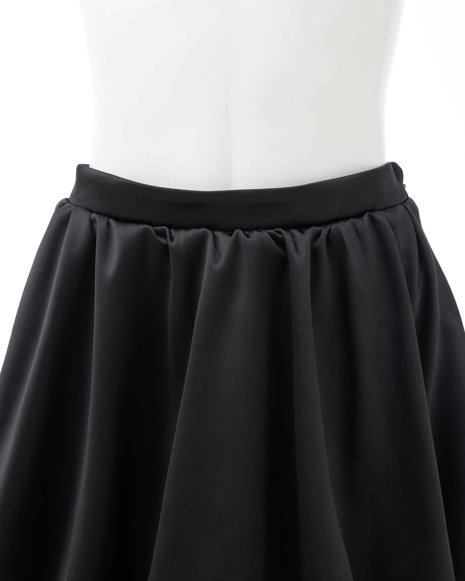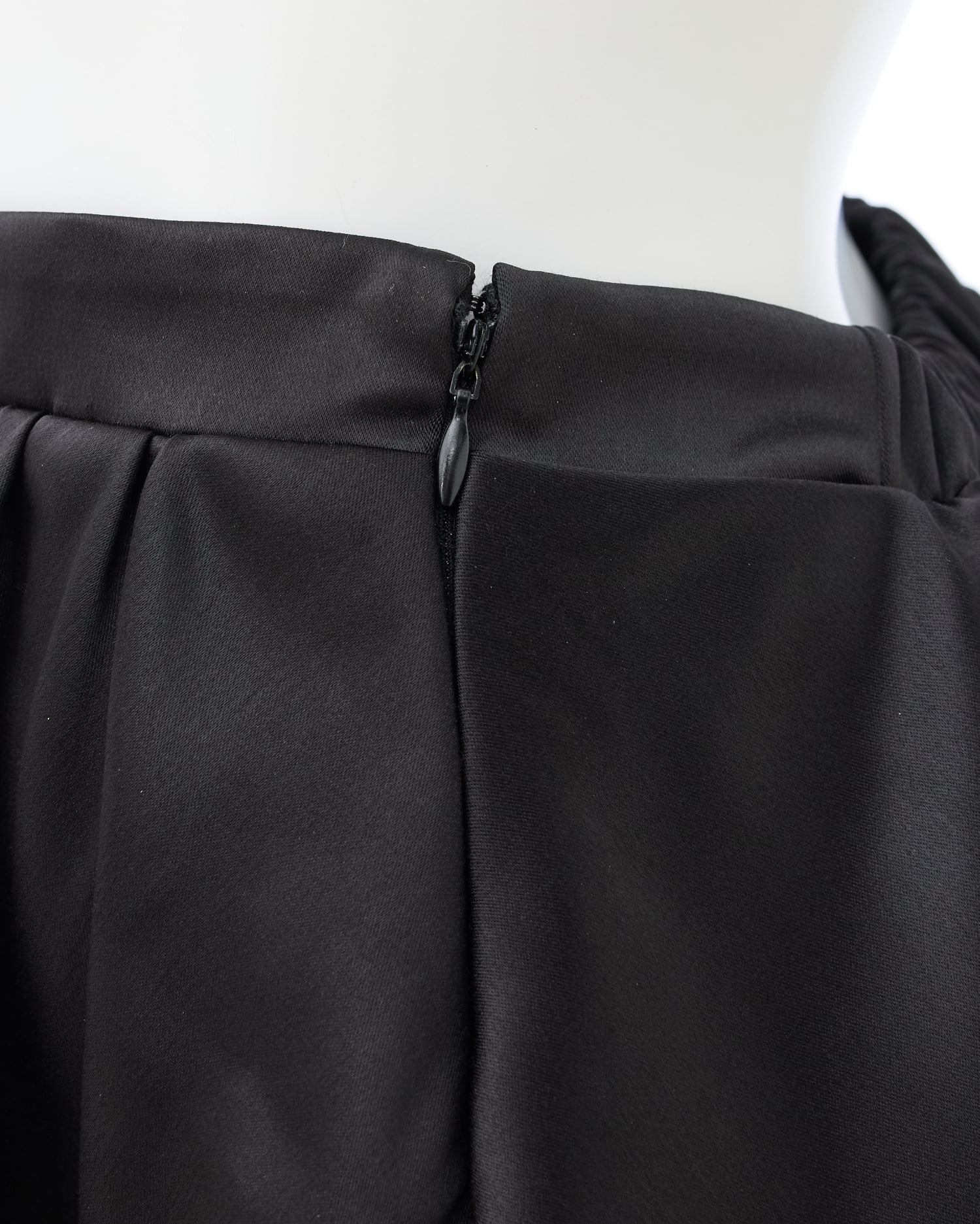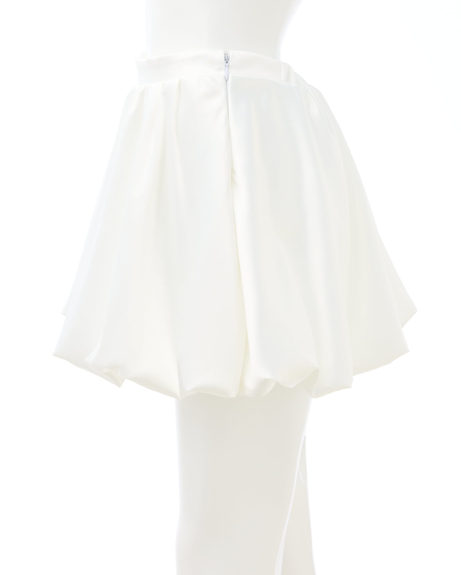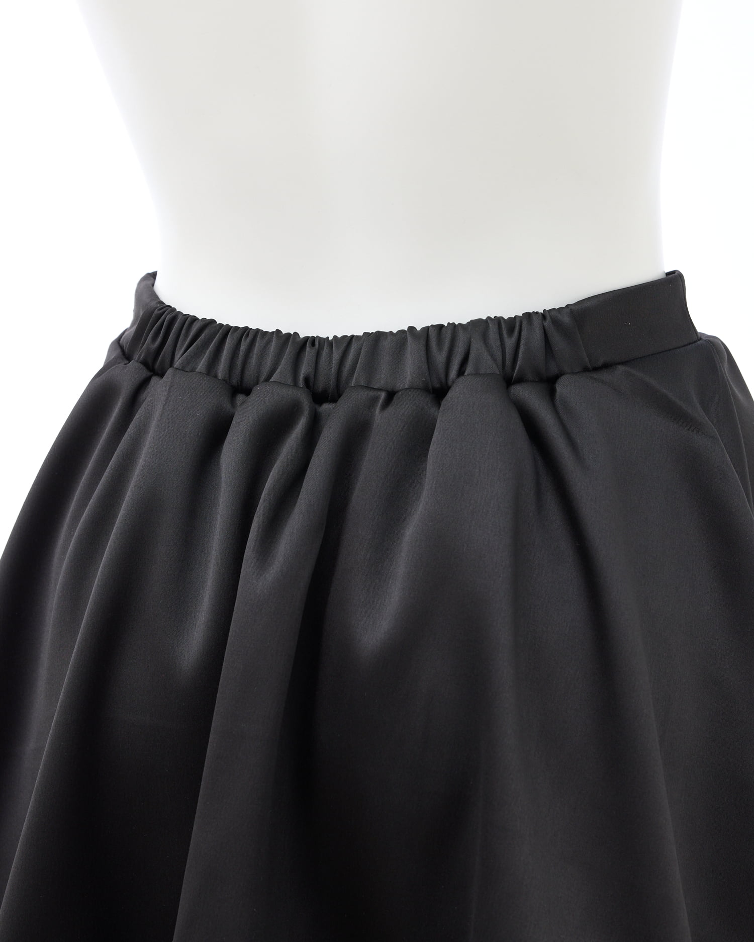 バルーンシルエットとサテンの光沢で大人キュートに仕上げた