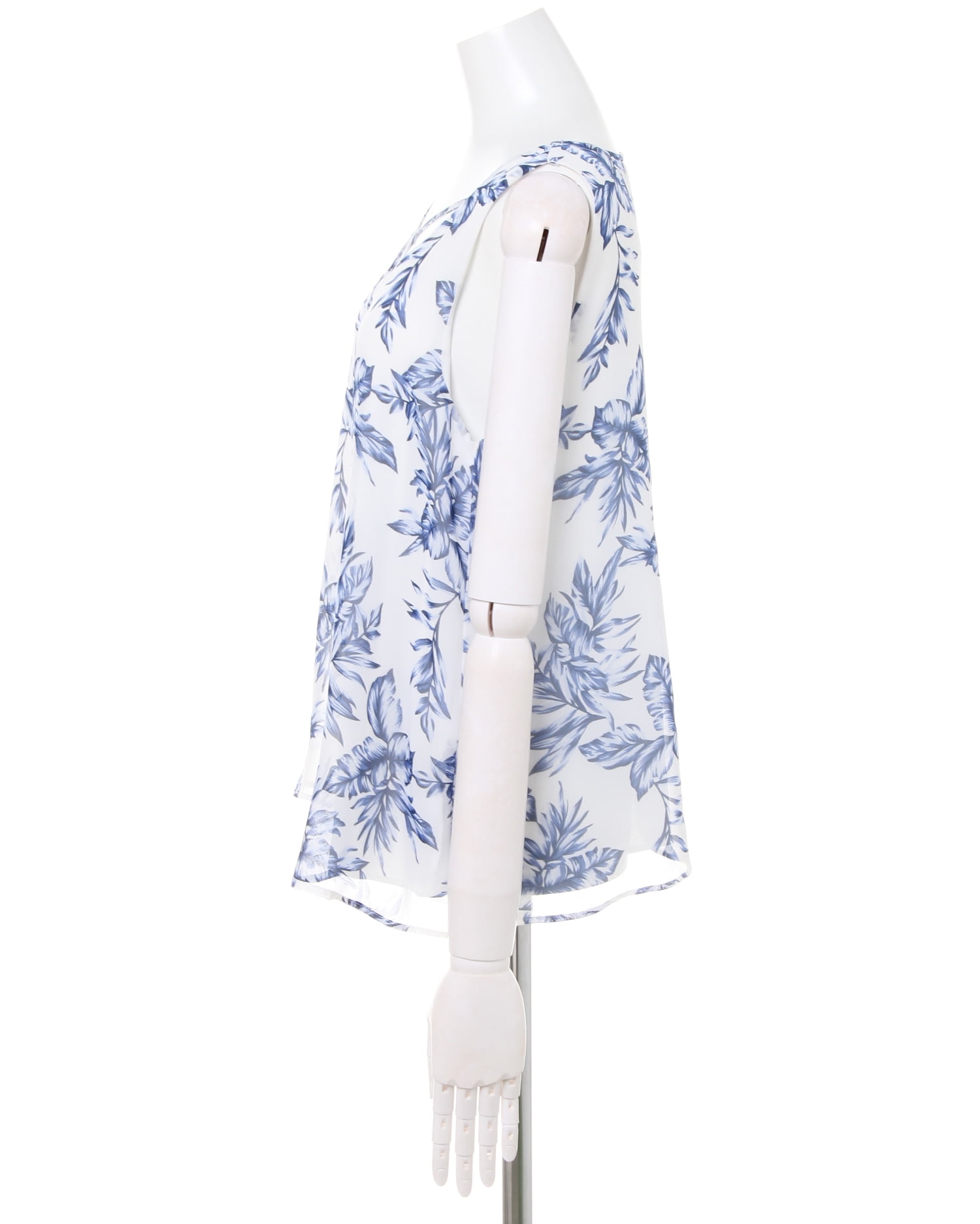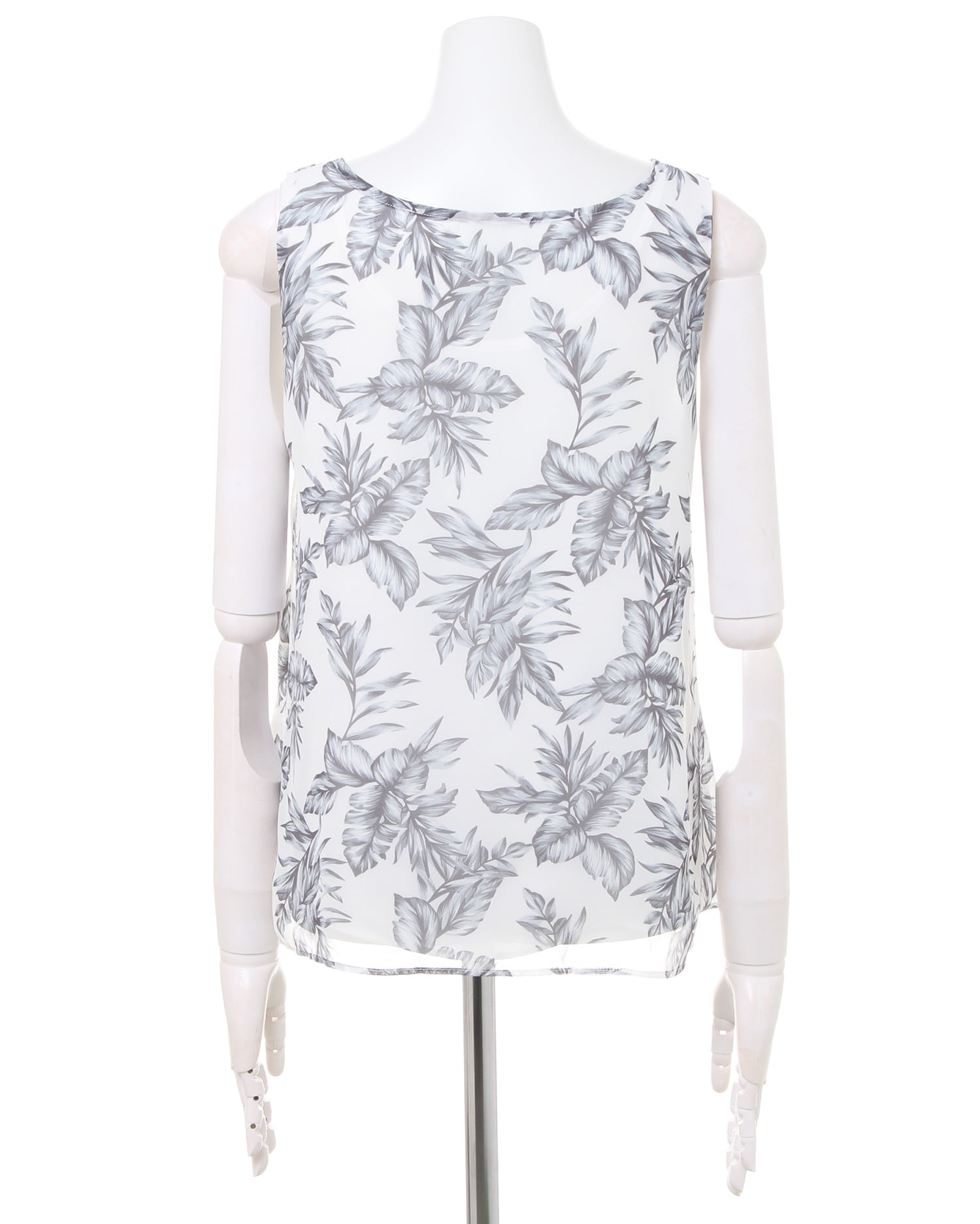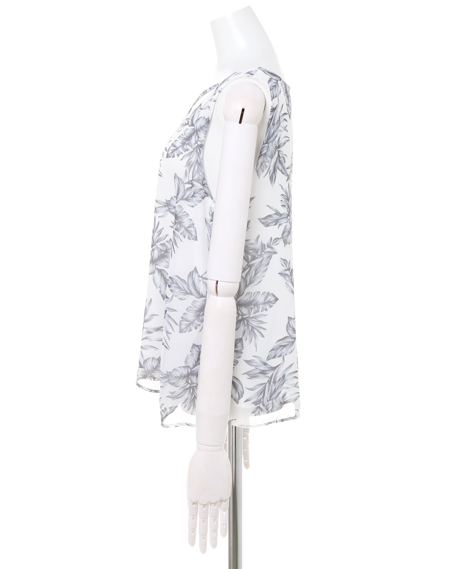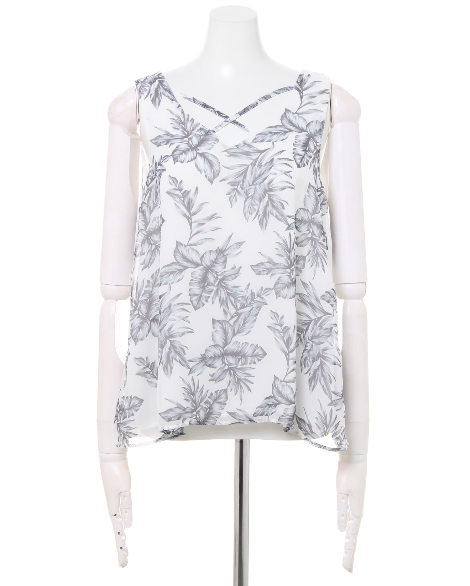 エアリー感のある生地が季節感をあおるノースリーブトップス。ふんわりとしたゆったりめのシルエットが今年らしい1枚です。全体にあしらったリーフ柄がリゾートムード満点。広めに開いたVネックにクロスストラップがアクセントになっています。デコルテラインをキレイに見せてくれるので1枚で着るのはもちろん、レイヤードスタイルもオススメ。