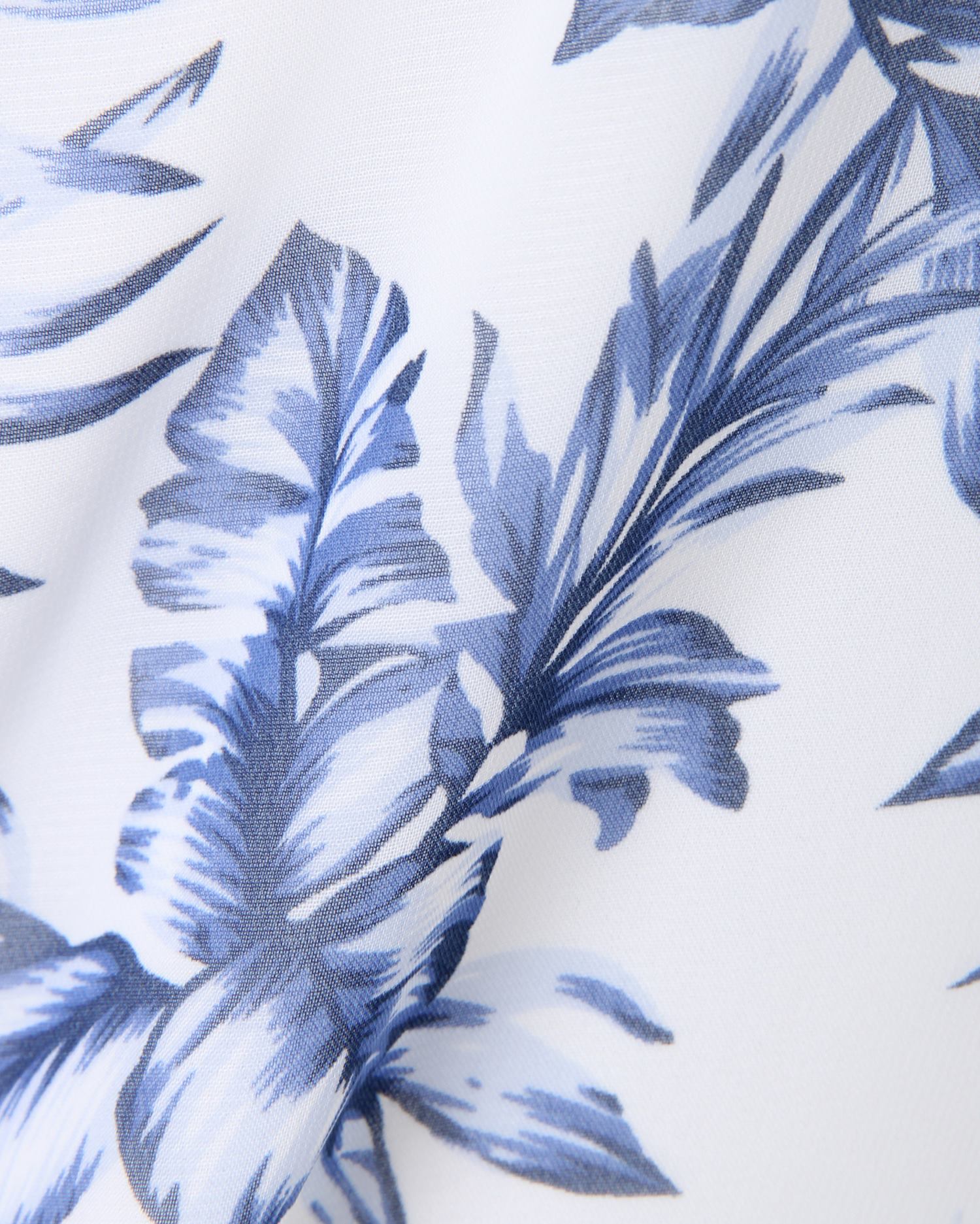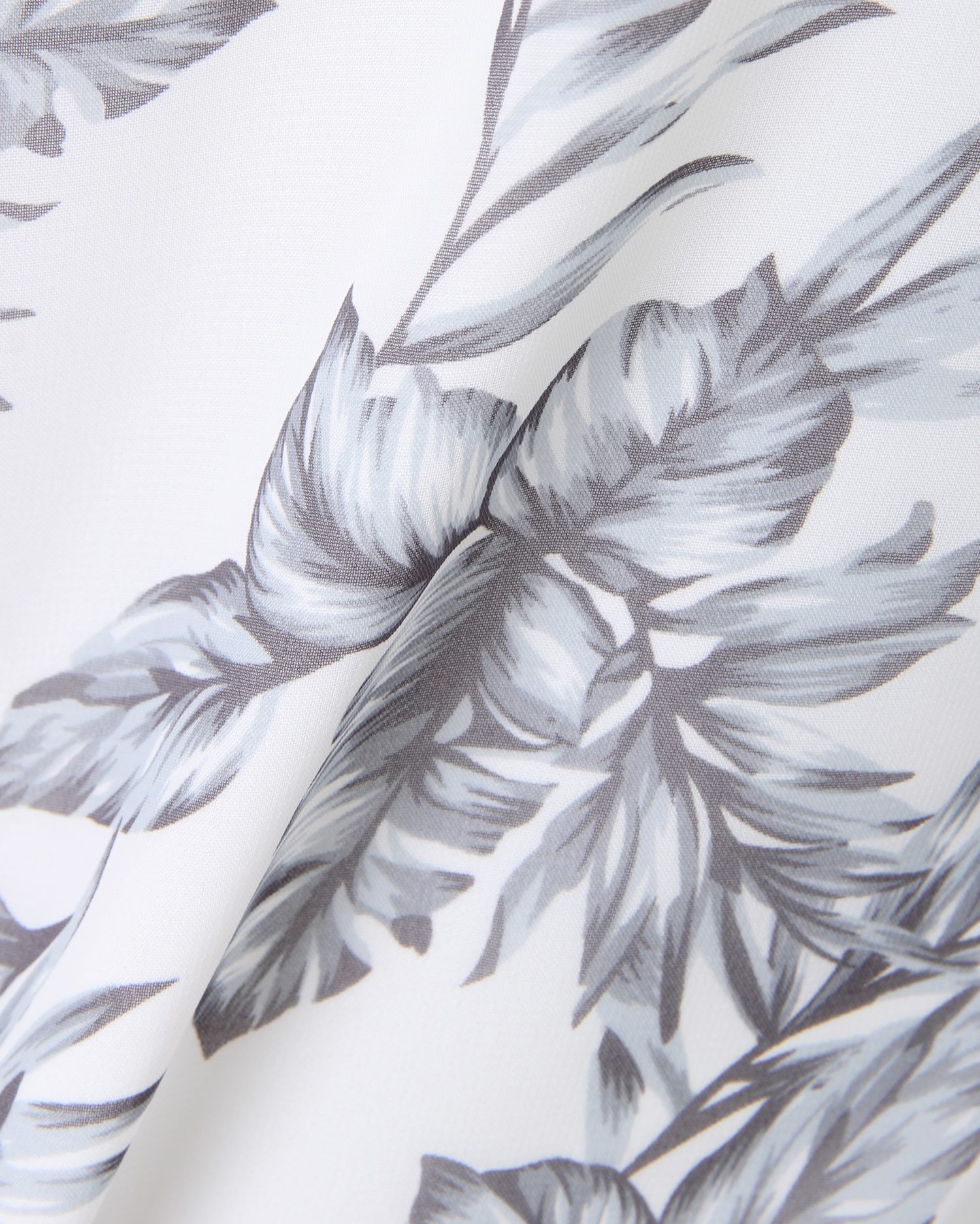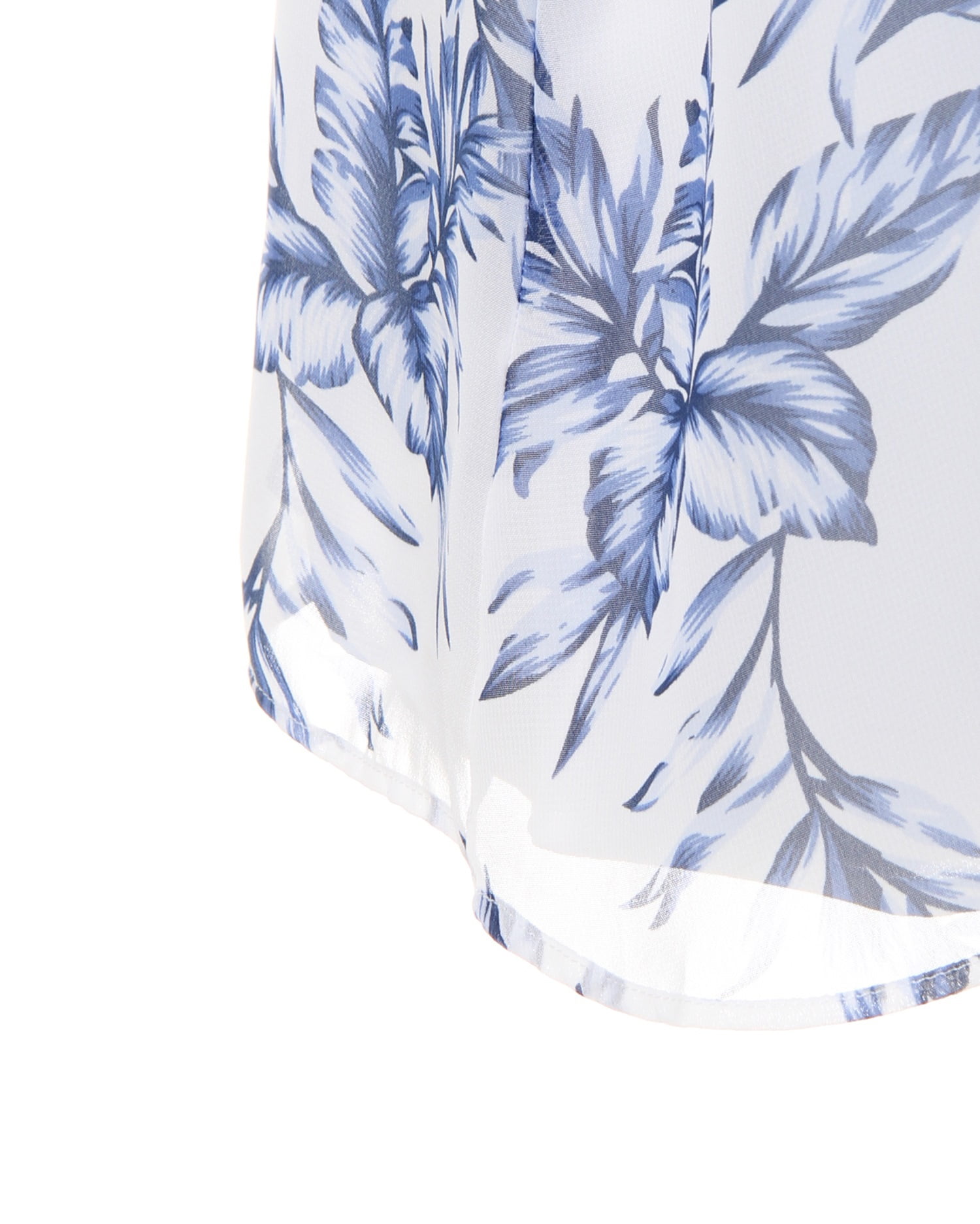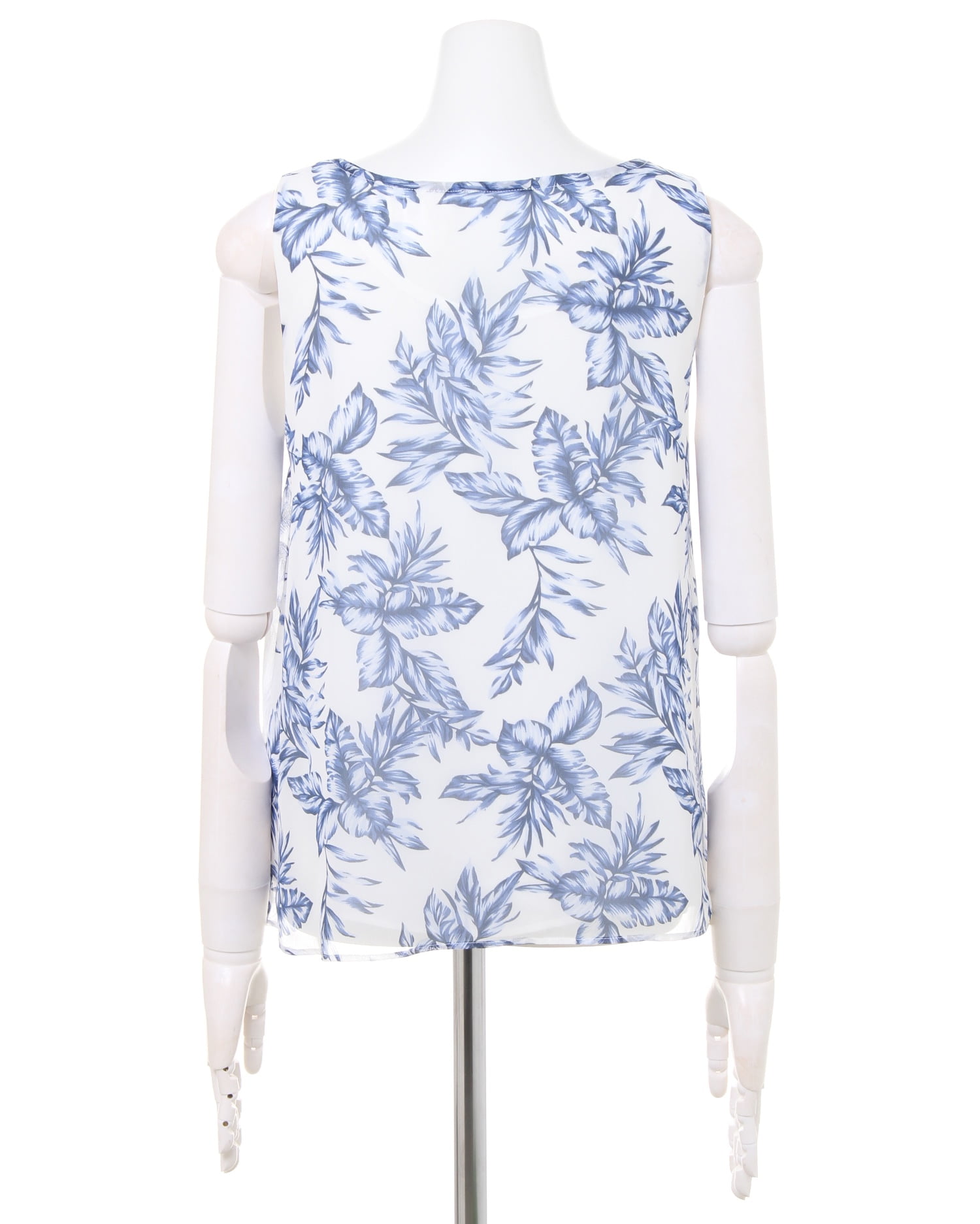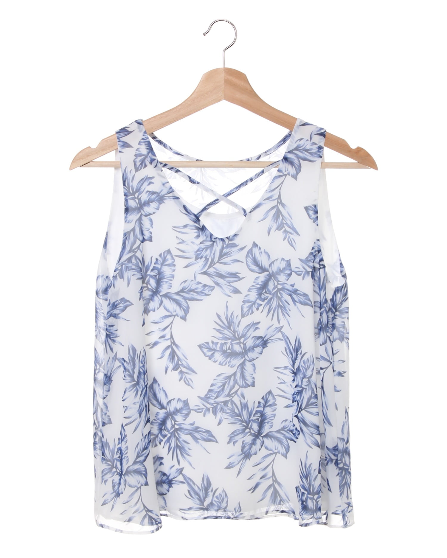 エアリー感のある生地が季節感をあおるノースリーブトップス。ふんわりとしたゆったりめのシルエットが今年らしい1枚です。全体にあしらったリーフ柄がリゾートムード満点。広めに開いたVネックにクロスストラップがアクセントになっています。デコルテラインをキレイに見せてくれるので1枚で着るのはもちろん、レイヤードスタイルもオススメ。