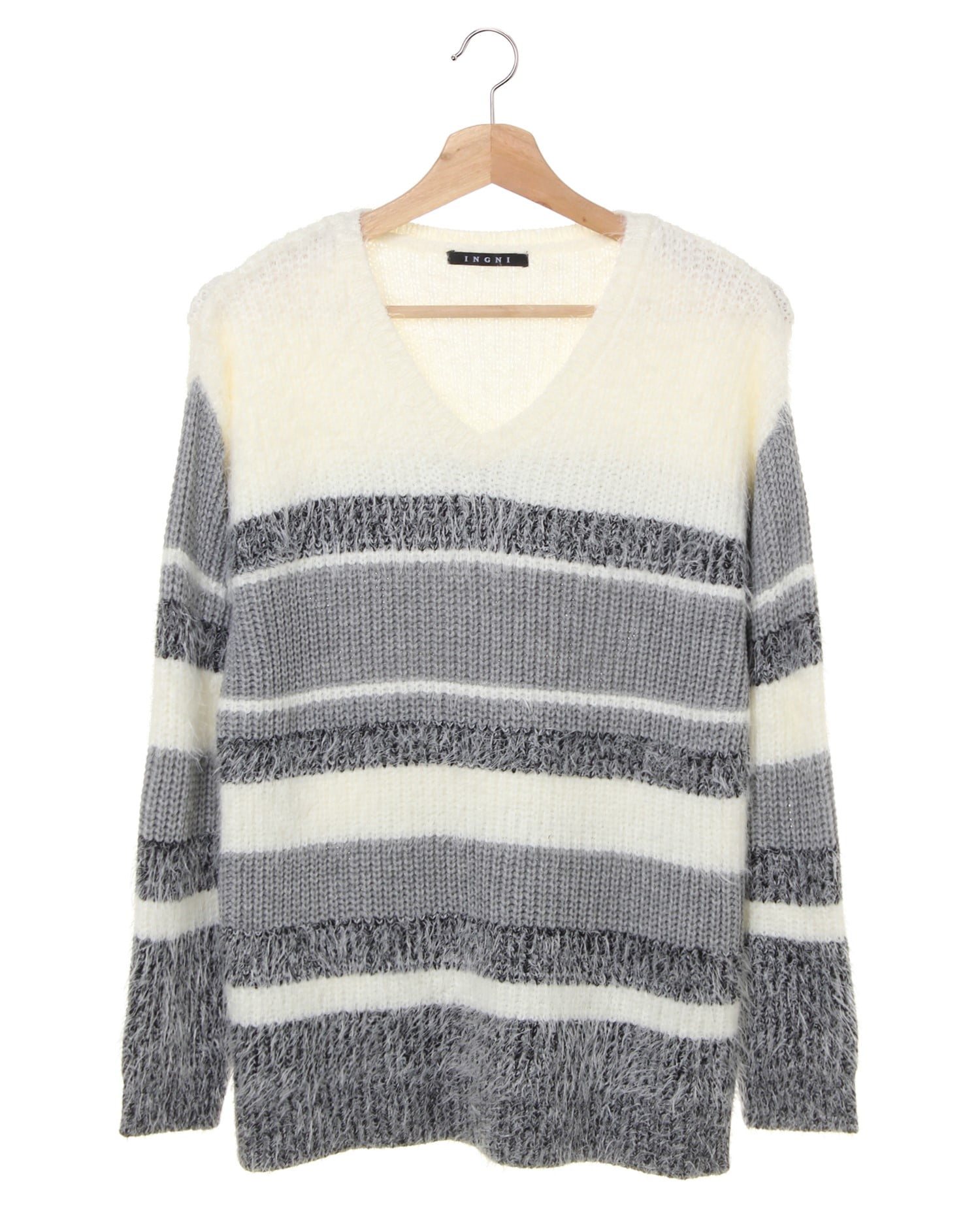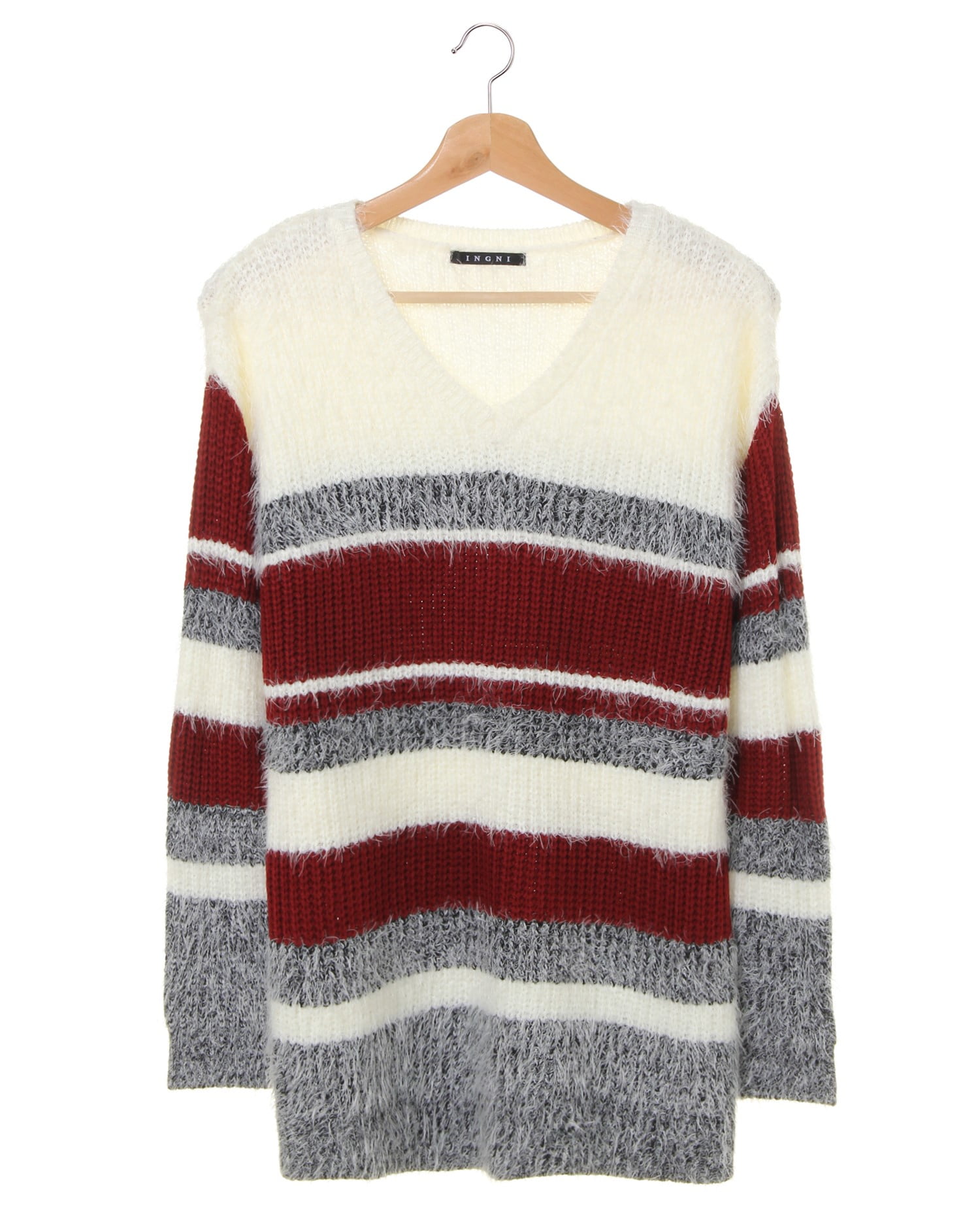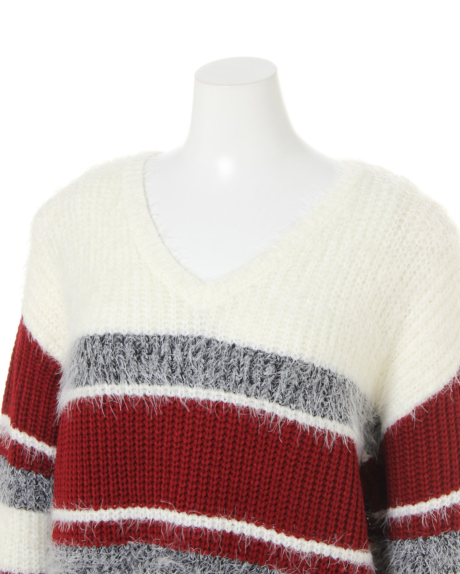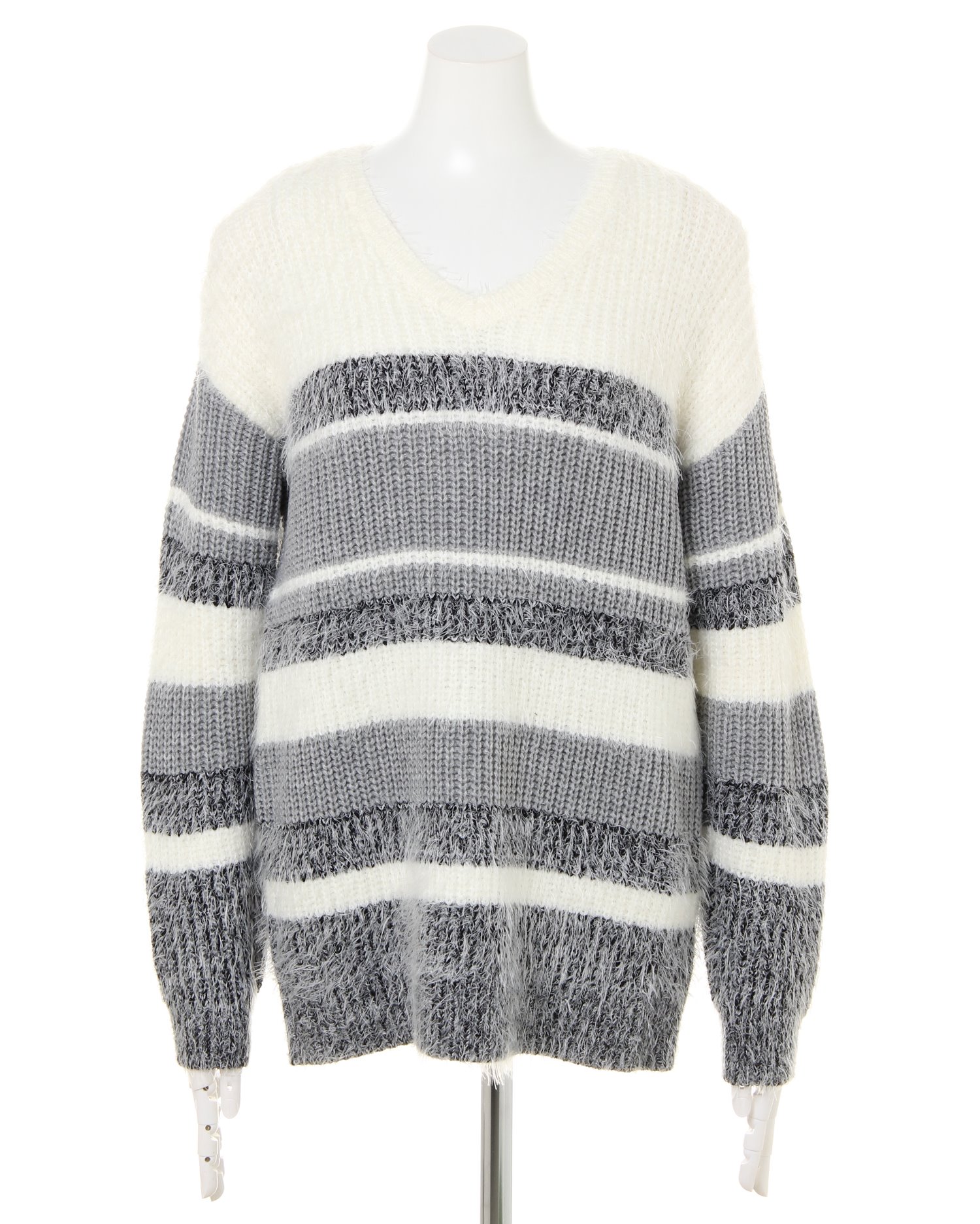 カラーコントラストで見せる主役級のニット。毛足の長いフェザーとざっくりした編み地で変化を付け、ピッチを変えたボーダーが存在感抜群です。深めに入れたVネックがデコルテラインをきれいに演出。裾丈も長めに設定し、気になる体型カバーも叶えます。ボリュームのあるアイテムなので、ボトムスはすっきりシルエットを合わせるのがオススメ。
