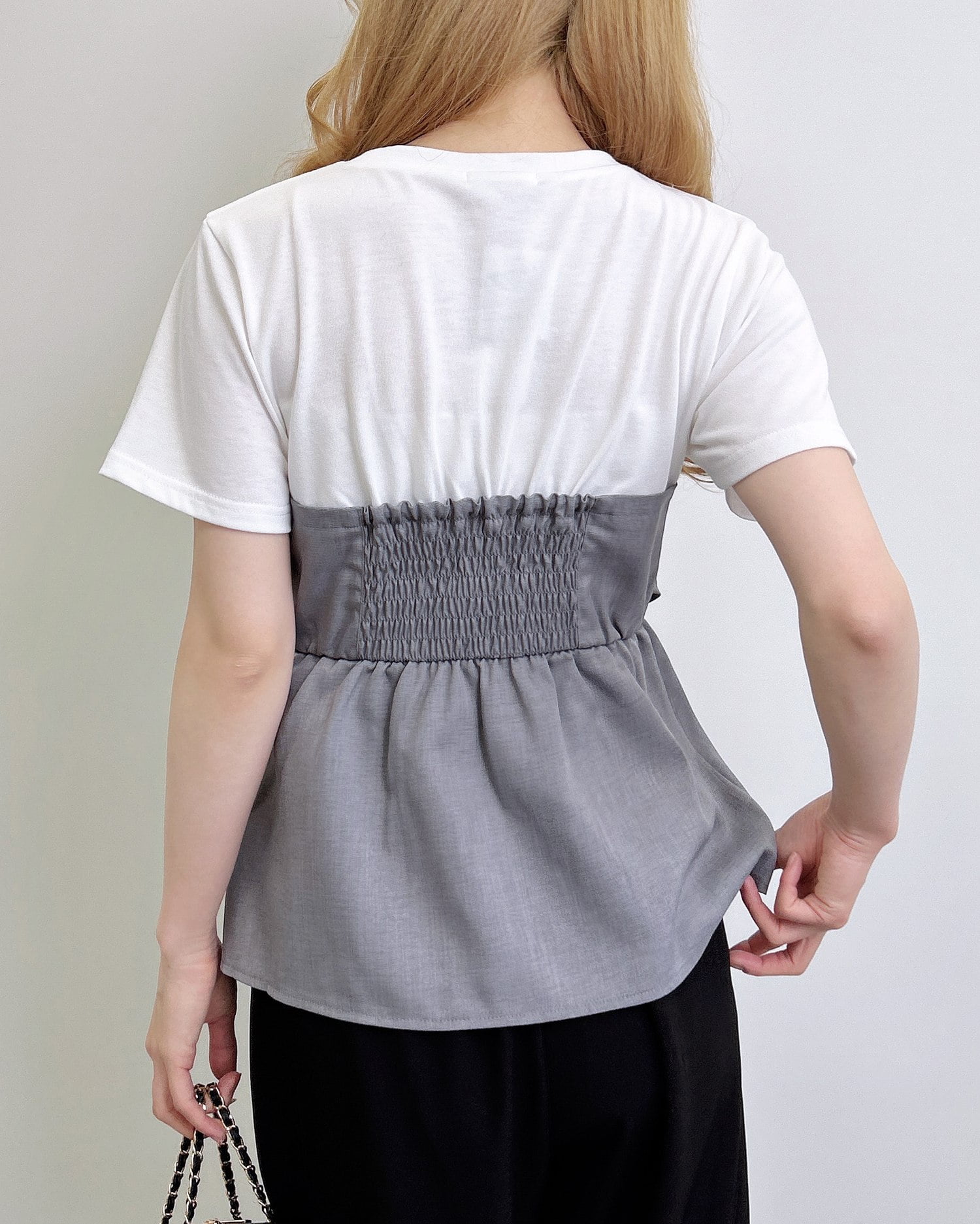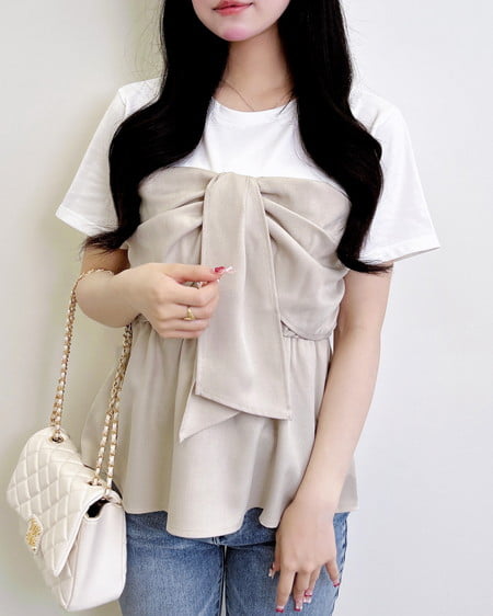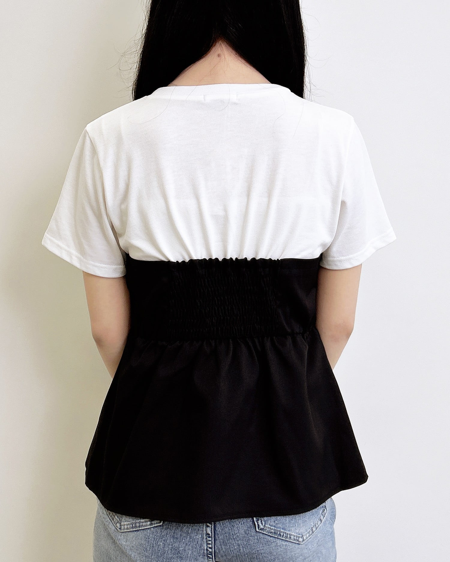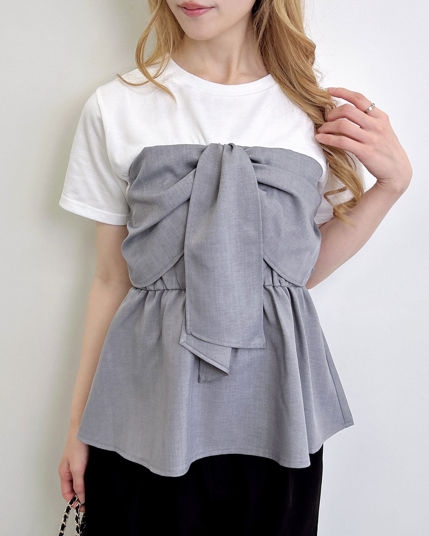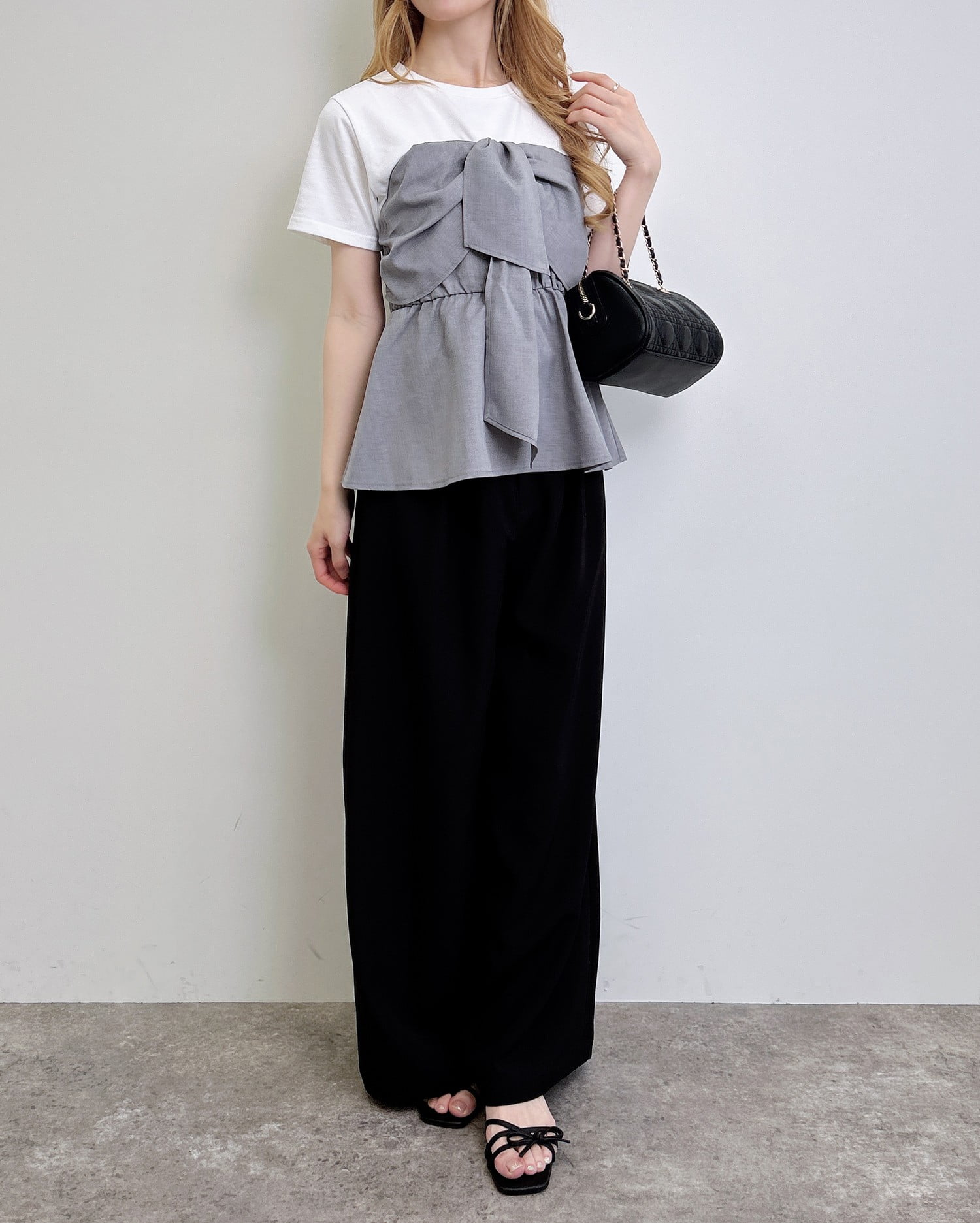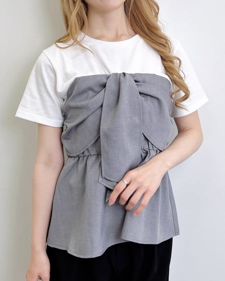 Tシャツにビスチェを重ねたようなドッキングデザインのトップス。