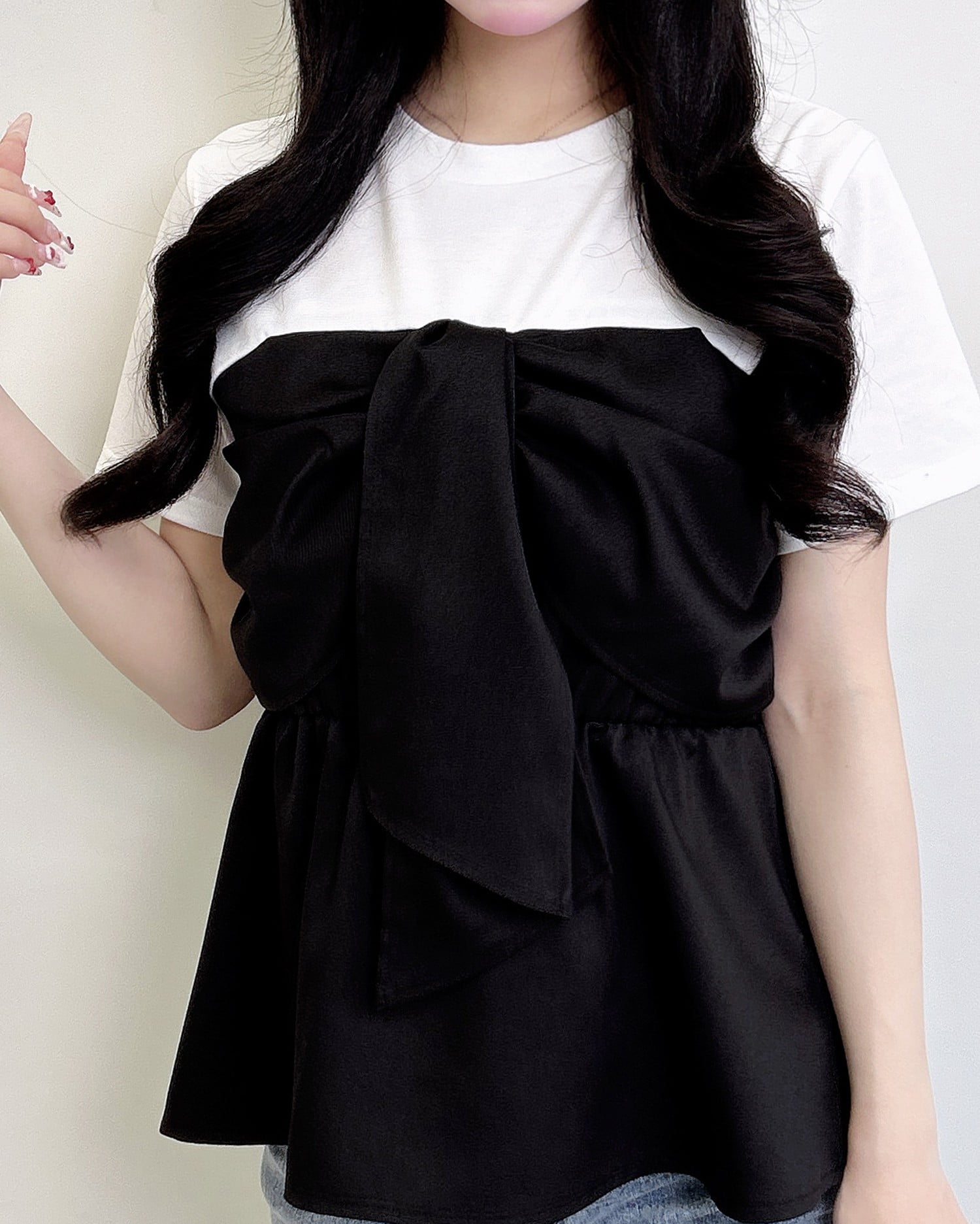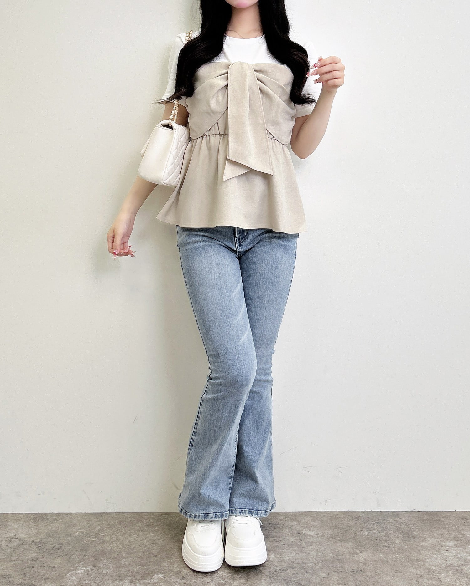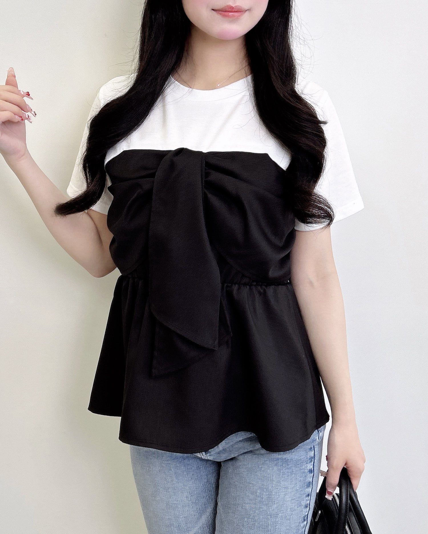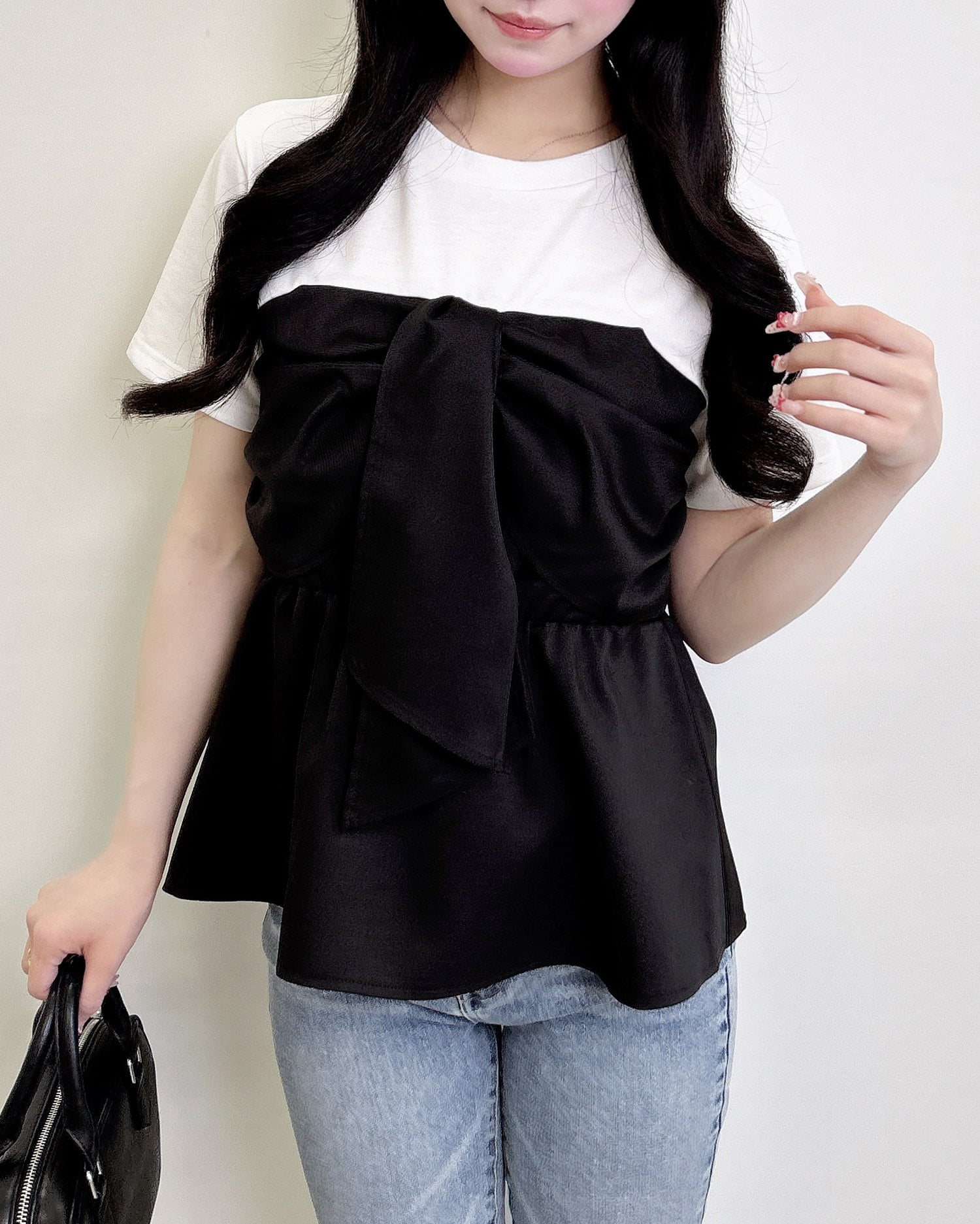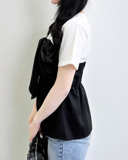 Tシャツにビスチェを重ねたようなドッキングデザインのトップス。