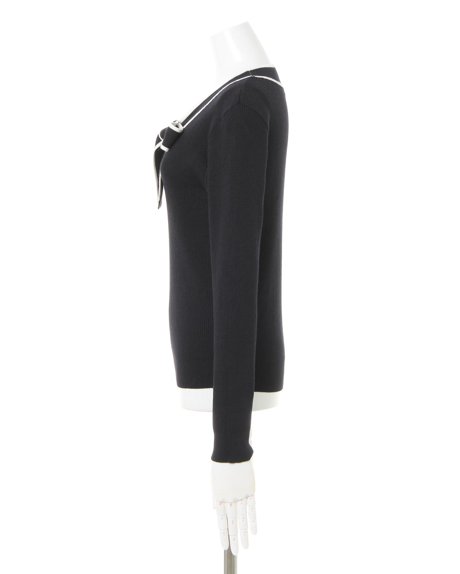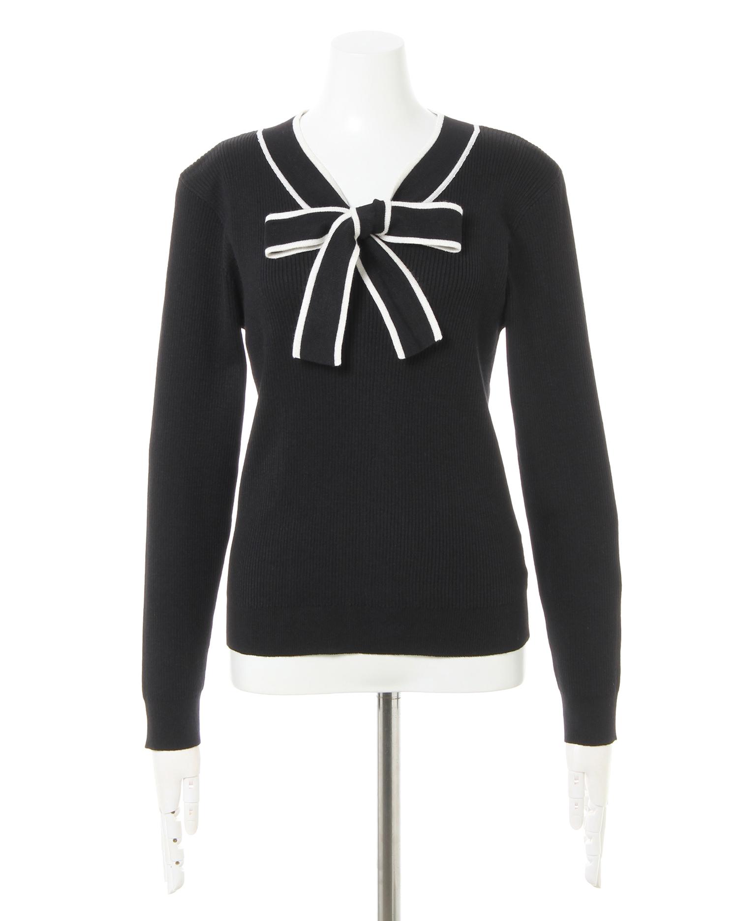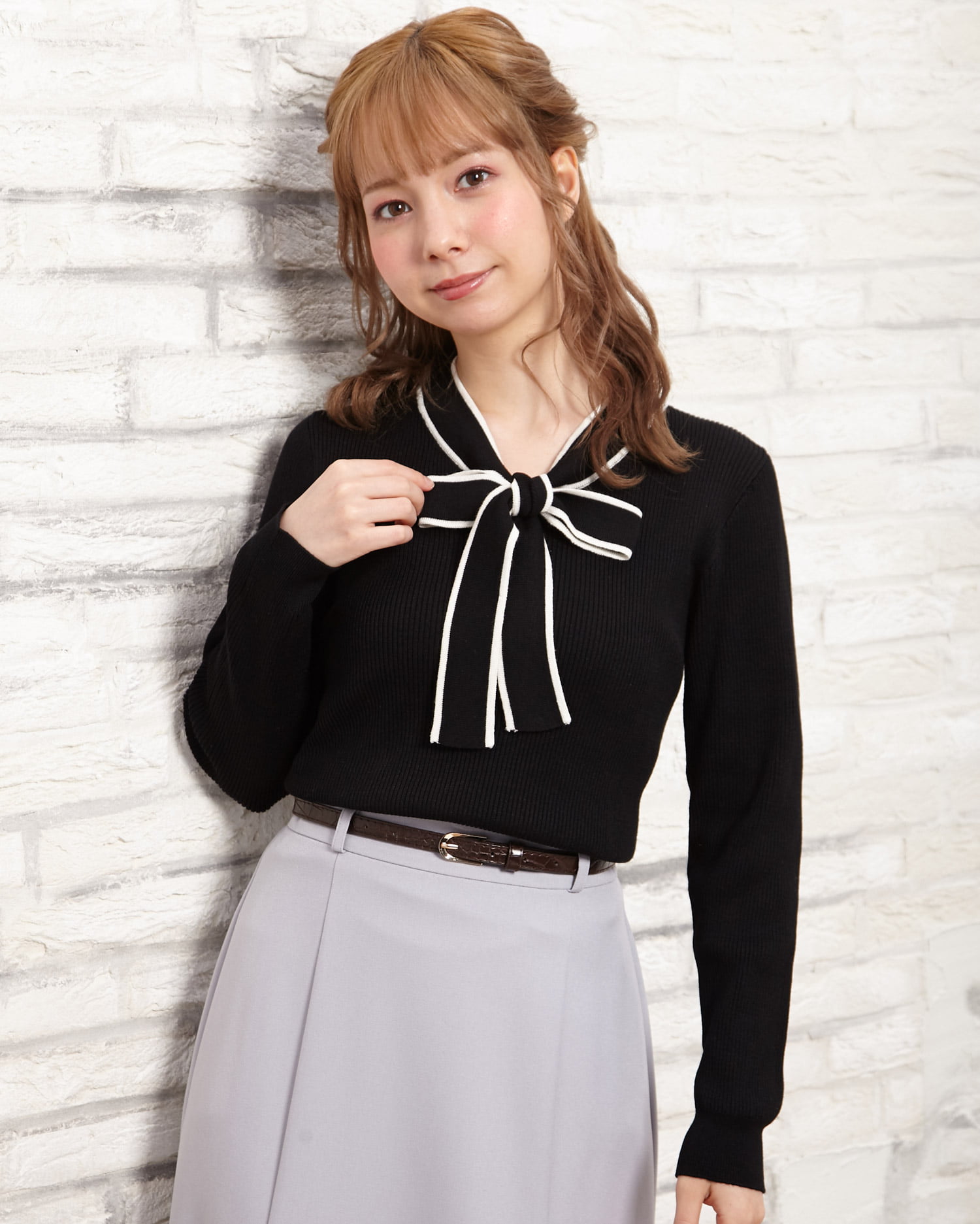 ボウタイデザインが魅力なしっとりソフトな肌触りで着心地も快適なニット。ボディラインに程よくフィットしてくれる細リブが上品な印象をプラスします。上半身をコンパクトにすっきり見せてくれるので華奢見せ効果も絶大。ボウタイできちんと感もあるのでオフィススタイルにもオススメです。コーディネイトにメリハリをつけるライン使いにも注目。