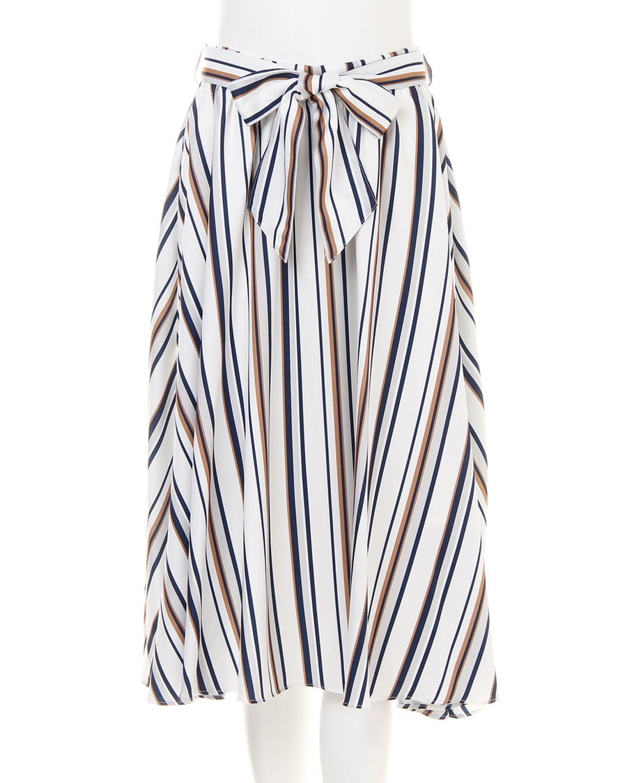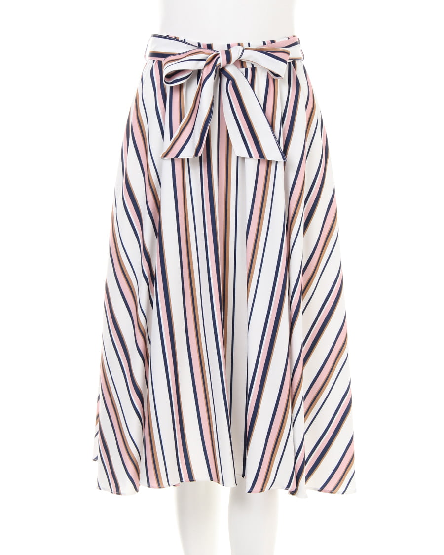 清潔感のあるホワイト地にキレイめカラーのマルチストライプがインパクトのあるスカート。フロント部分は縦に、フレアーの付いたサイドは斜めにラインが入るので動きのある表情に仕上げています。光沢感のある素材は伸縮性があり、足さばきも軽快。オンオフ問わずに着回せるので1枚あると重宝。共布ベルト付きなのでトップスインしてウエストマークすればメリハリのあるコーディネートが完成します。