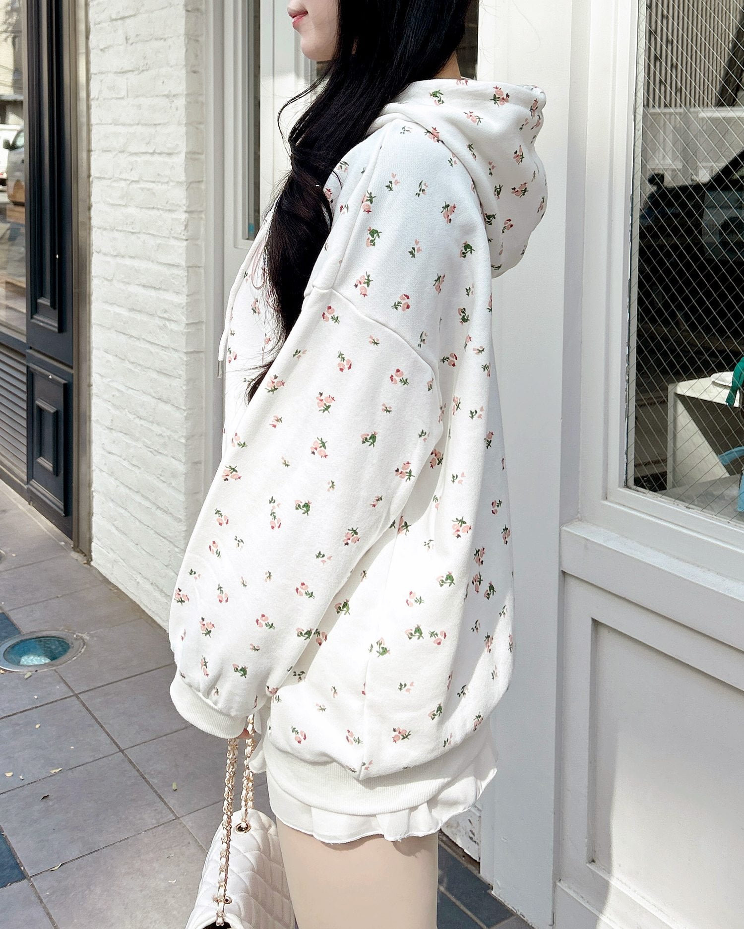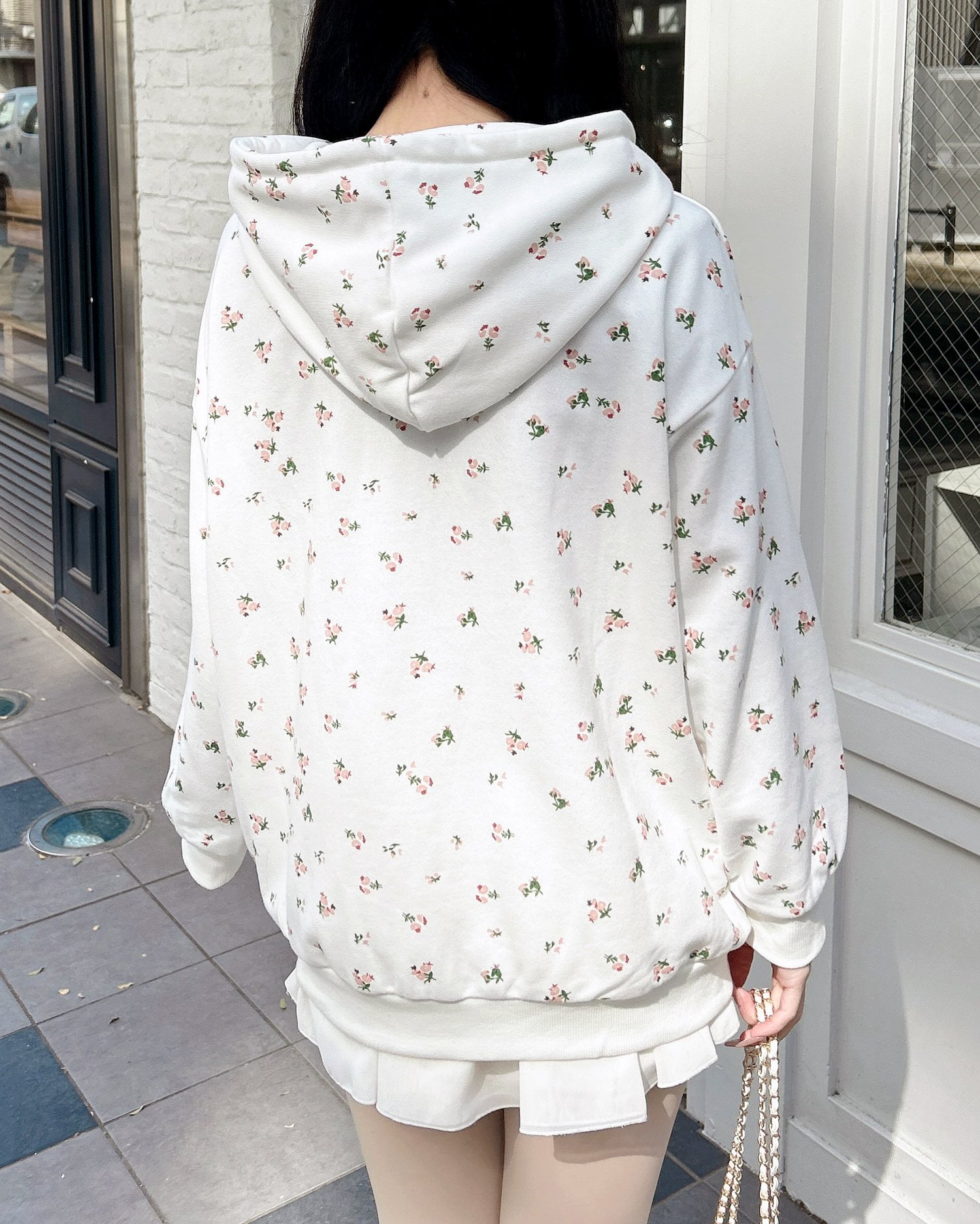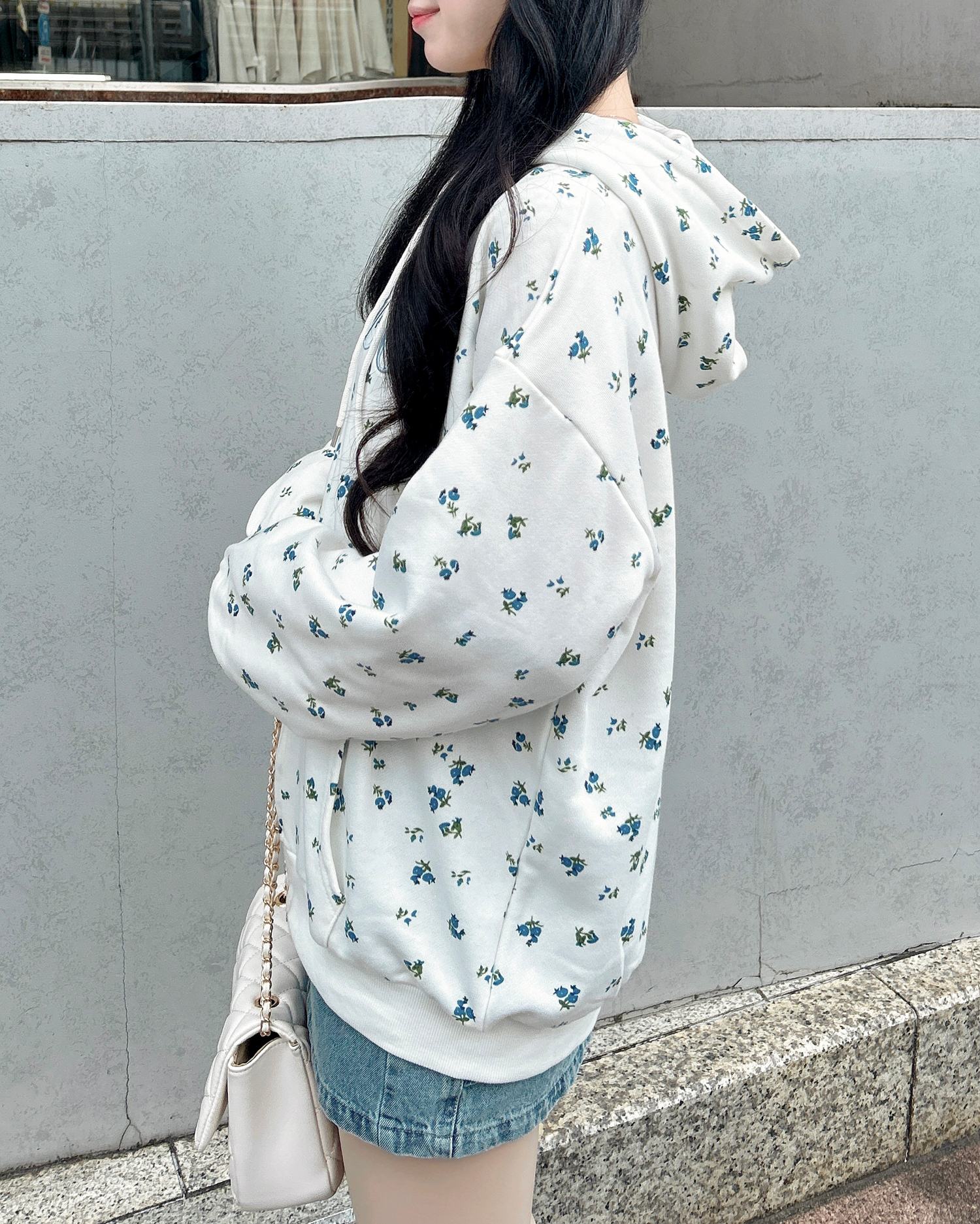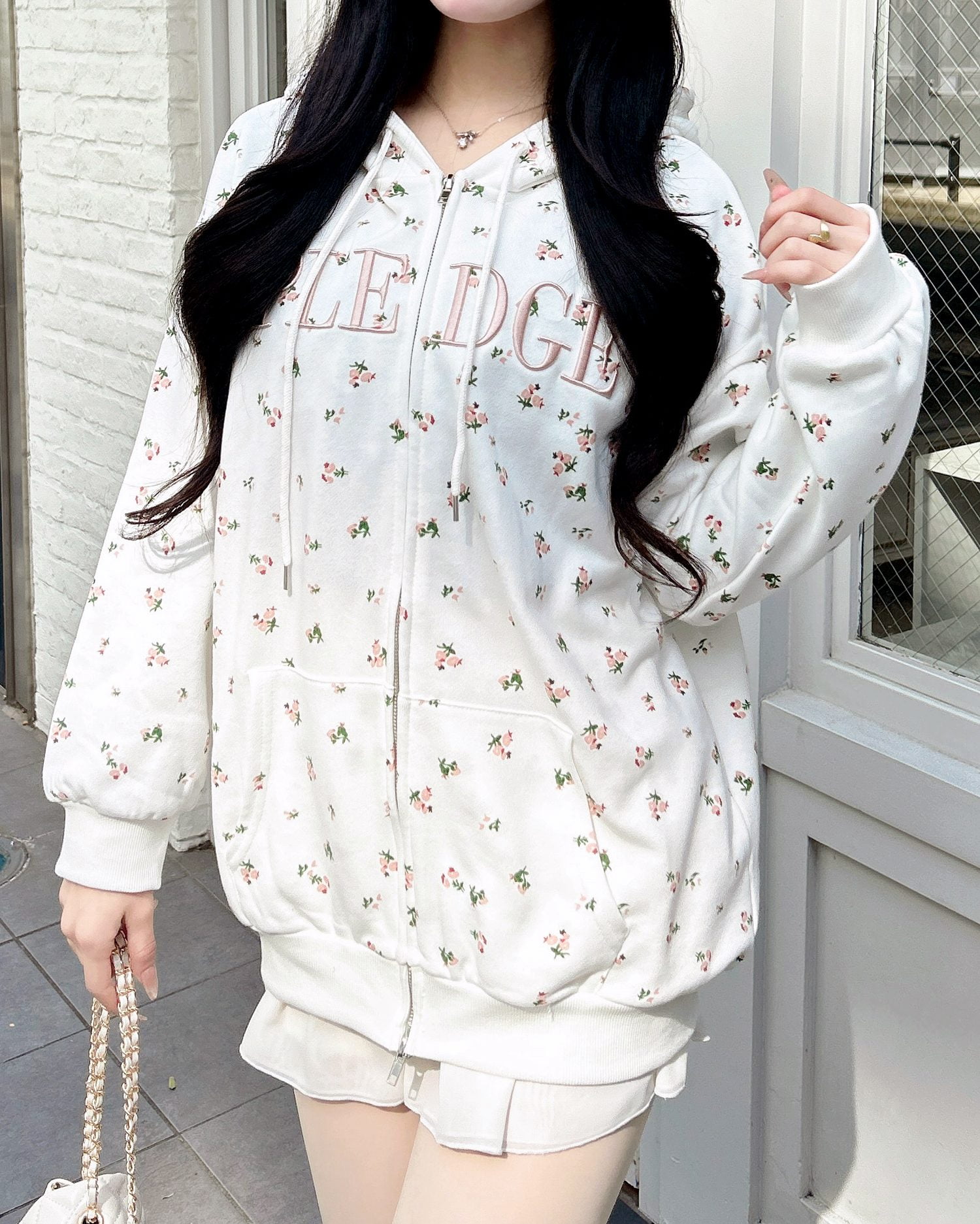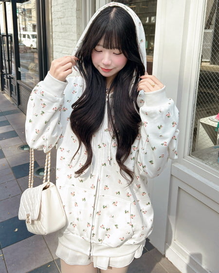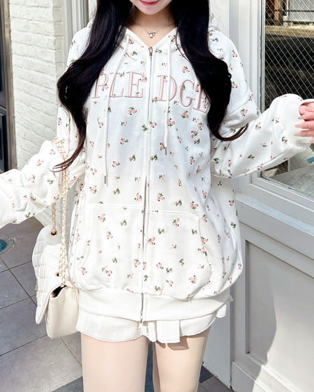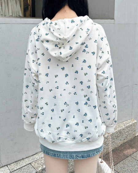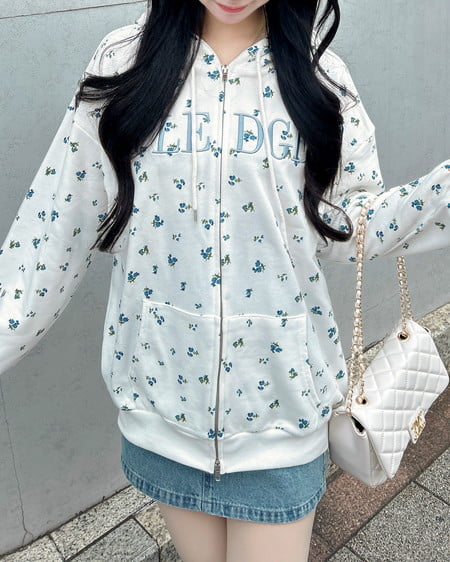 小さなフラワーを散りばめた存在感たっぷりのジップパーカー。