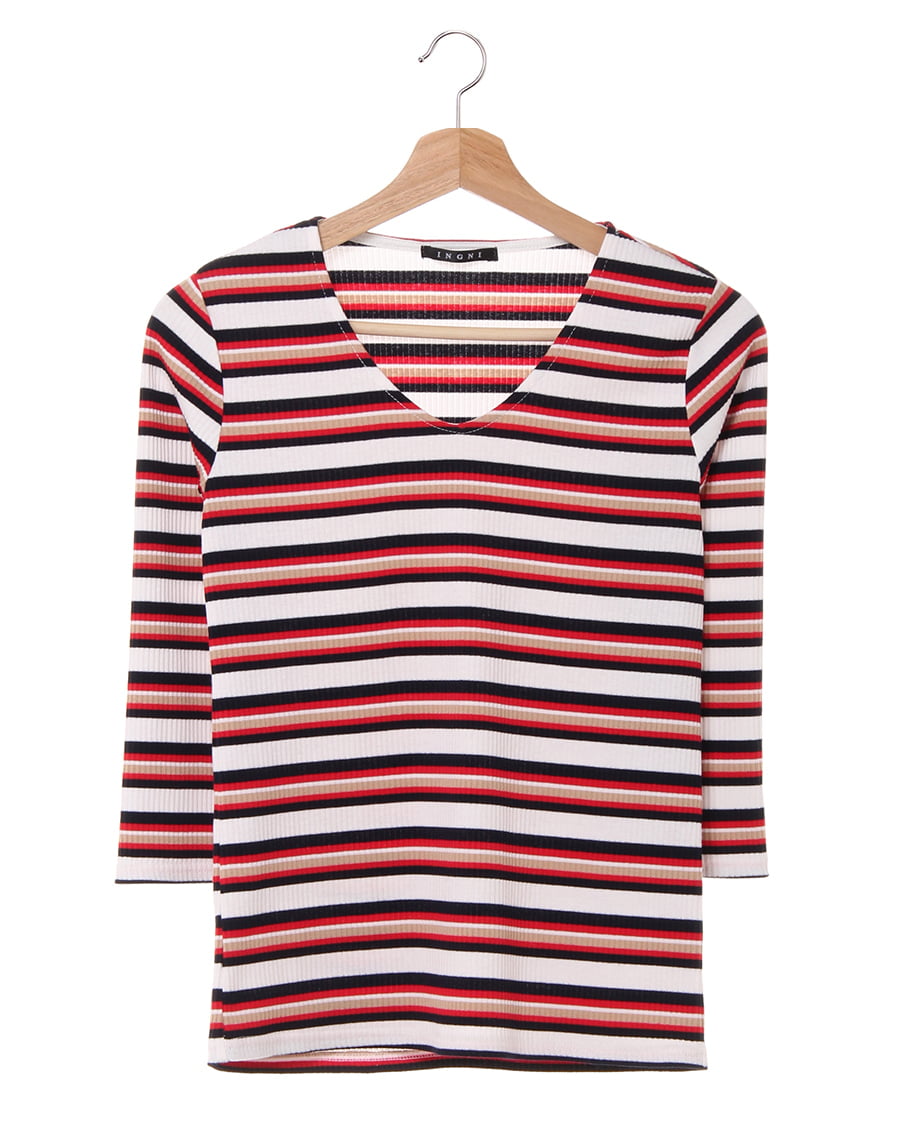 • INGNI(イング) マルチボーダーリブVネック7分袖 オフホワイト/アカ