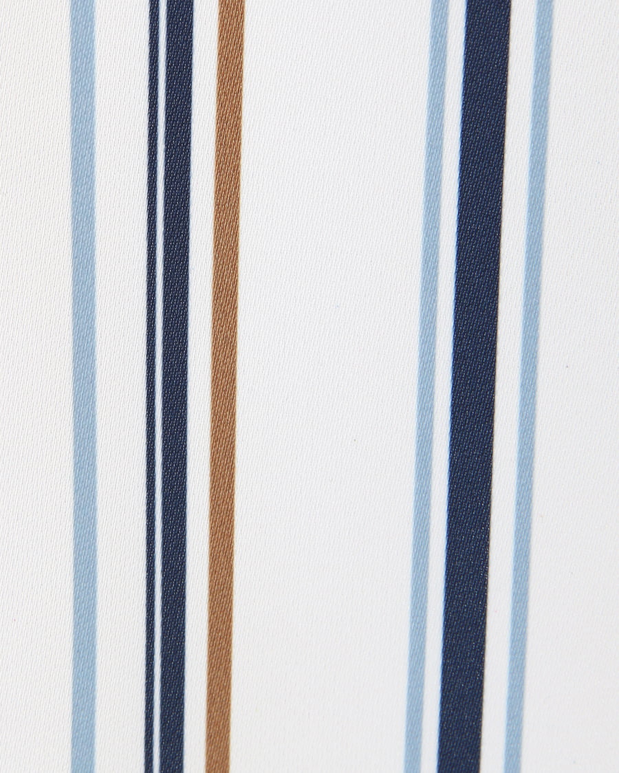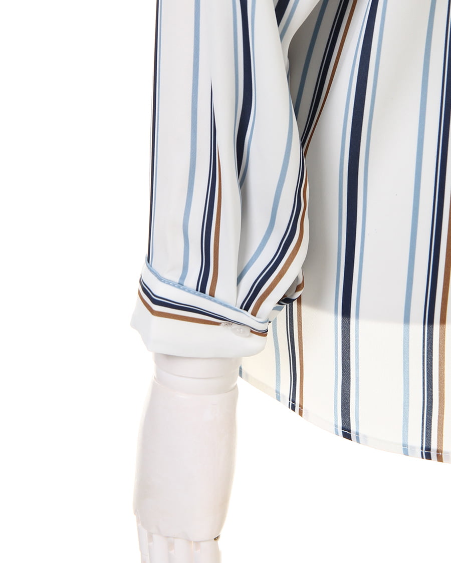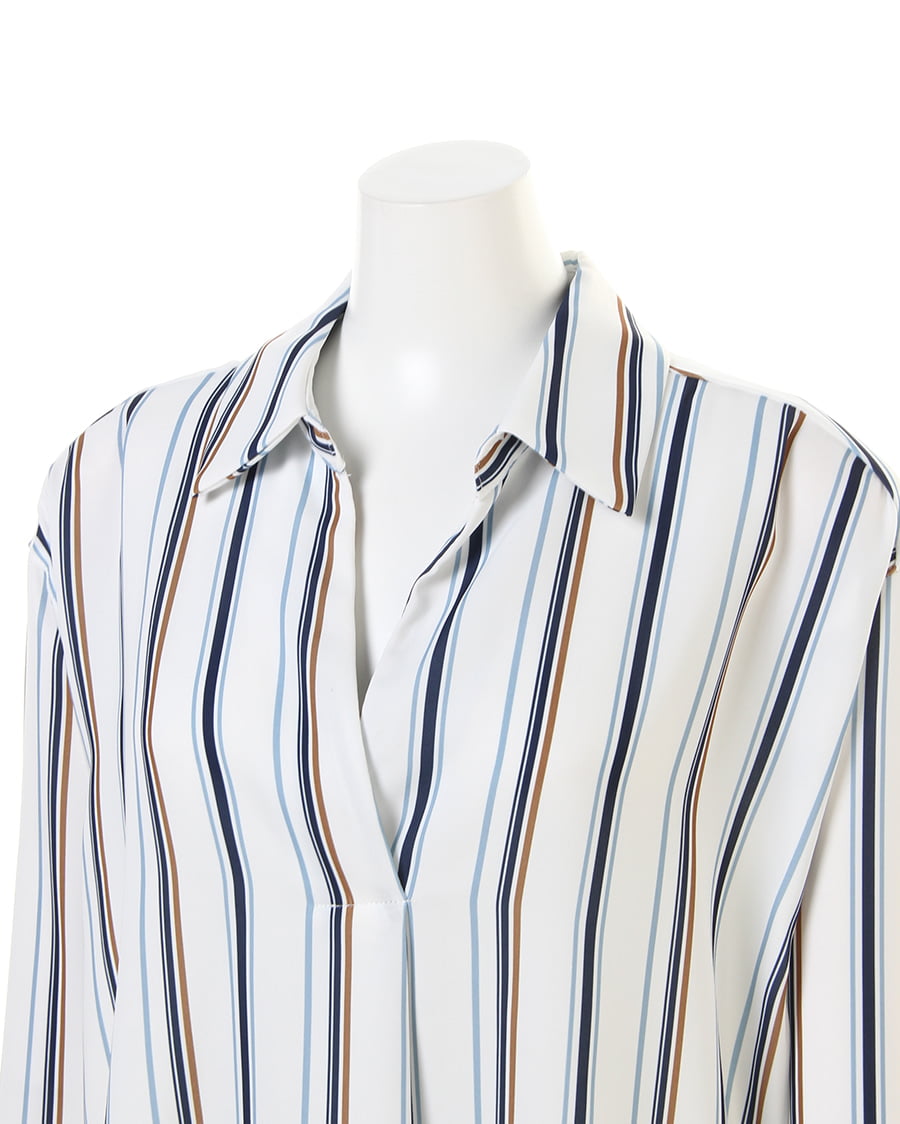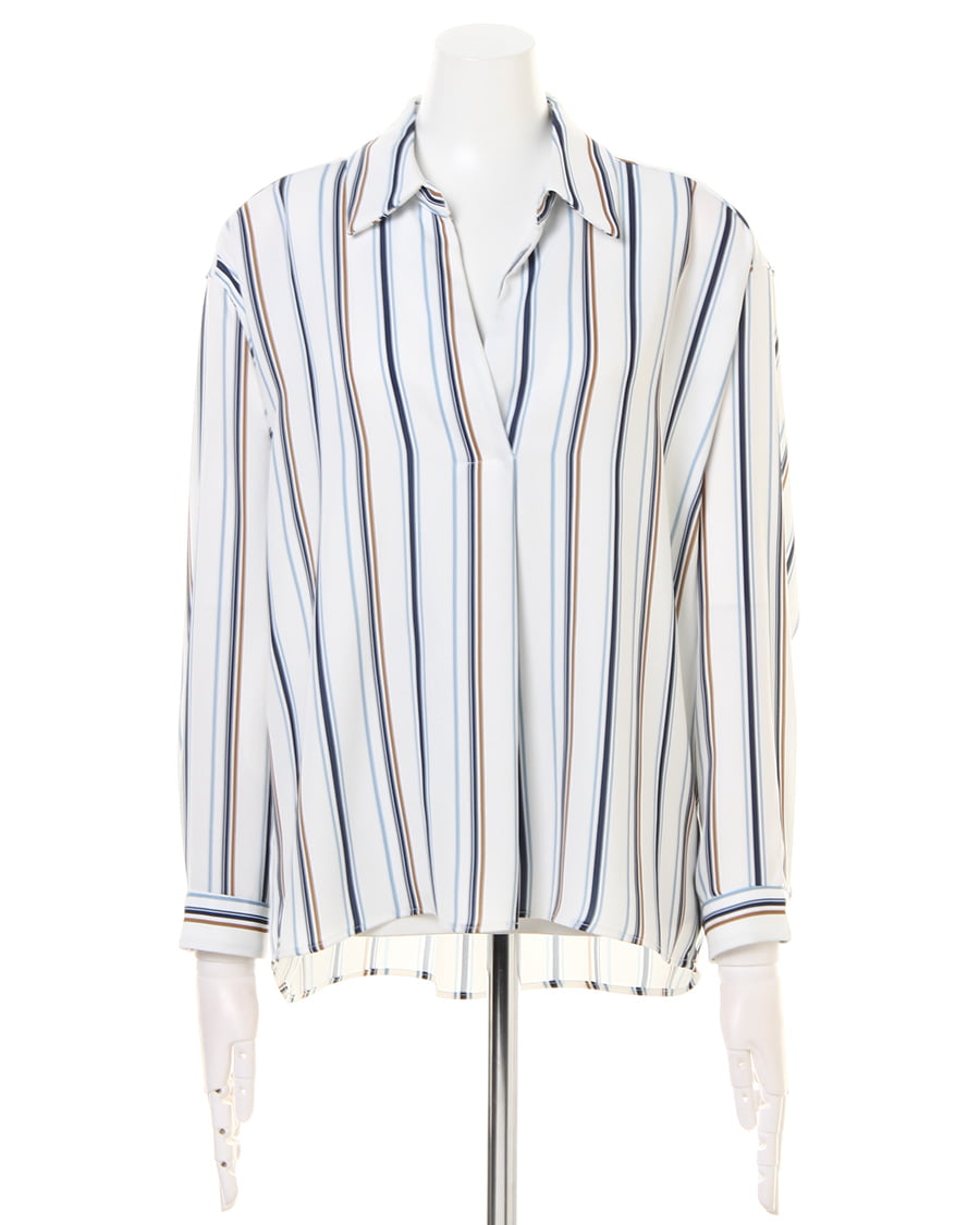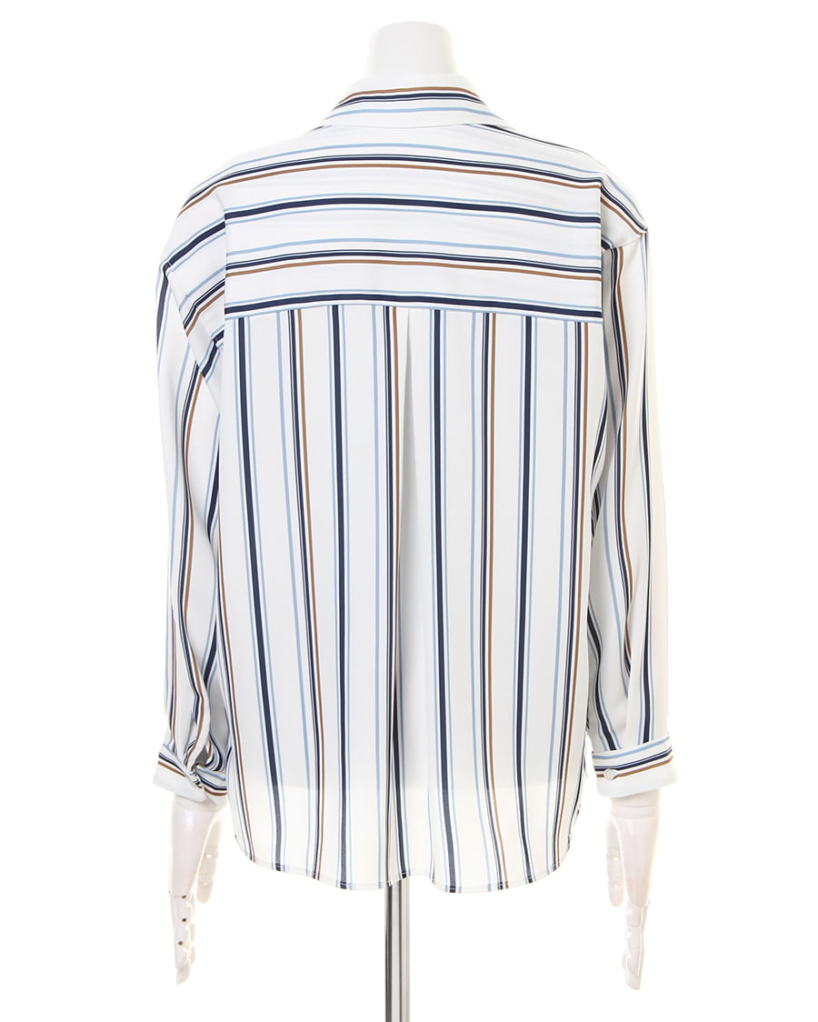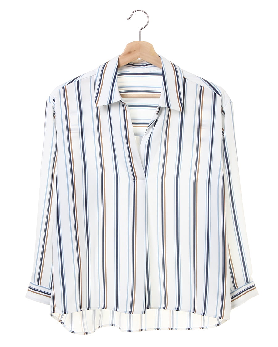 滑らかな肌触りと光沢感が女性らしい雰囲気をあおるシャツはスキッパーデザインが素敵。首元をすっきりメイク、顔周りを明るく彩りエレガントな印象に。後ろ下がりのデザインが着るだけでこなれ感をプラスします。マルチストライプの柄が1枚ではもちろん、レイヤードスタイルのアクセントにも◎。襟付きなのでオンオフ問わず使える万能アイテムです。