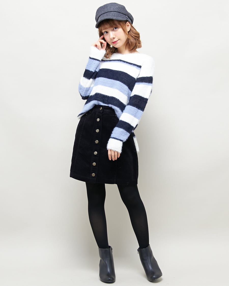 フェザーマルチボーダーニットプルオーバーとコーデュロイ前ボタン台形スカートのSET☆