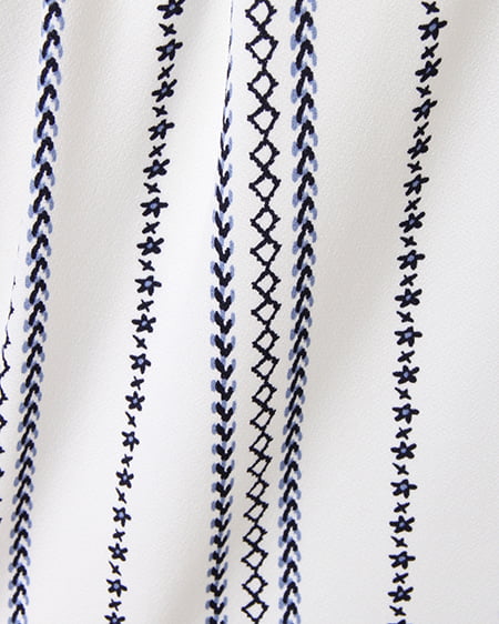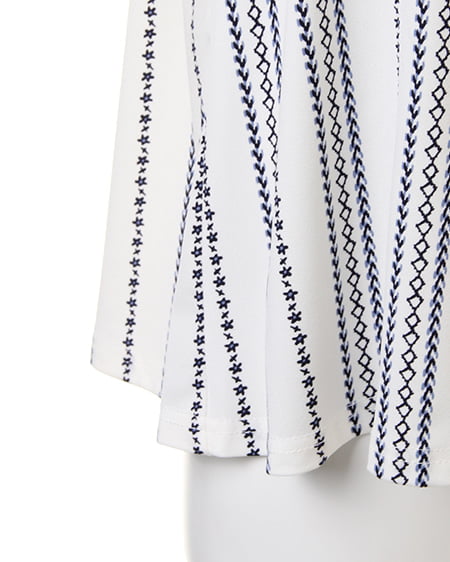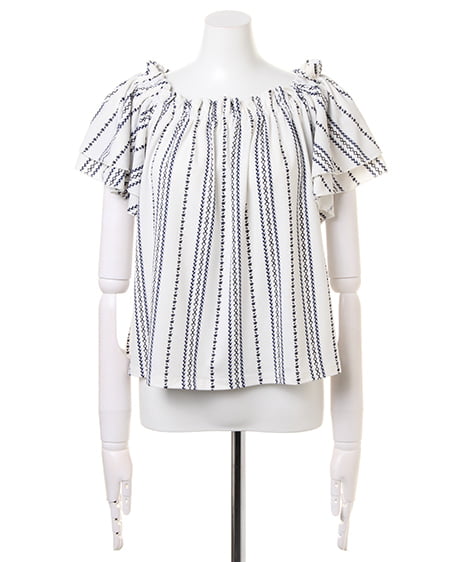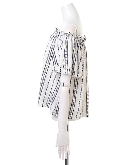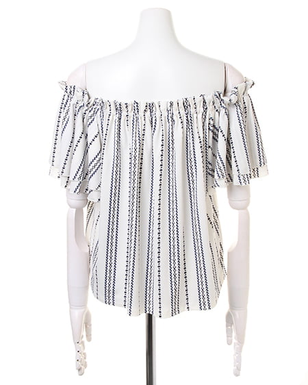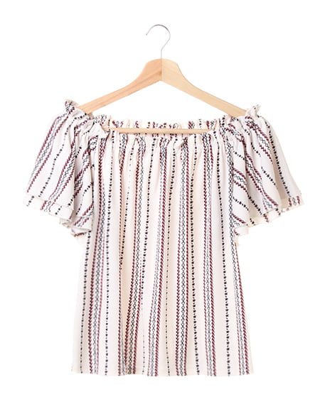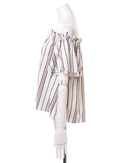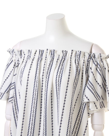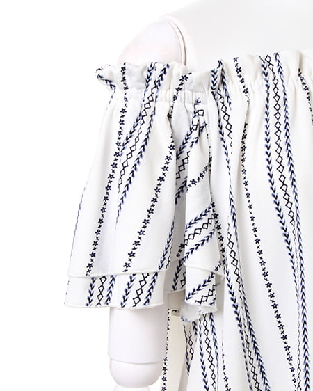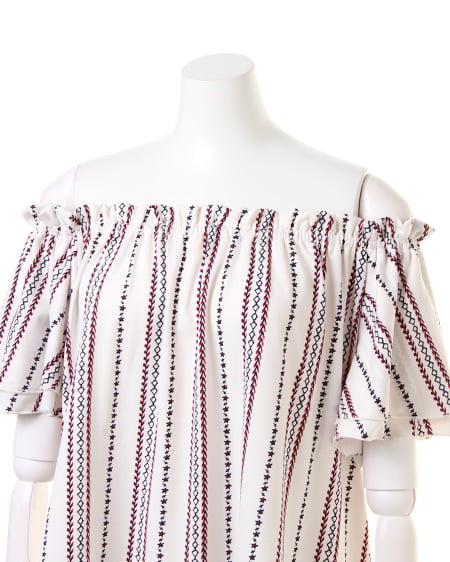襟元と袖のフリルがキュートなトップスは、伸縮性抜群で着心地にこだわった1枚。オフショル上部をフリルのように仕立てているので、立体感のある表情に。スリーブ部分は2枚仕立てでボリュームを持たせ、二の腕をすっきり見せる効果が期待できます。全体にあしらったエスニック柄が、コーディネートのアクセントに。