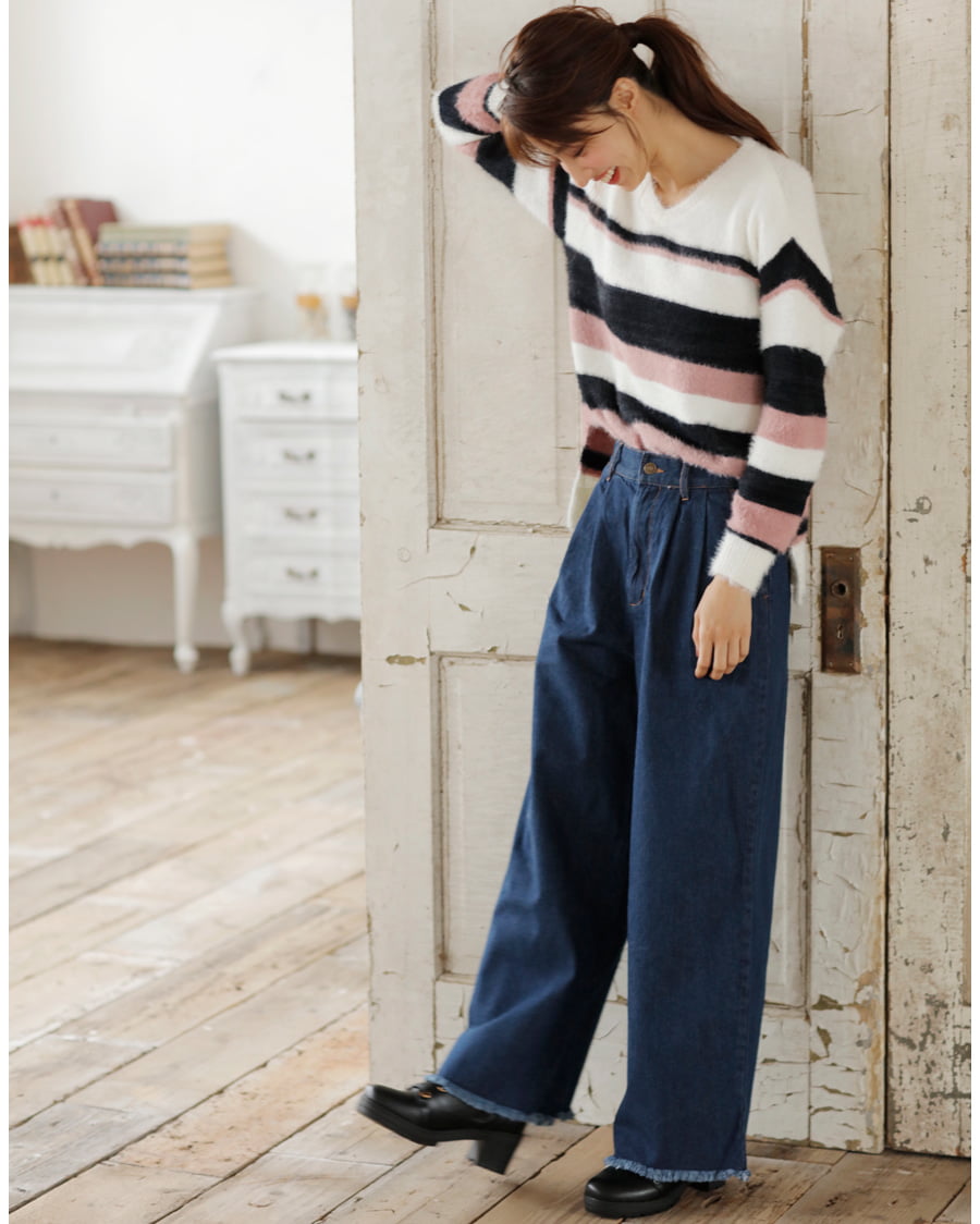 フェザーマルチボーダーニットプルオーバーとデニムタックワイドパンツのSET☆