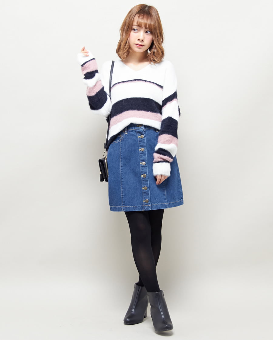 フェザーマルチボーダーニットプルオーバーと前ボタン台形スカートのSET☆