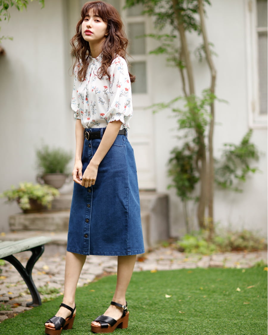 花柄ハイネック/トップスとベルト付き前ボタン/ナロースカートのSET☆