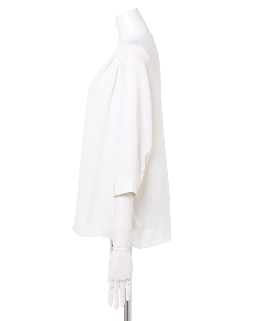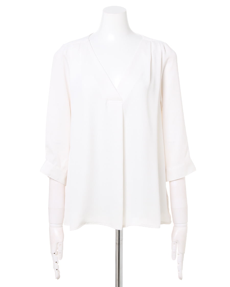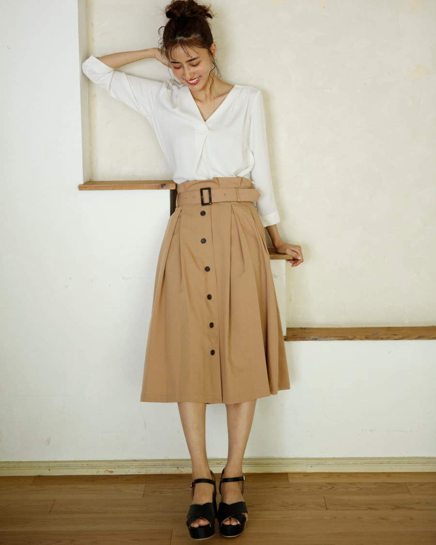トロミタックVネック7分袖ブラウスと前ボタンタックミディ/スカートのSET☆