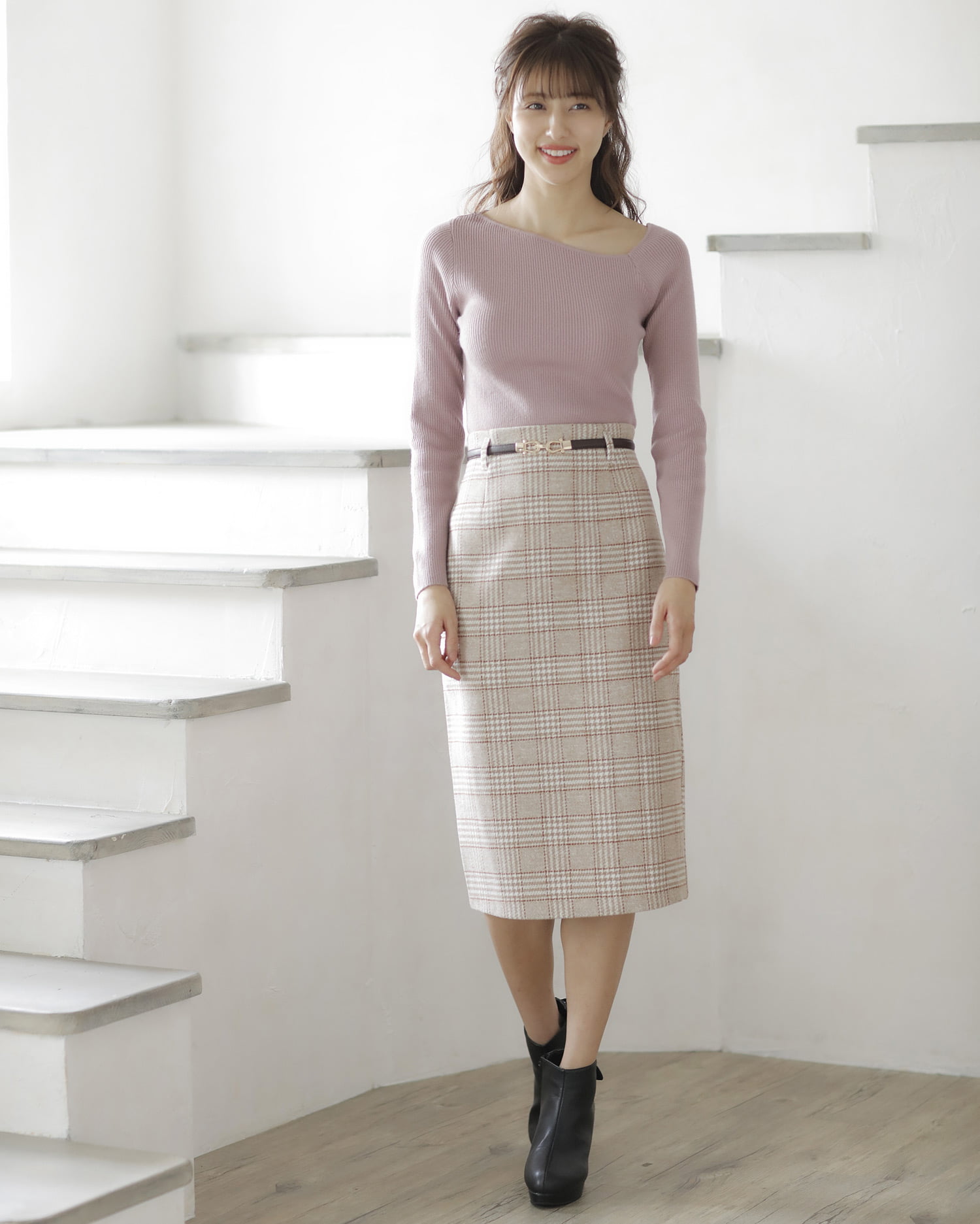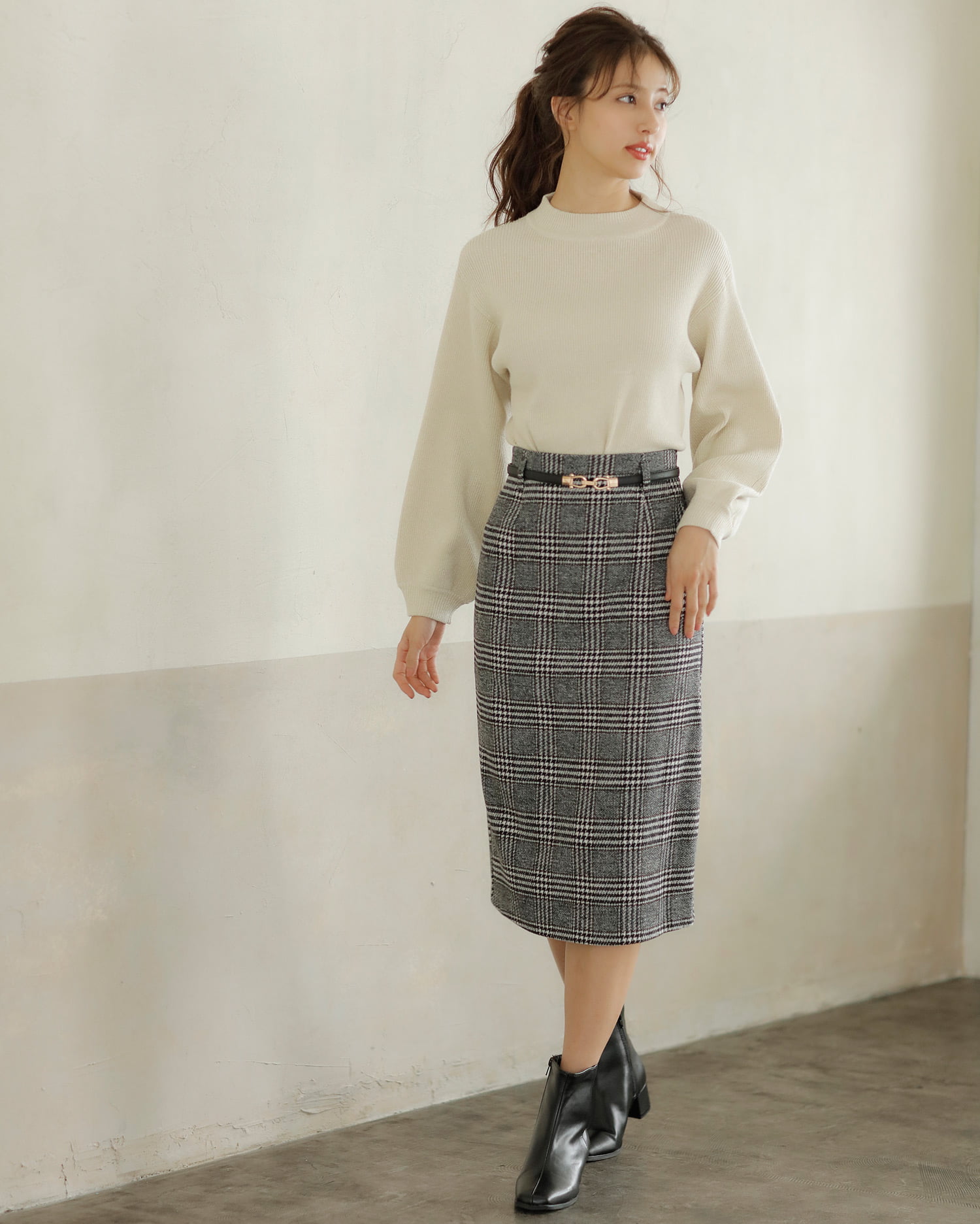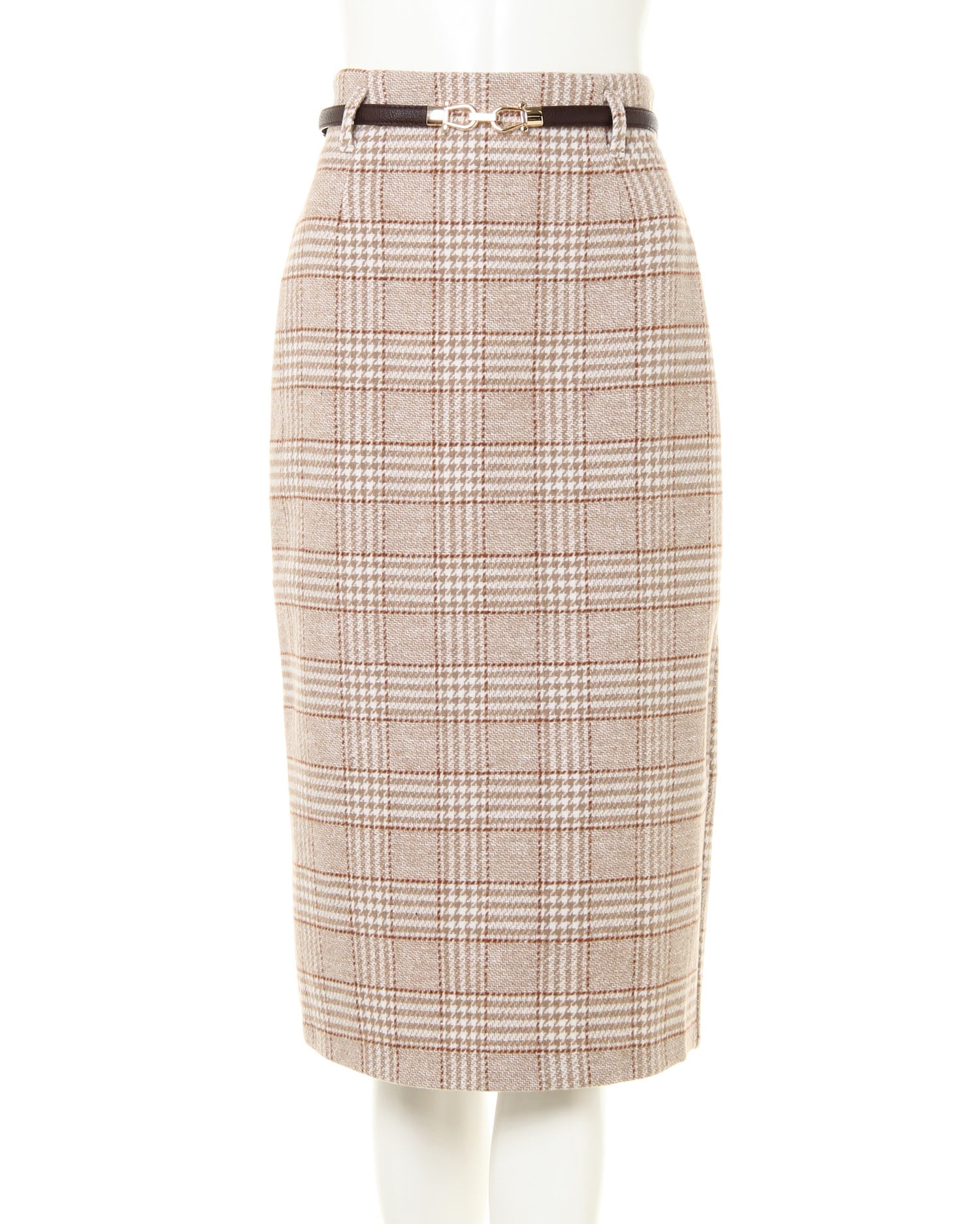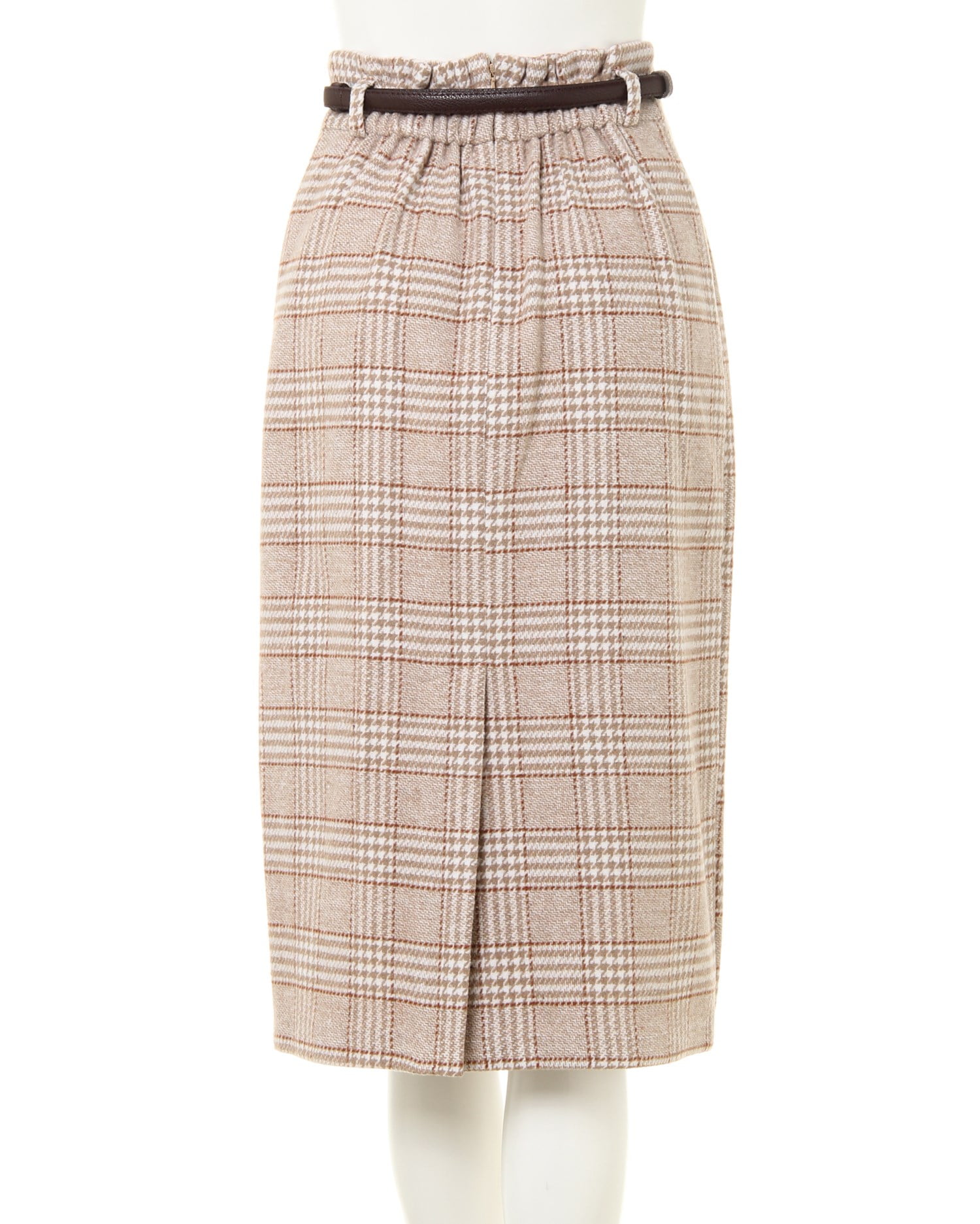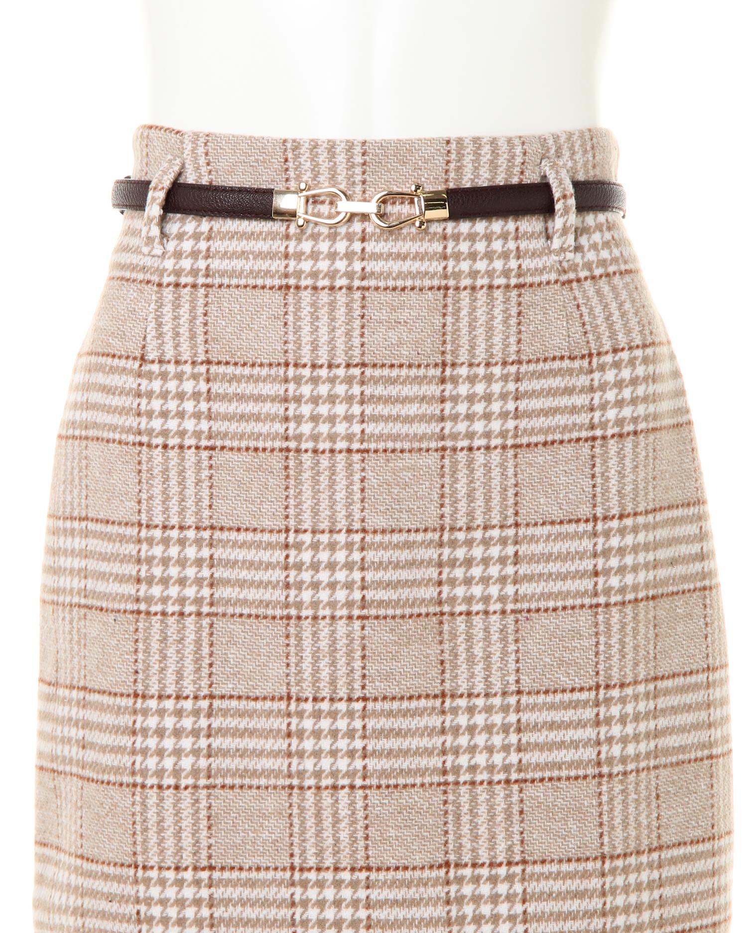 すっきりとしたタイトな美シルエットでスタイルアップ効果も期待できるナロースカート。季節感漂う微起毛のやや厚めの生地で暖か。トレンドのチェック柄はシンプルなトップスに合わせるだけこなれ感たっぷりに着こなせます。バックウエストはゴム&ファスナーで着脱も便利。ゴールドの金具が大人っぽいサッと付けられるベルトも嬉しいポイントです。