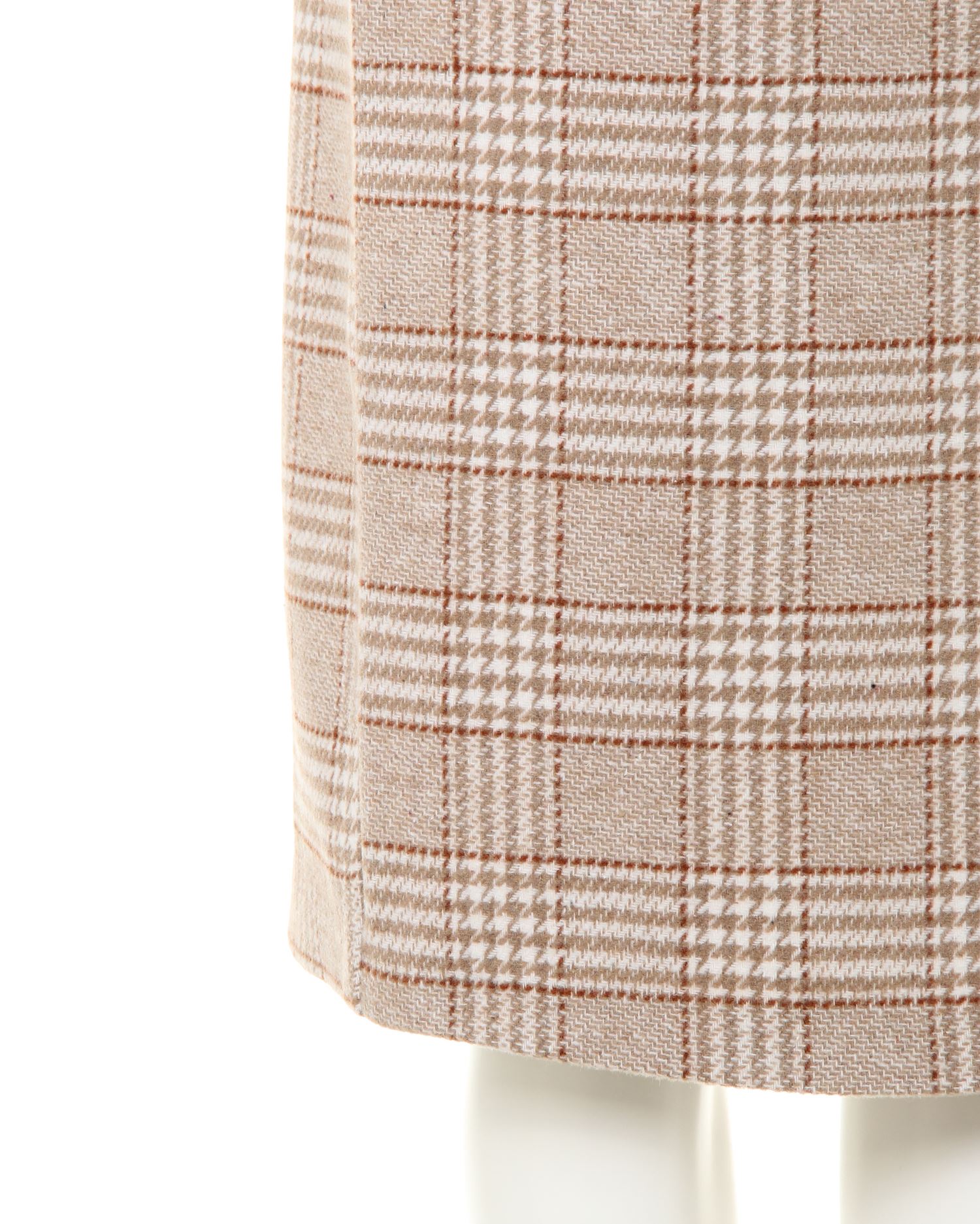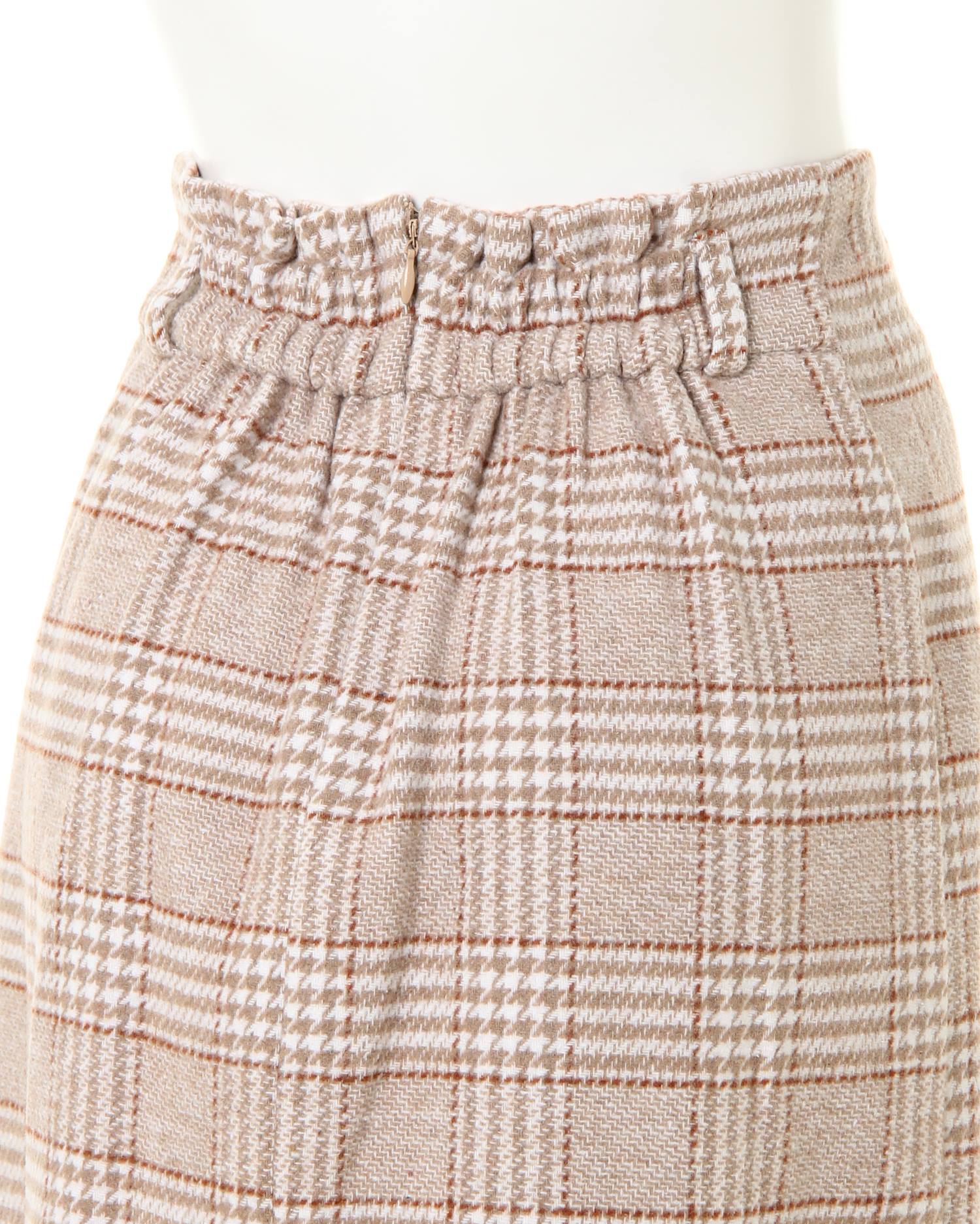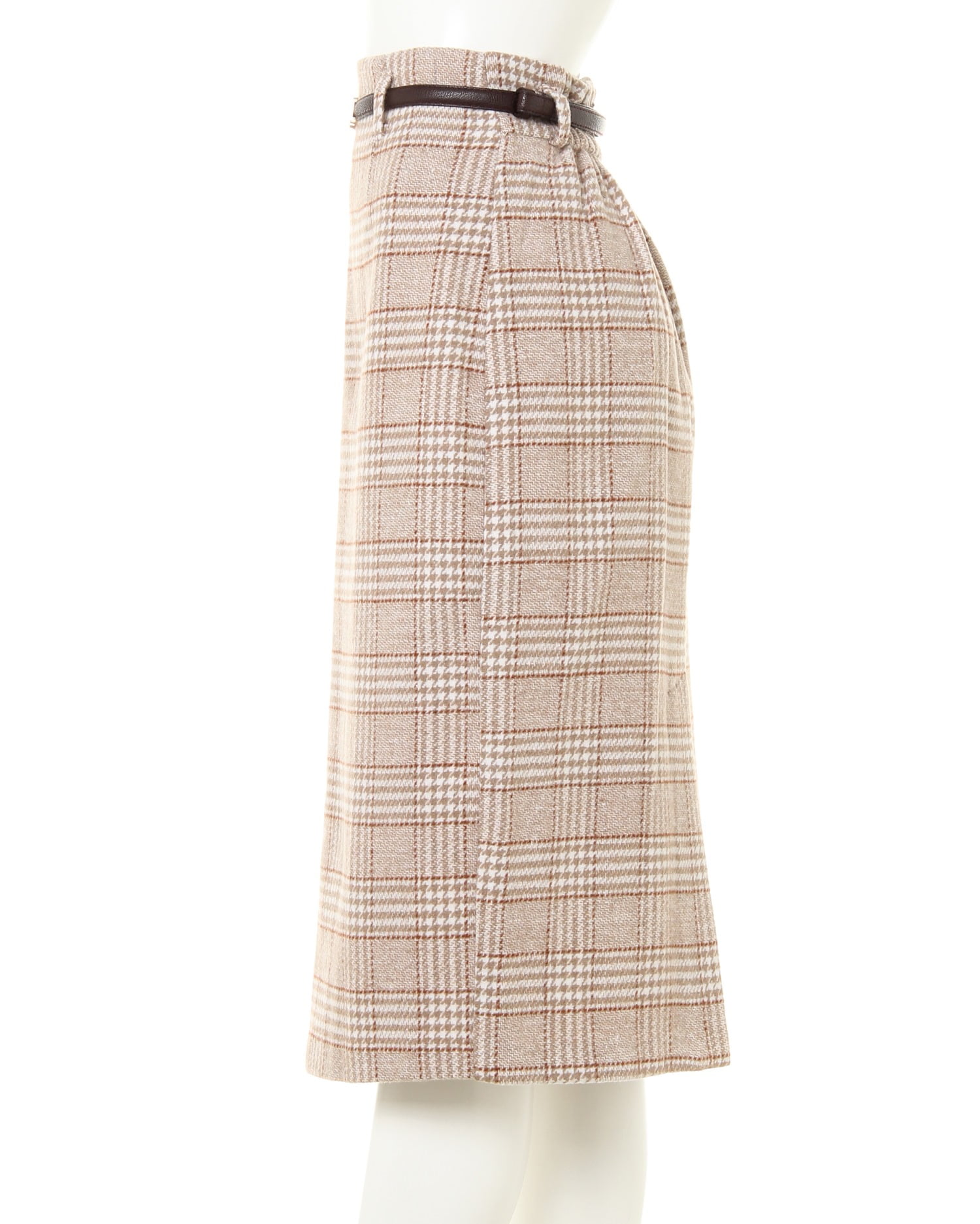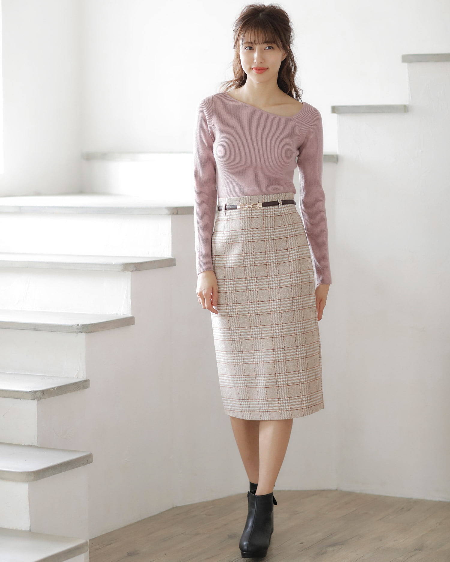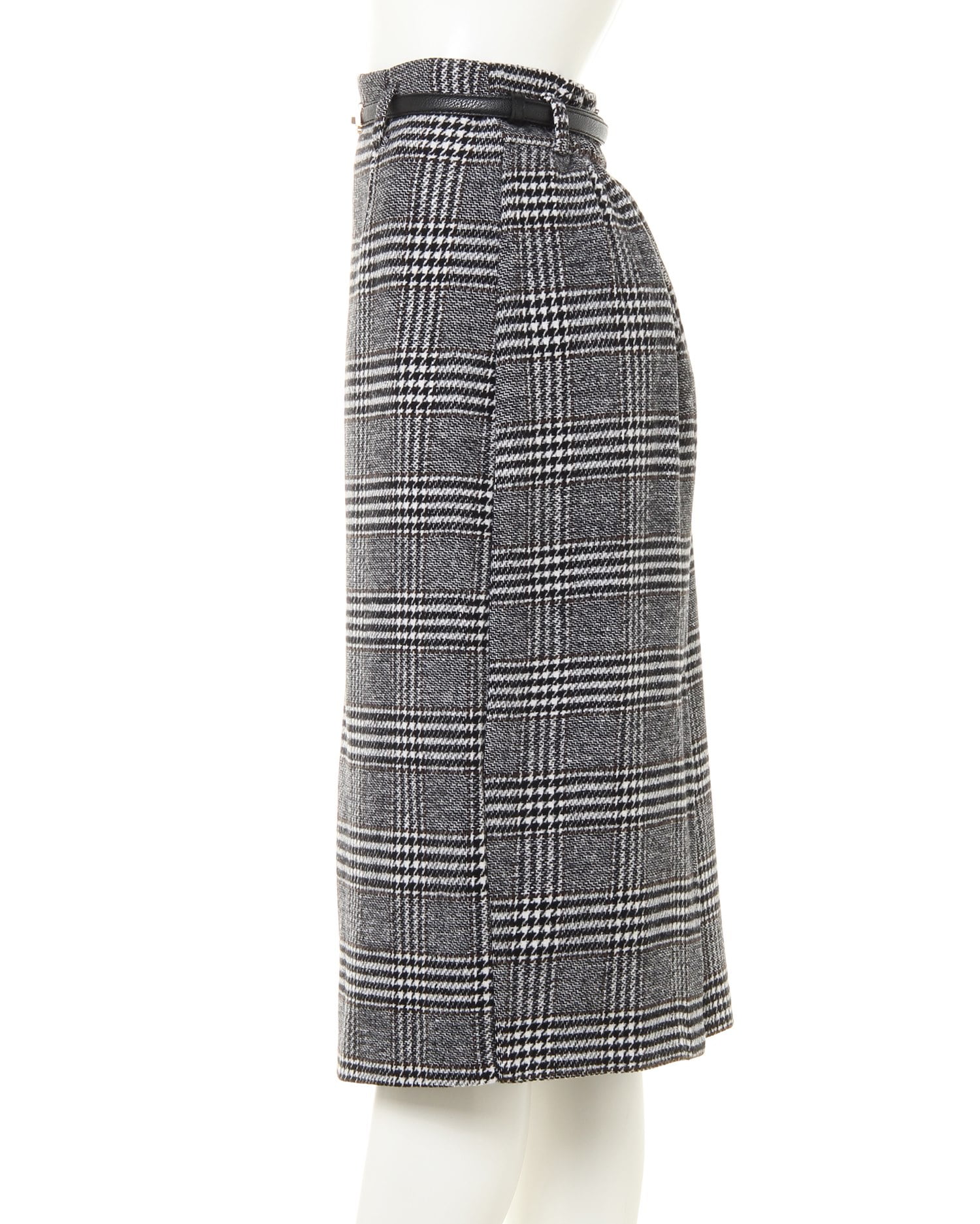 すっきりとしたタイトな美シルエットでスタイルアップ効果も期待できるナロースカート。季節感漂う微起毛のやや厚めの生地で暖か。トレンドのチェック柄はシンプルなトップスに合わせるだけこなれ感たっぷりに着こなせます。バックウエストはゴム&ファスナーで着脱も便利。ゴールドの金具が大人っぽいサッと付けられるベルトも嬉しいポイントです。