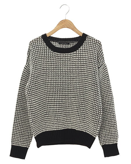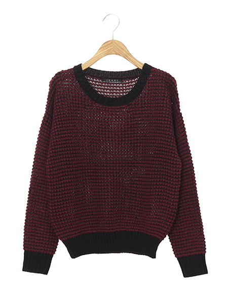 ワッフル編みのふんわり柔らかな雰囲気が女のコらしいニットトップスです。編み方を活かし、2色の糸を使用することでクラシカルな今年らしい表情に仕上がりました。縁取りの無地リブで引き締め効果。ざっくり透け感があるのでキメすぎずにまとまった今季の自信作です!ワイドめでゆったり着こなせます。シャツとのレイヤードも叶いますね。起毛感の少ないさらっとした軽めのニット素材を使用しています。