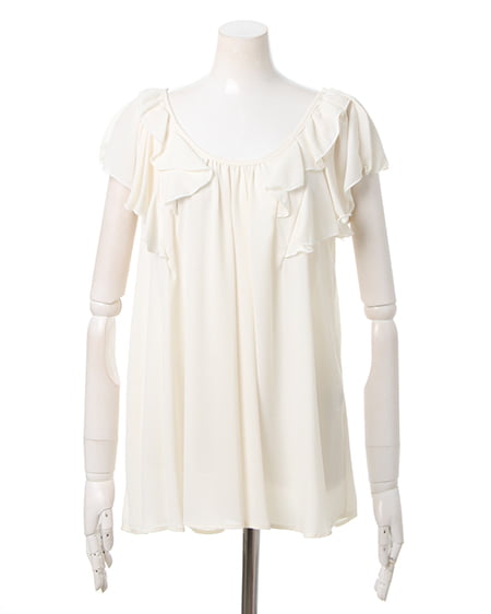 存在感のあるバタフライスリーブでひらりとガーリーが舞う!フリルジョーゼットトップスです。贅沢な生地使いでフレアーに広がったシルエットがフェミニンさと上品さを兼ね備えます。単色でシンプルなところもフリルシルエットを引き立ててくれるポイント!深めのVネックでセクシームードな背中のデザインがポイントで、華奢なリボンがついて後ろ姿からも美しい余韻を漂わせます。裏地なし。
