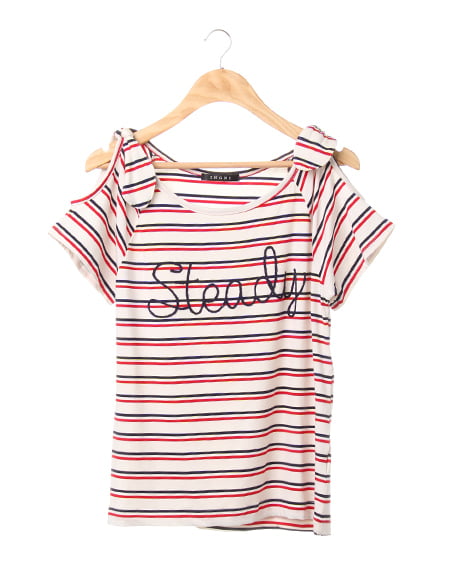 夏らし爽やかデザインで勝負。肩にリボンをあしらったキュートなデザインのトップスは、カットソー生地で着心地抜群。マリンを意識したマルチボーダー柄で季節感満点です。フロントには刺繍ロゴを施しポイントに。ゆったりめな衿元と、肩開きのデザインで程良い肌見せを演出。女性らしさをアピールできます。ショーパンやミニスカートなど、ショートボトムスとの組み合わせがオススメです。