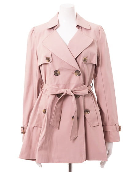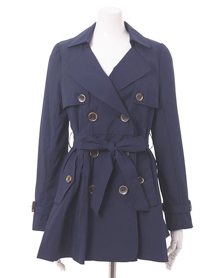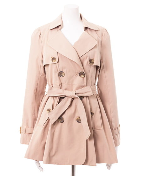定番トレンチはシルエットで小粋に魅せる!ドーリーシルエットでワンピライクに着こなしたい1着。ウエスト切替えから大胆に入れた大きなプリーツで、たっぷりボリュームをつけました。ゴールドラインが輝く、大きなマーブルボタンがさりげなくガーリーをON。ポリエステルを多く含む艶のあるファブリックが上質で、程よいハリ感と着心地の良さを確保!裏地のパステルストライプがチラッと見えた時のアピールポイント!裏地あり。