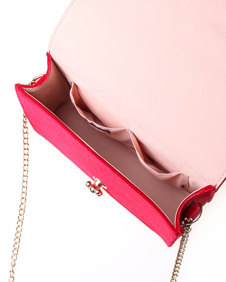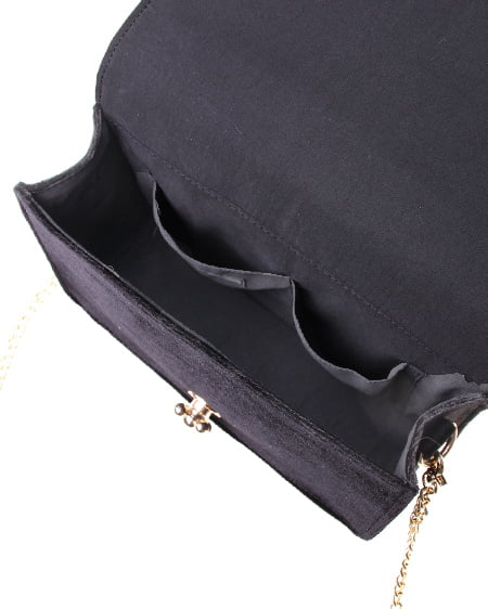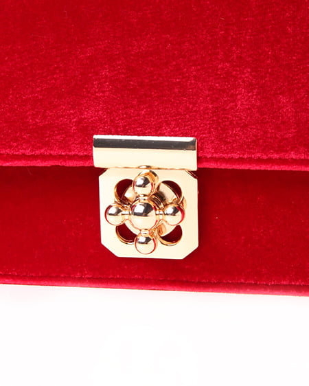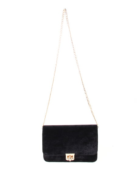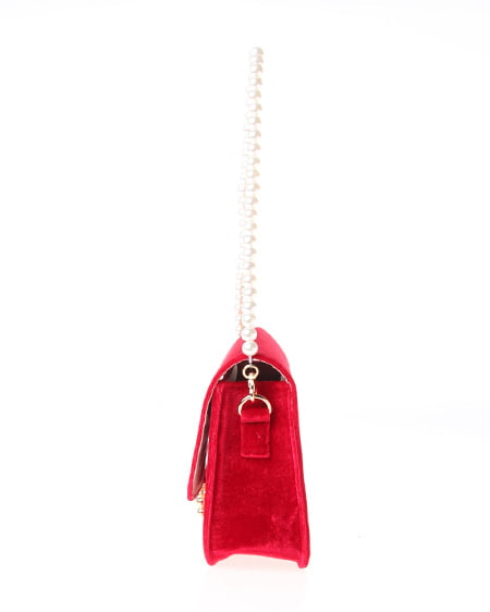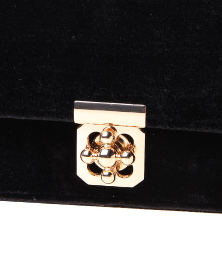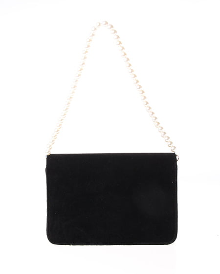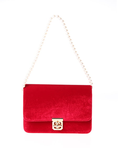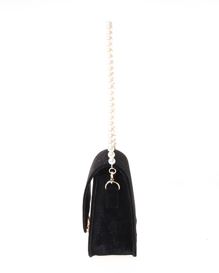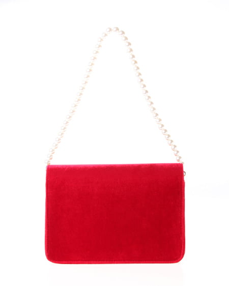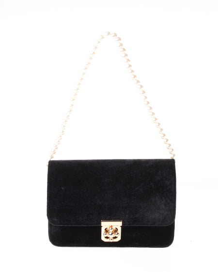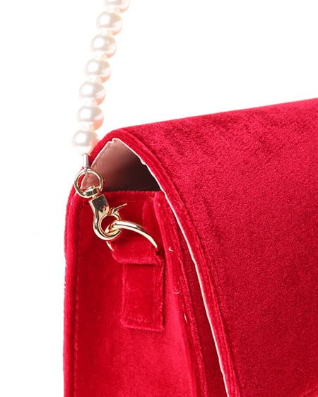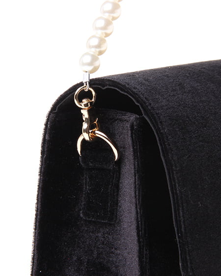 シックなデザインの大人なショルダーバッグ。かっちりとしたフラップ付のバッグはベロア調の素材でリッチな印象に。フロントにあしらったゴールドの留め具が重厚感のある表情をプラスしています。クラシカルなパールストラップは取り外しもでき長めのチェーンストラップに付け替えも可能です。ドレッシーなシーンのバッグとしてもオススメ。