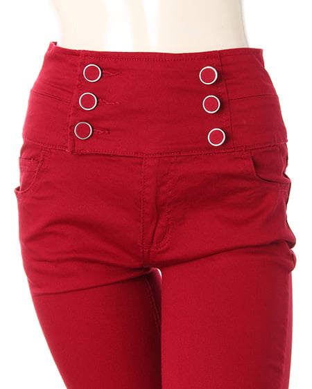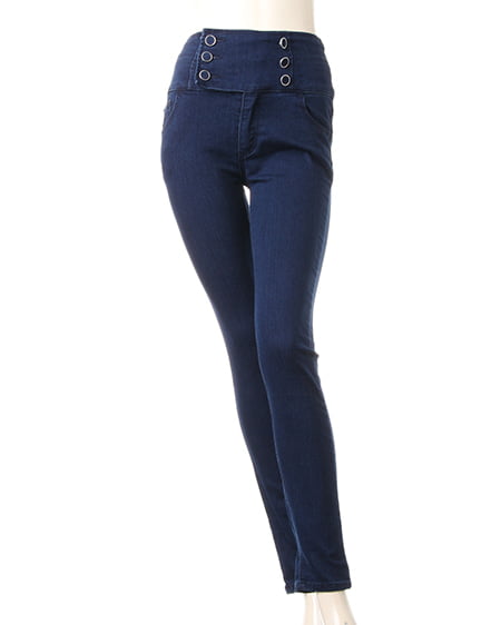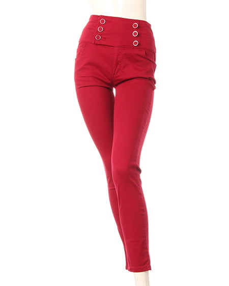 ウエストにボタンをあしらったクラシカルなスキニーパンツ。タイトなシルエットは脚をきれいに見せてくれ伸縮性のある素材で動きやすく着心地も抜群。スタイリッシュなハイウエストデザインは穿きやすくウエスト周りをしっかりカバー。トップスインもしやすくすっきりした着こなしに仕上がります。シャツやシンプルなカットソーなどを合わせたハンサムなスタイリングがオススメ。