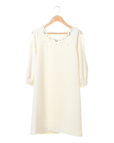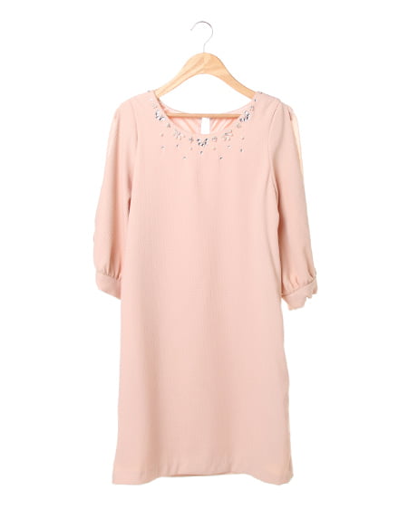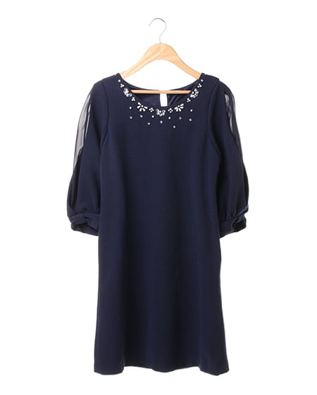 レディーに合わせたいキュートな一着。袖にリボンをあしらったフェミニンなデザインがポイントのワンピースはこだわり感のあるアイテム。身頃には表面感のある素材を使用し、袖は透け感のある素材との二枚仕立てでメリハリのある印象に仕上げました。衿元にはビジューをあしらい華やかなアクセントに。パーティーシーンにもオススメなワンピースです。