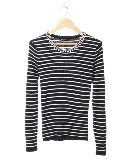 カジュアルな定番ニットをレディーに味付け。ベーシックな着こなしに欠かせないクルーネックニットは衿元にあしらったビジューがアクセントに。伸縮性のあるリブニットは着心地も良くデイリー使いに最適です。フィットするシルエットはボトムスインもしやすく、ワンピースやジャンスカのインナー使いにもオススメです。